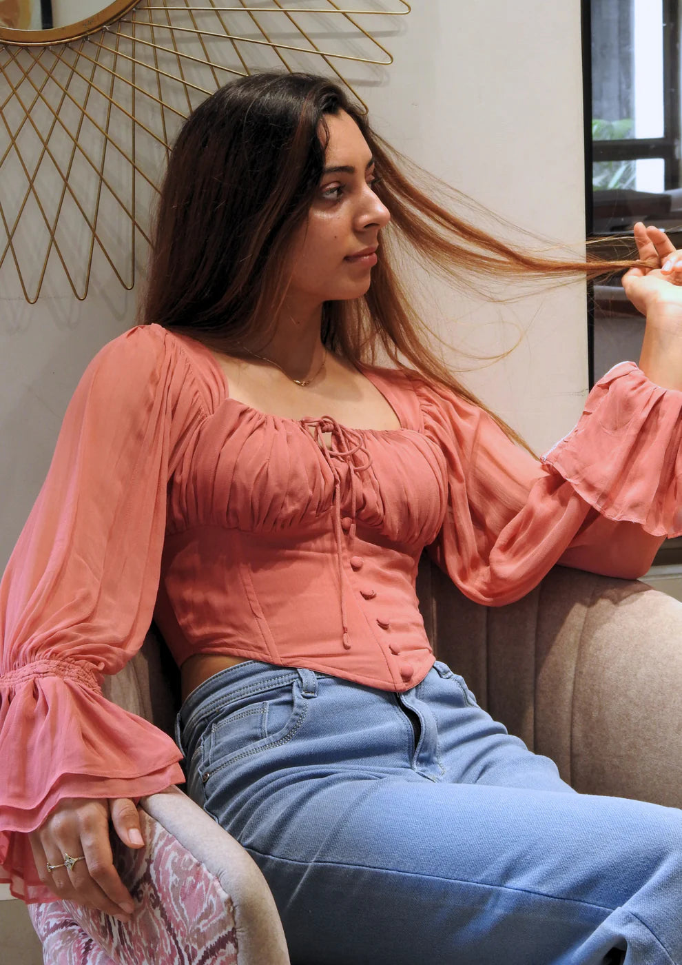 Dipped in blush and tied with a sigh — this romantic top charms with frilled sleeves, a gathered bustier, and an alluring criss-cross back.