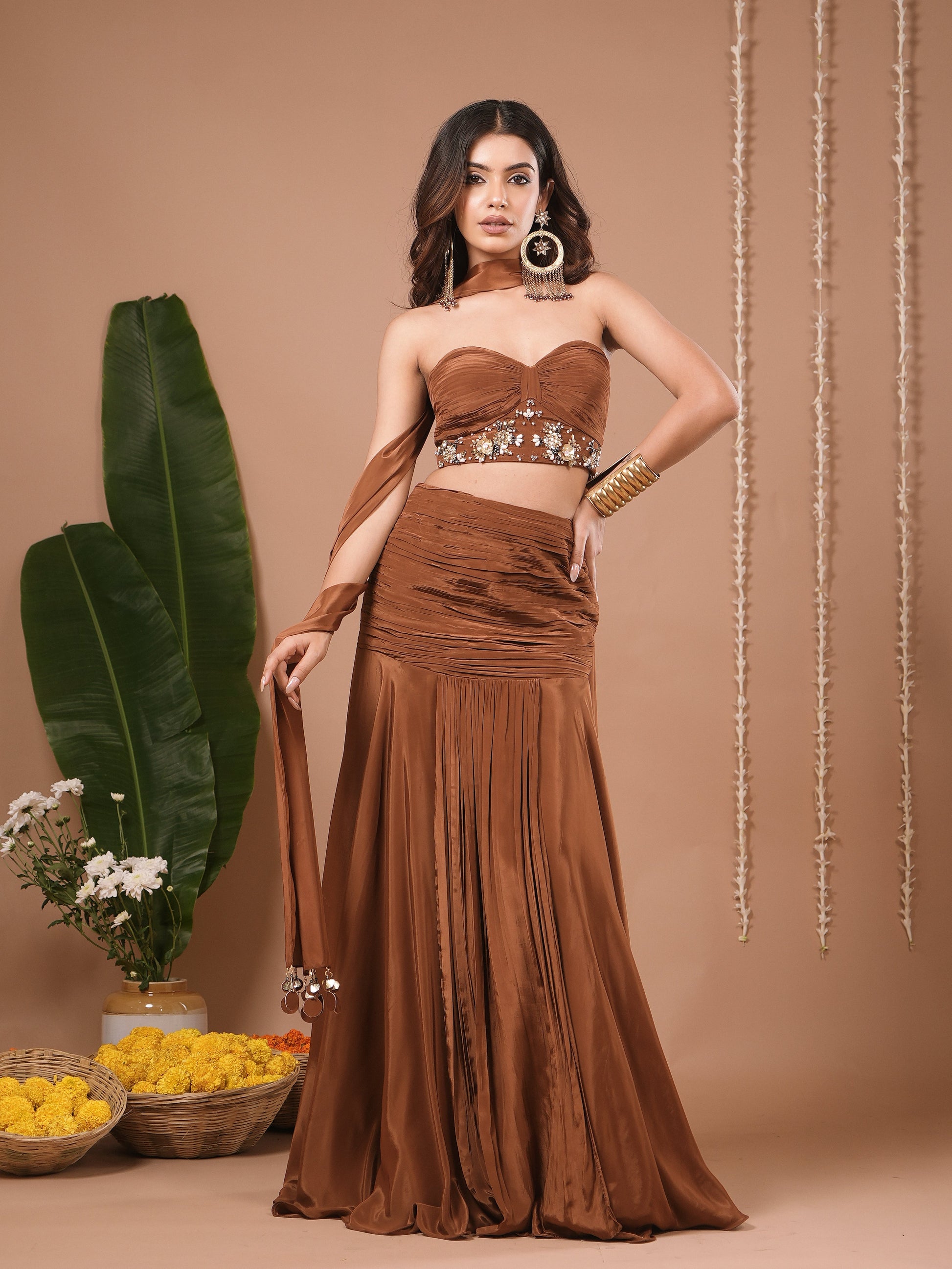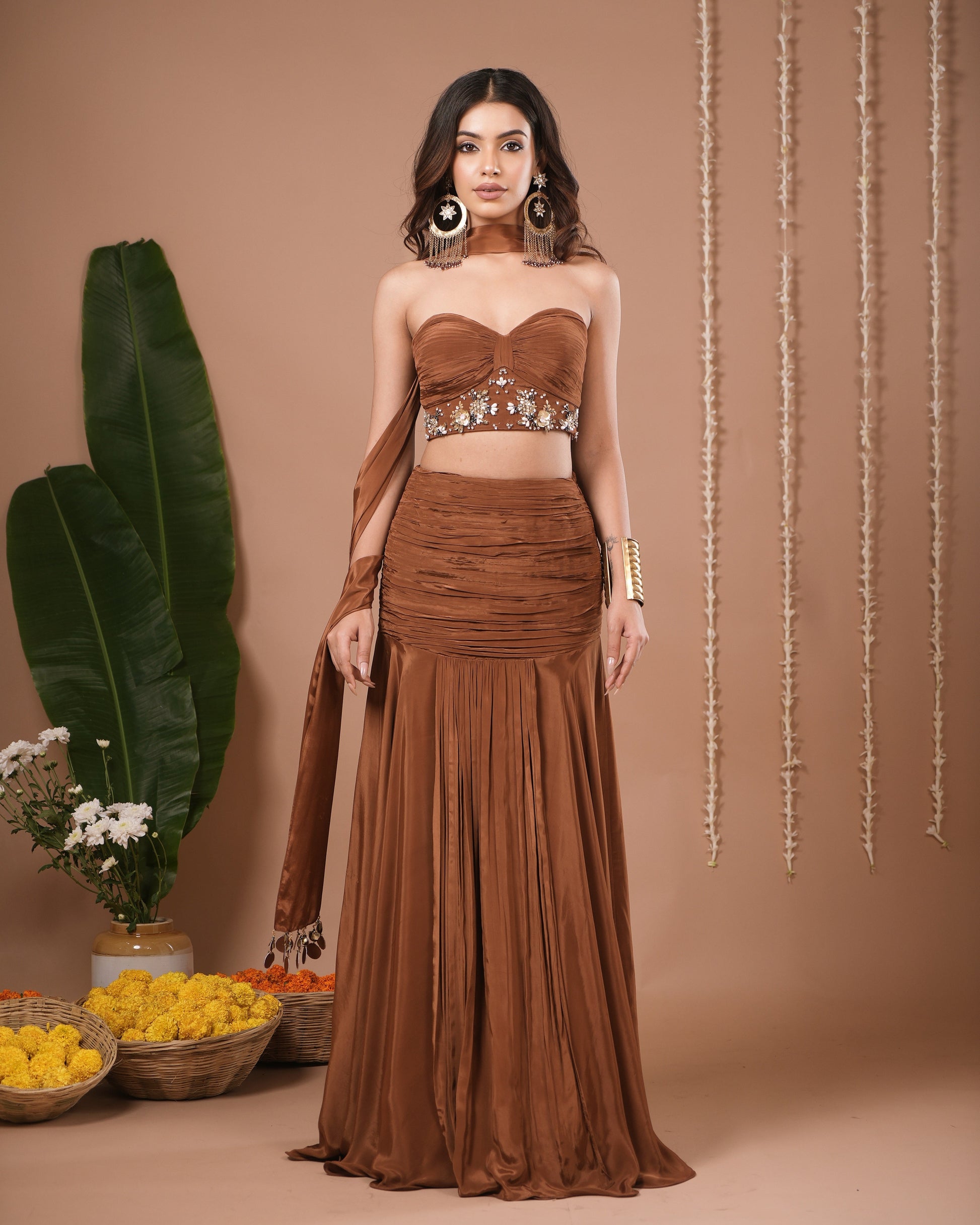 A two-piece set consisting of a strapless bustier/crop top and a high waisted flared skirt.