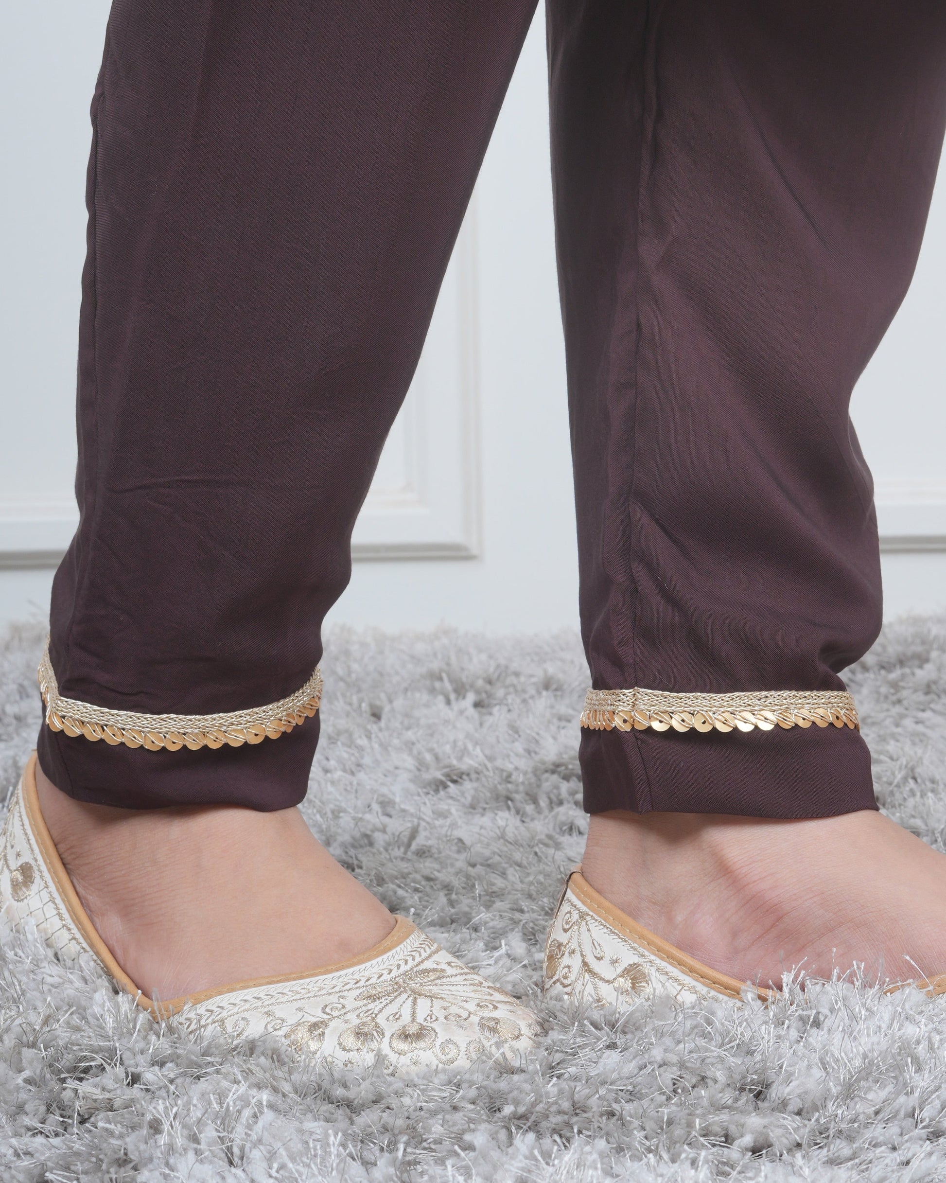 This elegant suit set is crafted in luxurious Viscose Bemberg Muslin, featuring a graceful silhouette adorned with delicate hand-finished lace. The rich fabric and timeless design make it a perfect choice for special occasions.