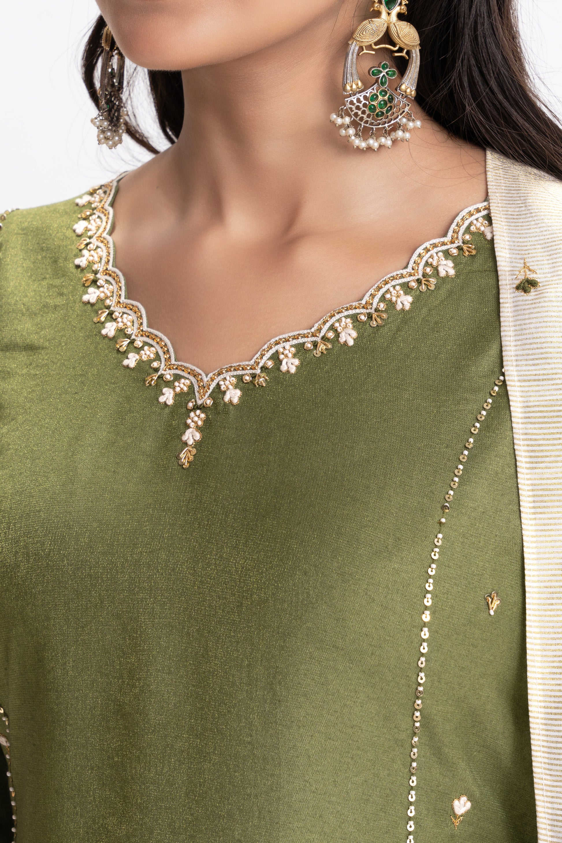 Earthy Elegance: A calming olive green kurta in a lustrous fabric, perfect for understated festive dressing.