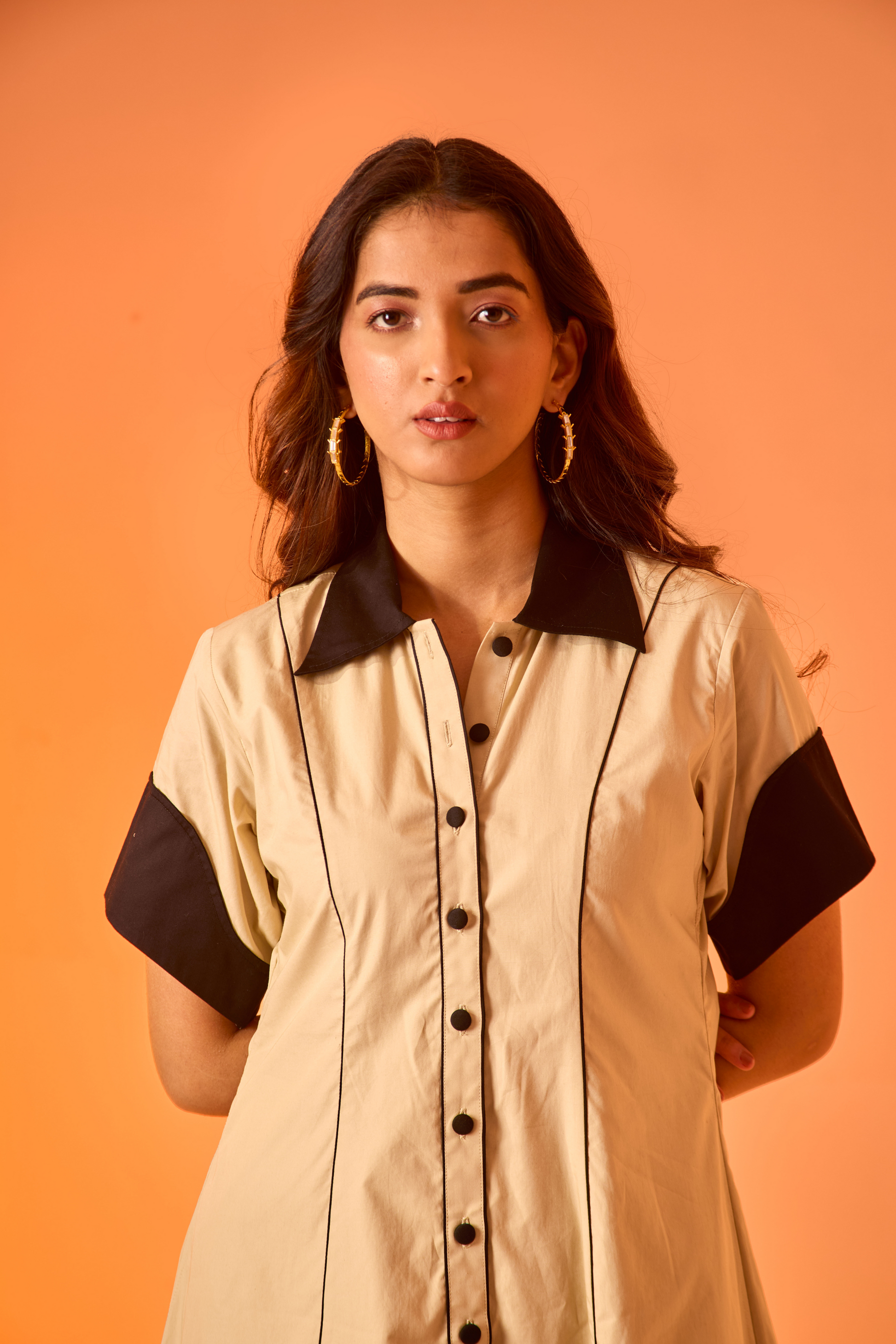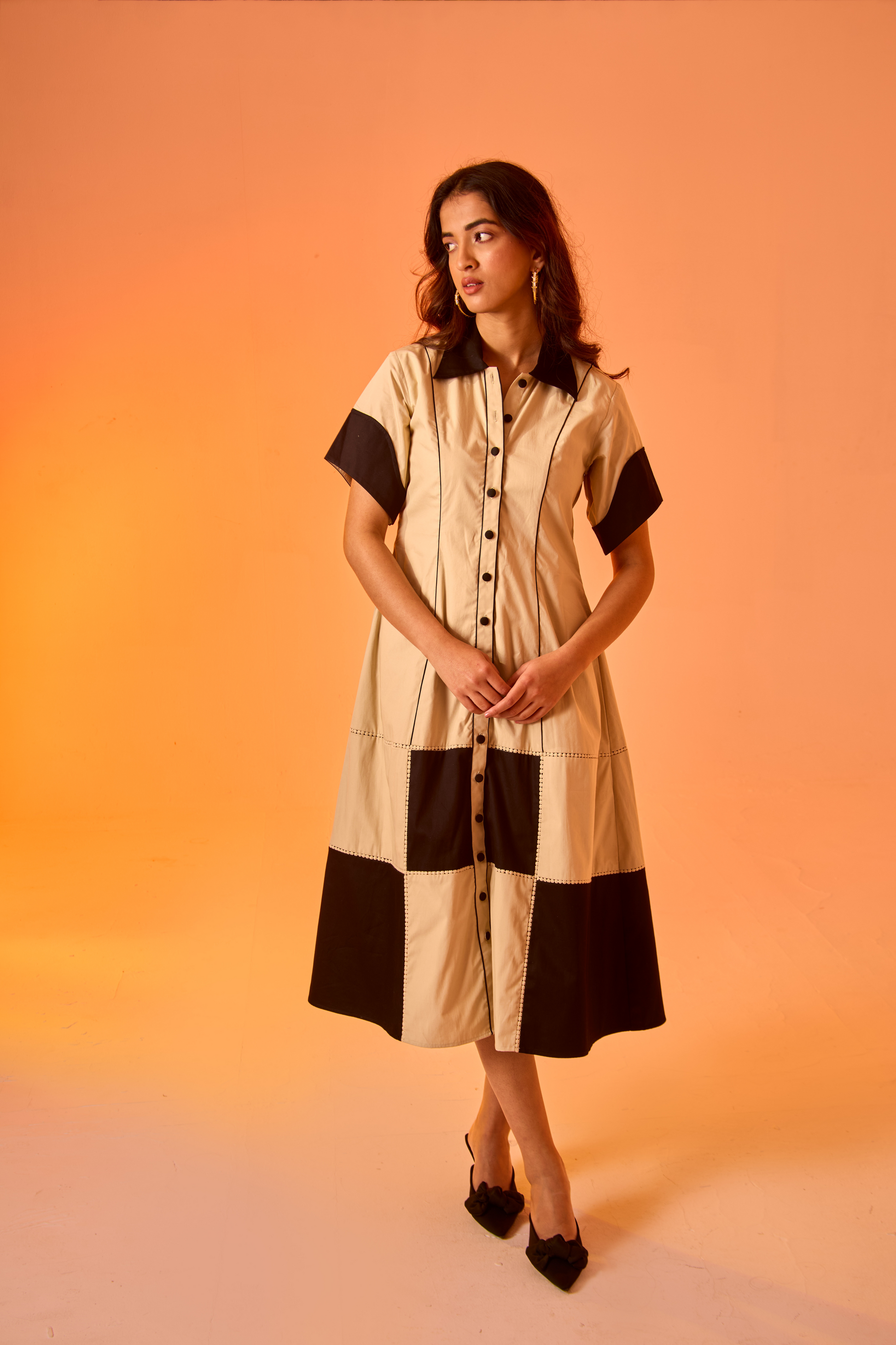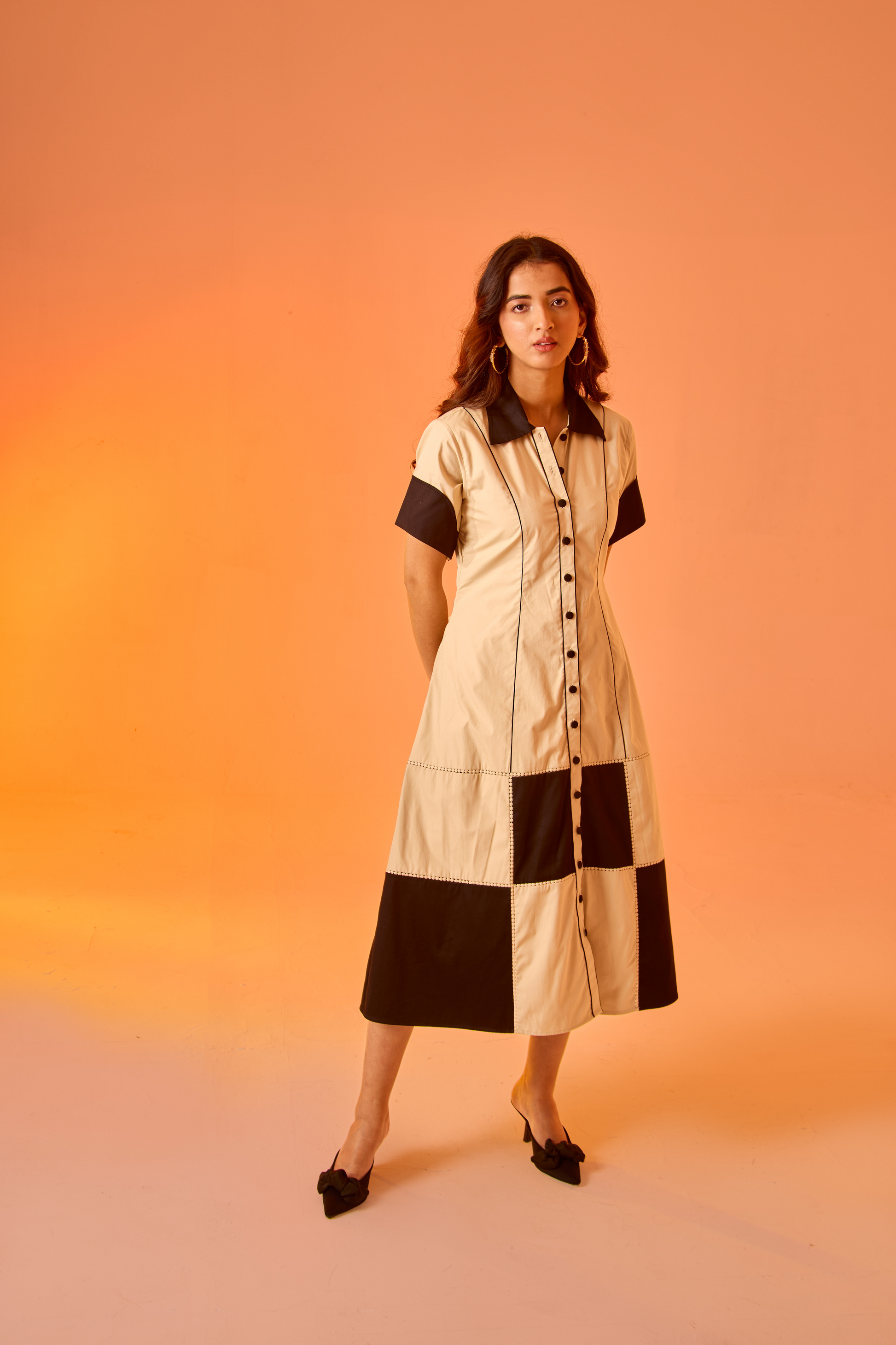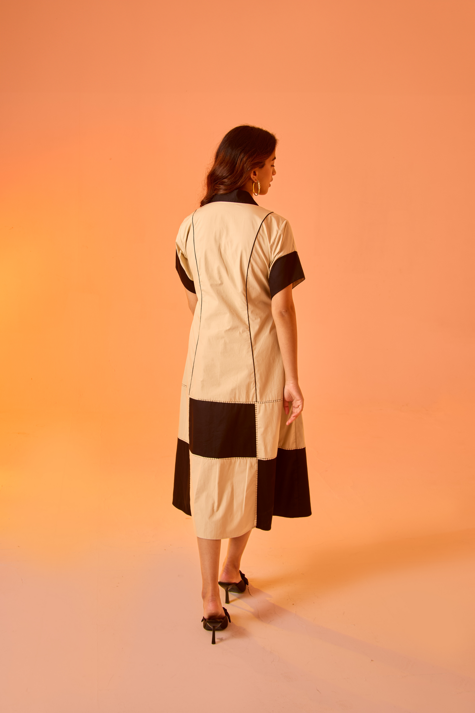 A timeless wardrobe staple, this classic color-block dress features a striking contrast at the hem and is accentuated with delicate lace inserts.