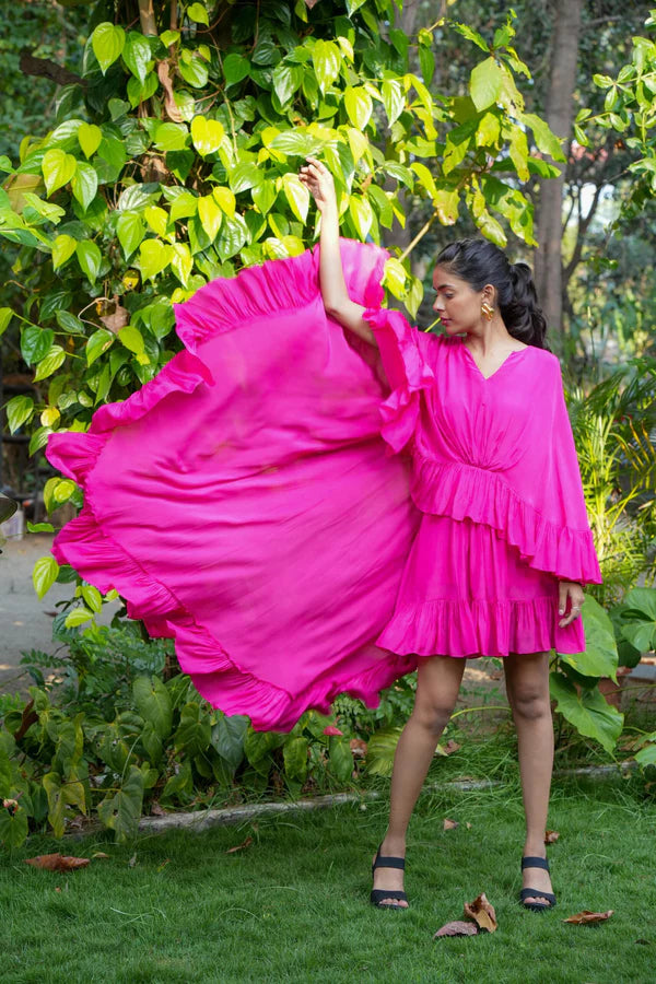 Our Chelsea Ruffle Dress features cascading ruffles that add a playful touch to the vibrant pink hue. The silhouette has a knee length dress with an outer cape attached at the waistline. The cape creates a dramatic silhouette. Perfect for making a statement at any special occasion, this dress is a celebration of bold femininity and chic style.