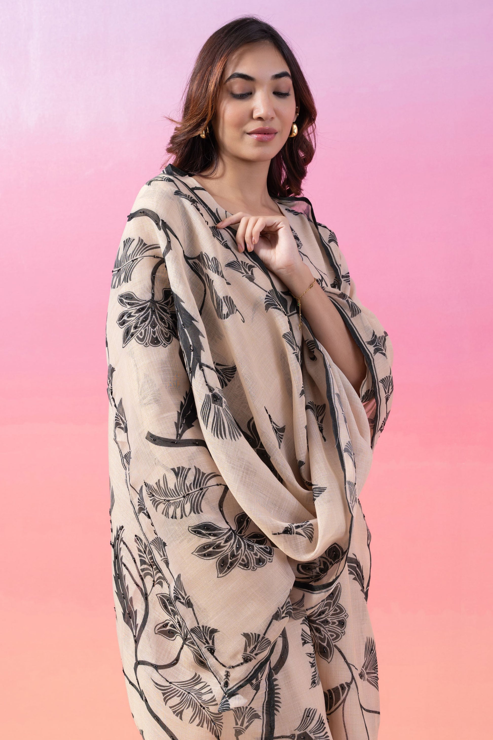 This kurta set is crafted in premium 100% linen cotton, featuring delicate beadwork and digital prints. The kurta showcases a straight silhouette with a regular fit, complemented by a plain cotton bottom and a matching digitally printed dupatta with bead embellishments. The ensemble exudes effortless elegance, making it perfect for refined everyday wear.
