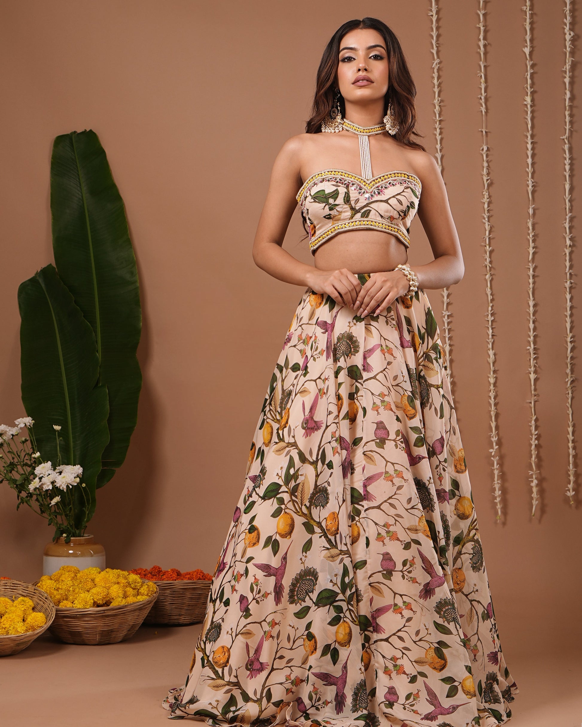 Cream Lemon Printed Indo Lehenga Set (Set of 2)