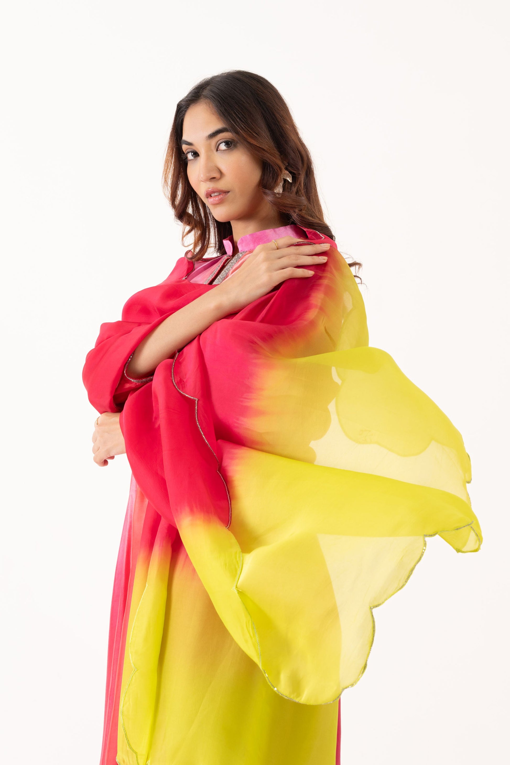 This peach kurta set is crafted from the finest Katan Silk organza, featuring delicate white thread embroidery on the yoke and sleeves. The set comes with a matching ombre dupatta adorned with subtle embroidered scallops , adding a touch of elegance to its timeless appeal.