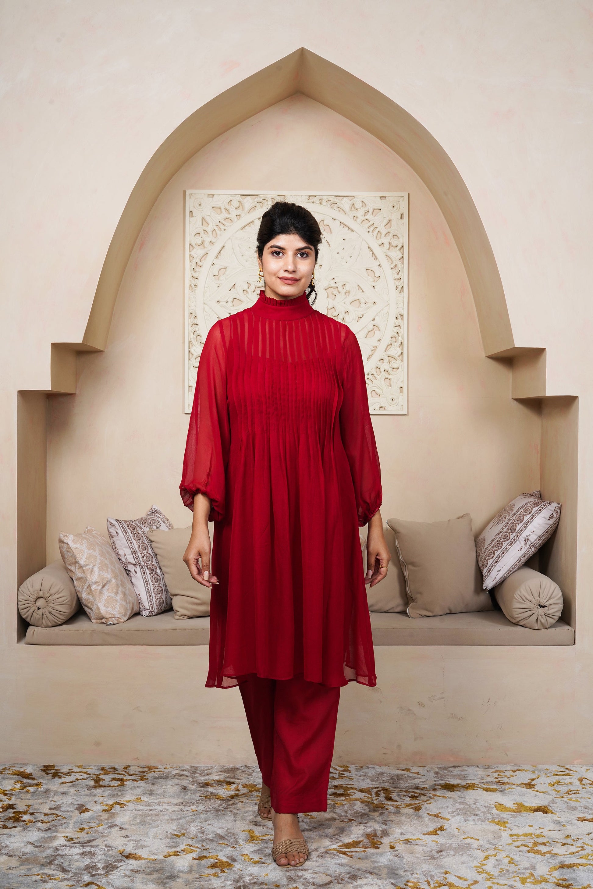 A simple elevation to your wardrobe is what you picture in our Berry red Co-ord set. Made from soft georgette, this set features a parallel pink tucks on the bodice of the top with knee length flare and closed neck with opening in the back. Adding a touch of romance are these balloon sleeves and comfortable straight wide leg pants.
