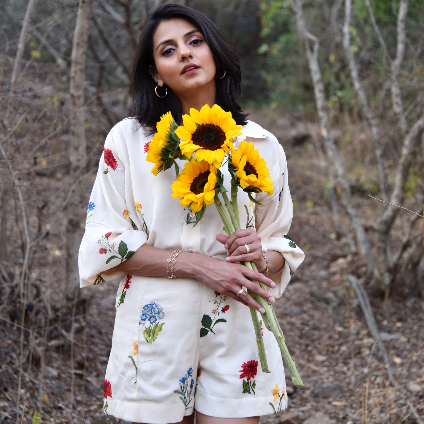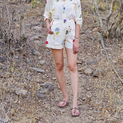 Introducing our delightful cream floral printed shorts. The high-waisted shorts, this set exudes effortless sophistication. The shorts kali’s on both sides giving a good fit to the body. Comes with pocket on one sides, combining practicality with style.