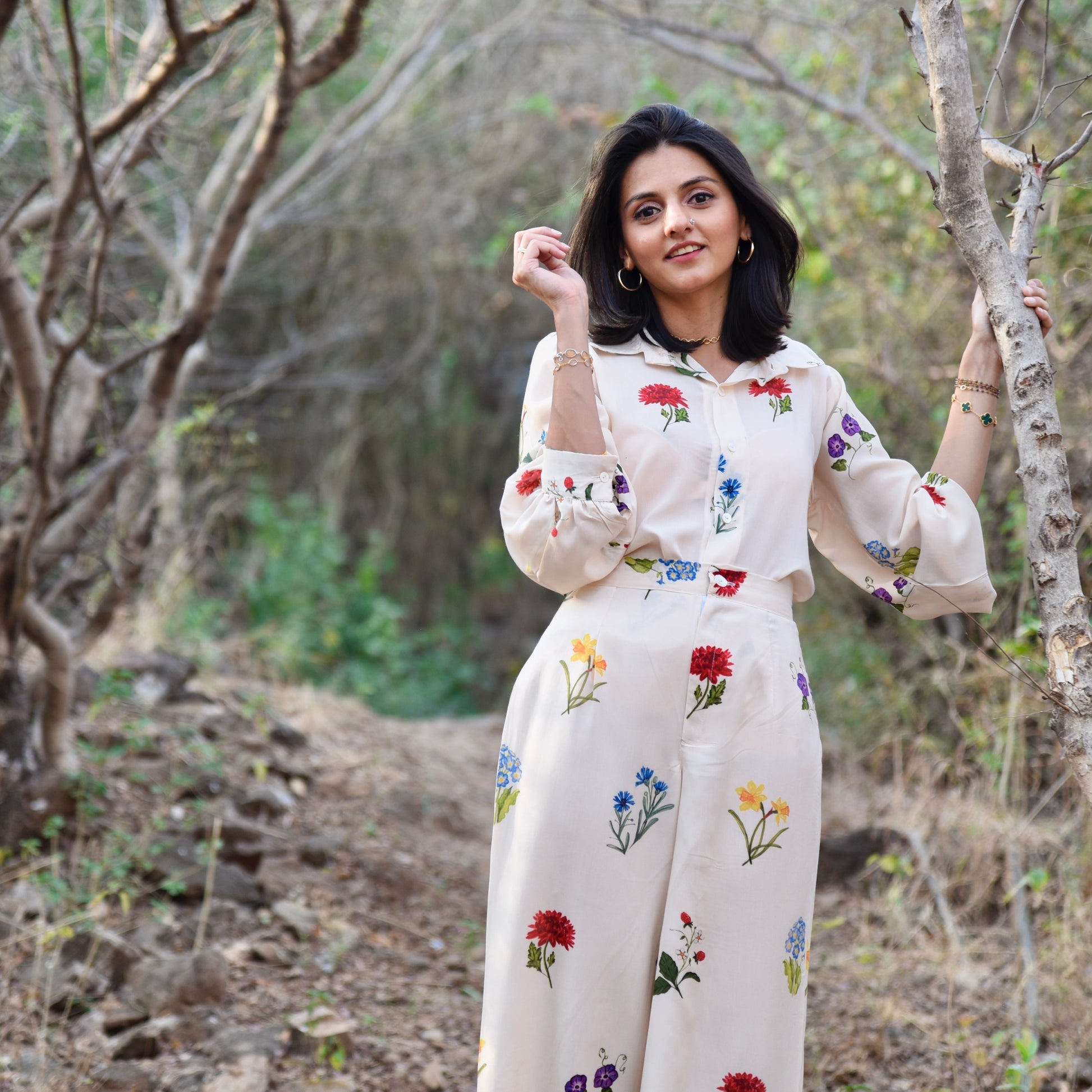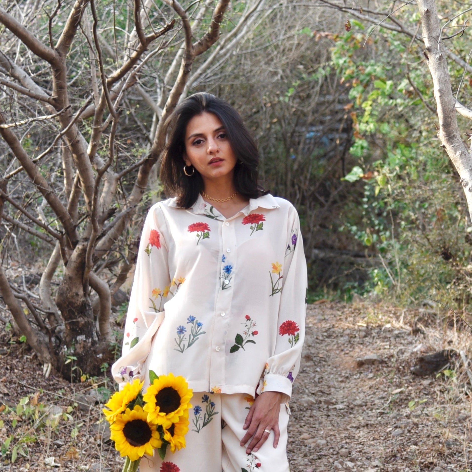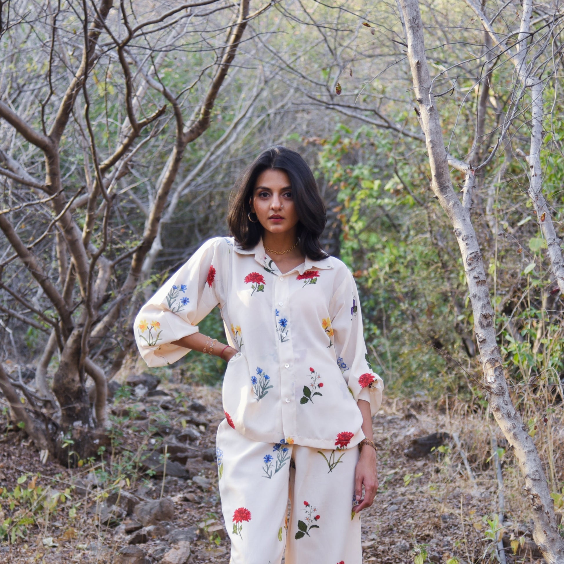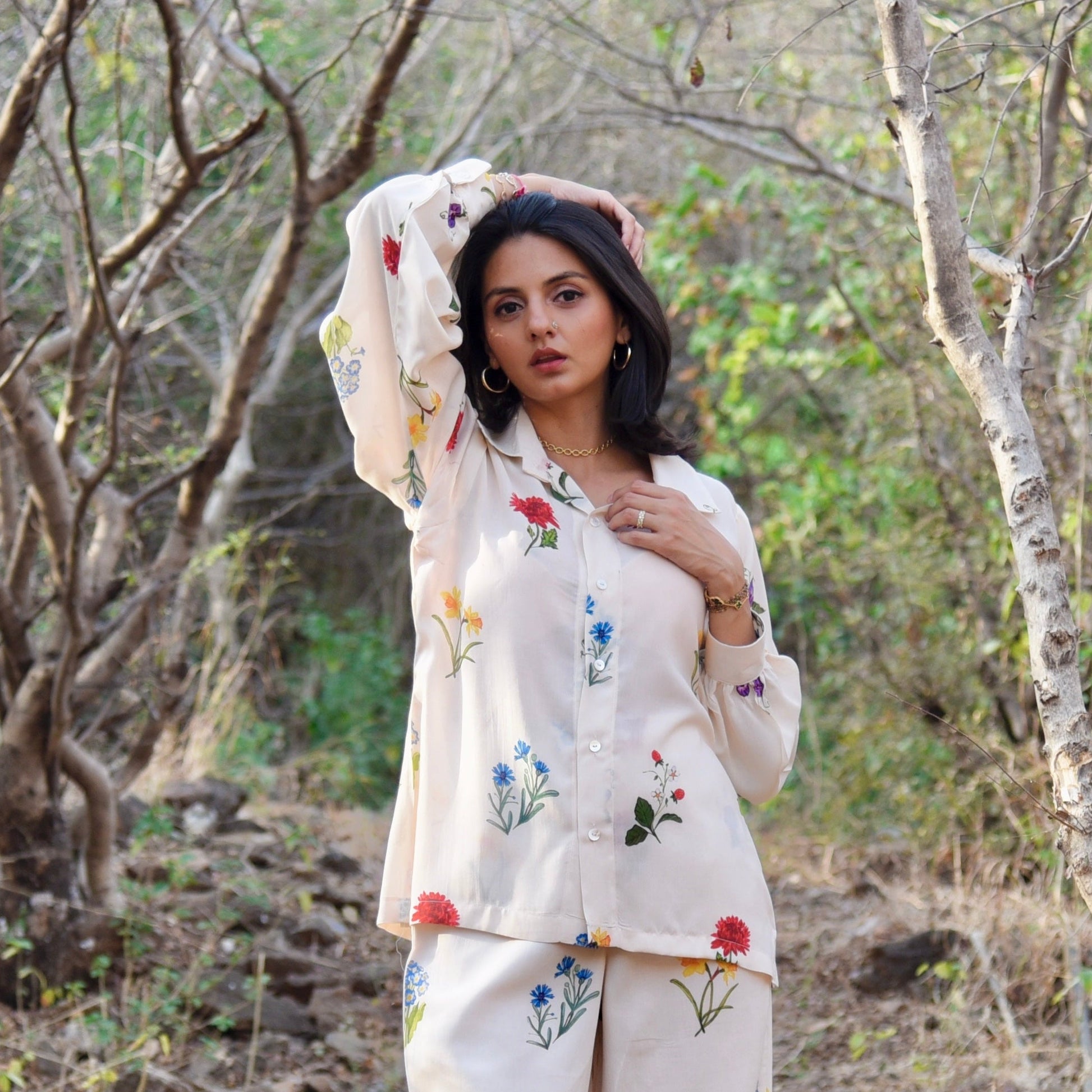 Discover the Daffodil Shirt in cream, adorned with enchanting flower motifs. The straight shirt has puffed sleeves with ruffles at the end. Designed for both comfort and style, the set effortlessly transitions from casual daywear to an elegant evening outfit.