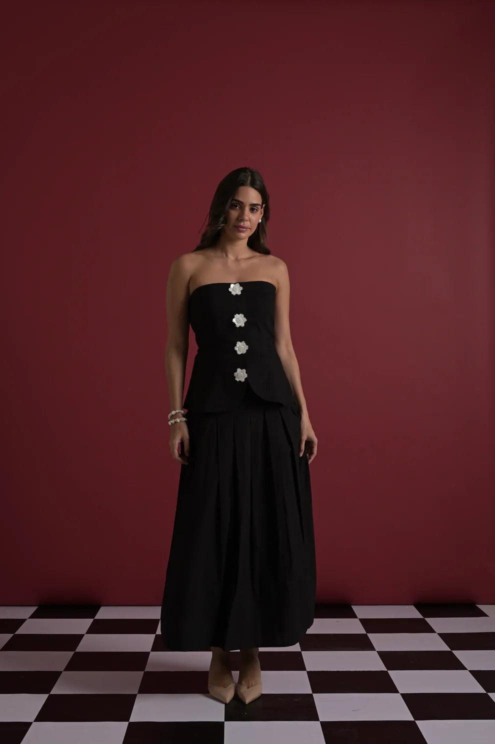 An elegant black strapless top paired with a flowy full-length skirt, creating a sleek and timeless silhouette. The top features statement floral appliqué buttons down the front, adding a subtle yet striking detail, while the structured bodice balances beautifully with the soft drape of the skirt. Effortlessly refined and versatile, this set works perfectly for evening affairs or elevated daytime looks. Shown on a model wearing size XS, with a height of 5'7”.