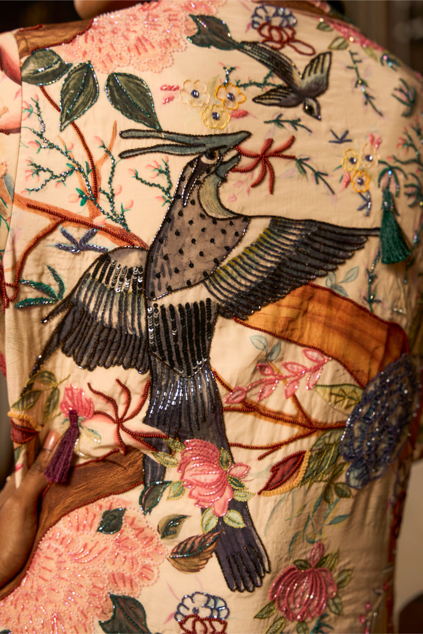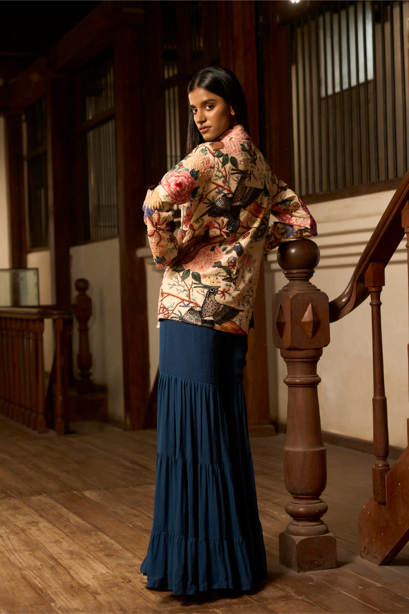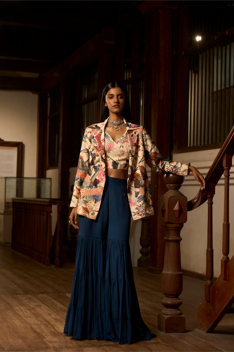 This ensemble showcases a Dior-inspired printed blazer, paired with a matching blouse and tiered navy sharara pants. The blazer is accentuated with delicate handwork, adding an artisanal charm to the luxe print. Effortlessly balancing sophistication and statement style, this look transitions beautifully from festive gatherings to elegant soirées.