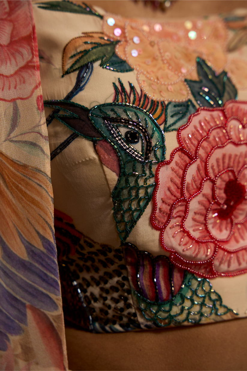A captivating ensemble from our Dior print series, this look exudes effortless sophistication. The outfit features a hand-embellished blouse paired with a fluid, printed skirt and a graceful shrug that adds movement and charm. The print — alive with flamingos, eagles, and botanical florals — narrates a story of freedom and elegance, inspired by nature’s artistry. Ideal for daytime celebrations or festive soirées, this set blends luxury craftsmanship with poetic femininity.