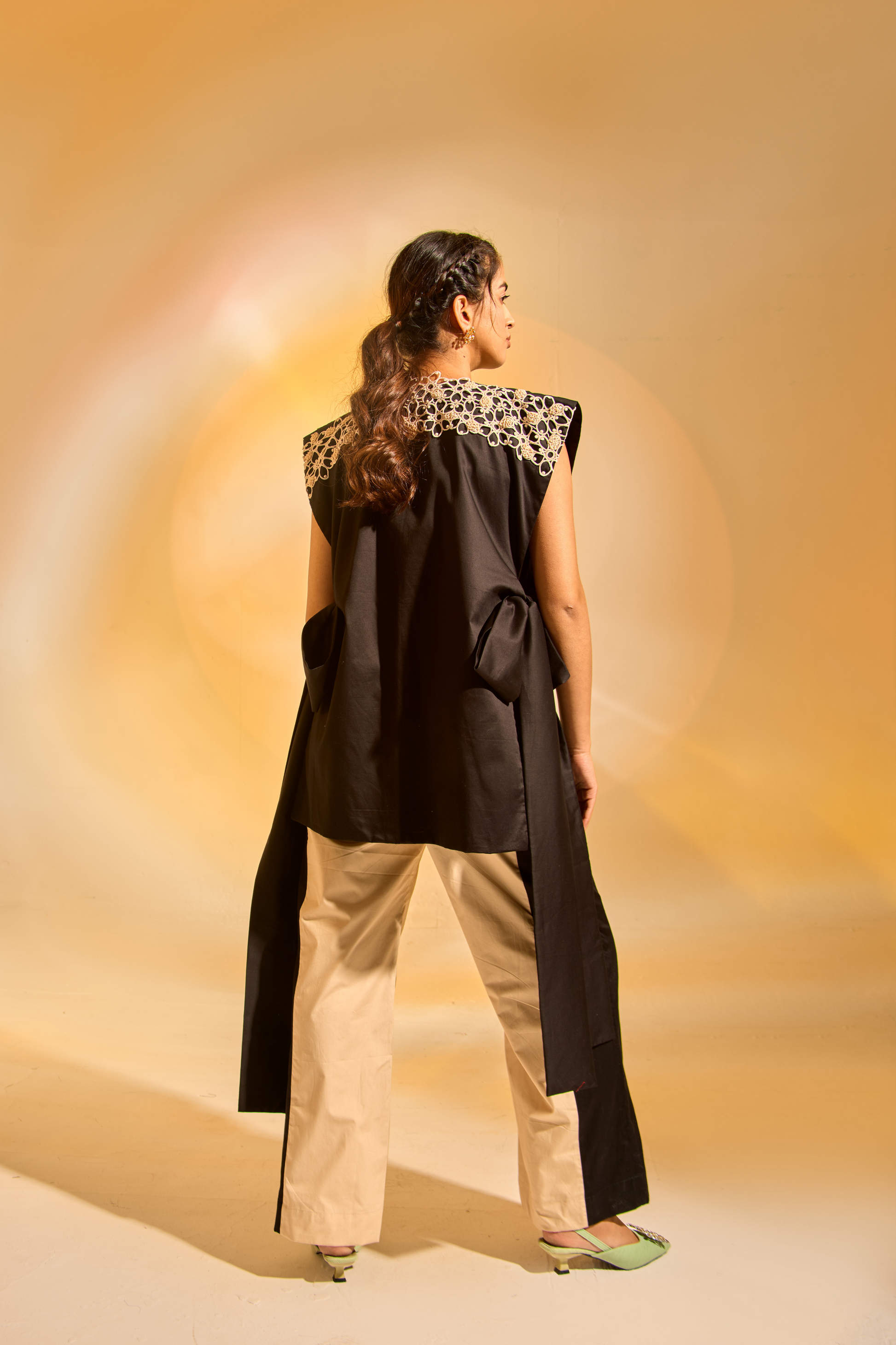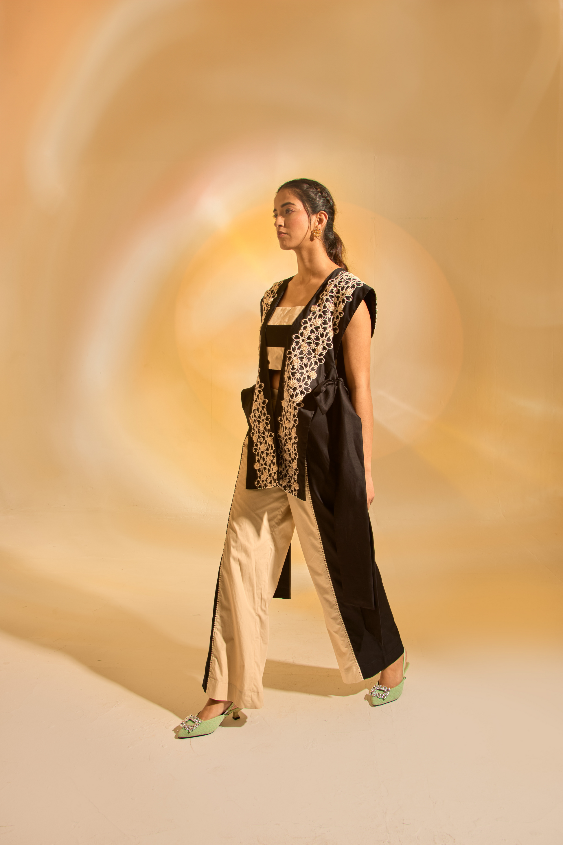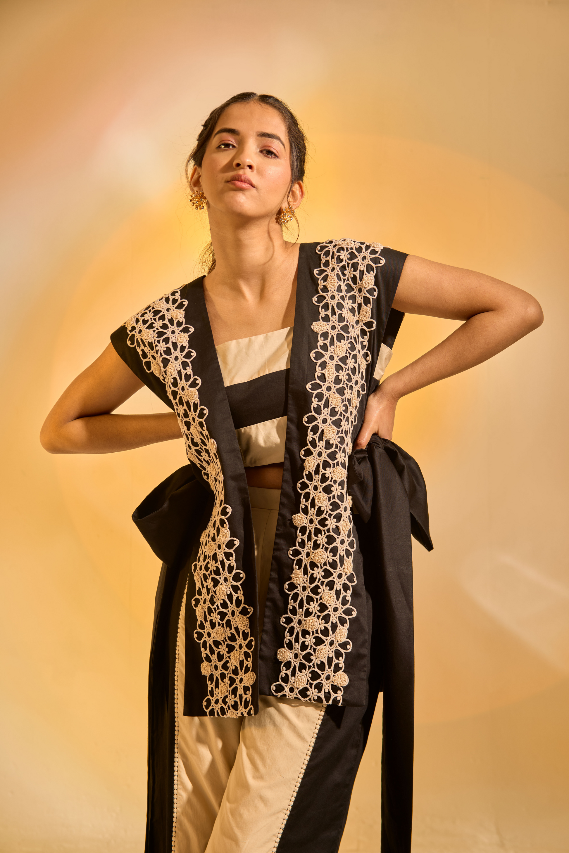 The three-piece ensemble in color-blocked black and cream features a gracefully embroidered front-open shrug with delicate tie-up details, paired with a chic crop top and sleek straight-fit pants. A wardrobe must-have!