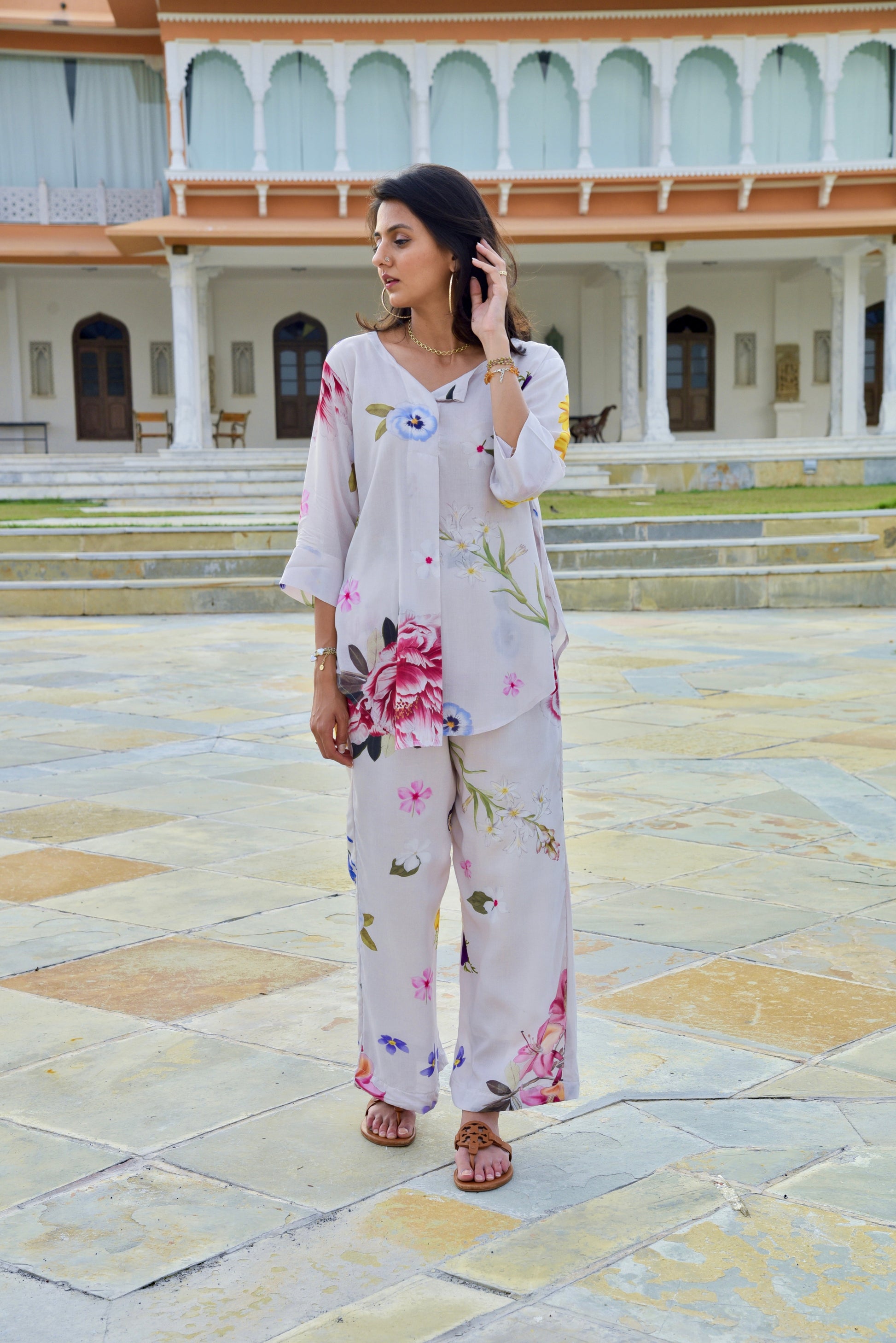 This Cream-Pink Floral Kurta Set is designed with comfort and ease in mind. The short kurta features a round neckline with a front slit, 3/4th sleeves, and a single broad front tuck that adds structure while keeping the silhouette relaxed. Paired with straight-fit pants in the same floral print, the set is light, breathable, and perfect for everyday wear.