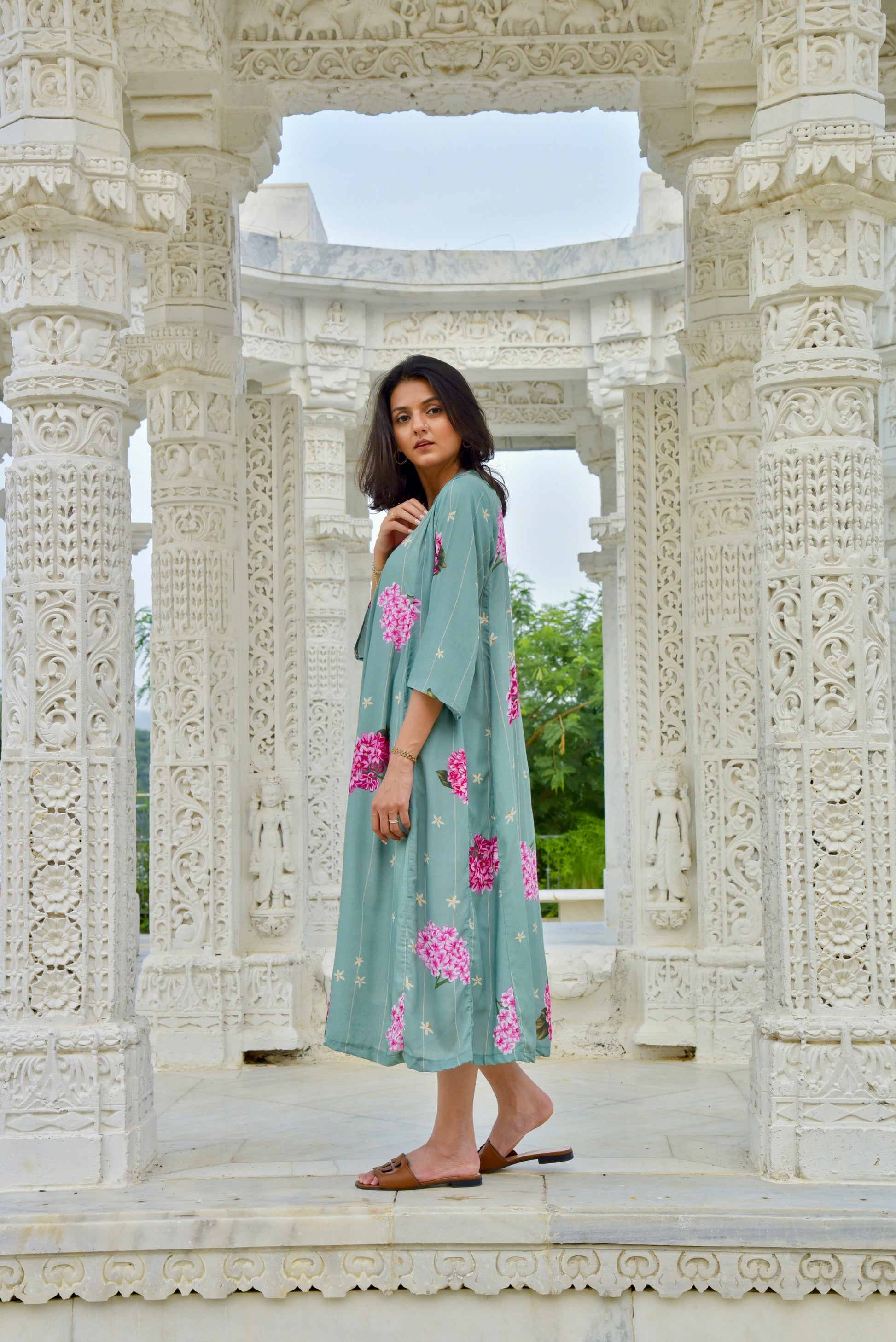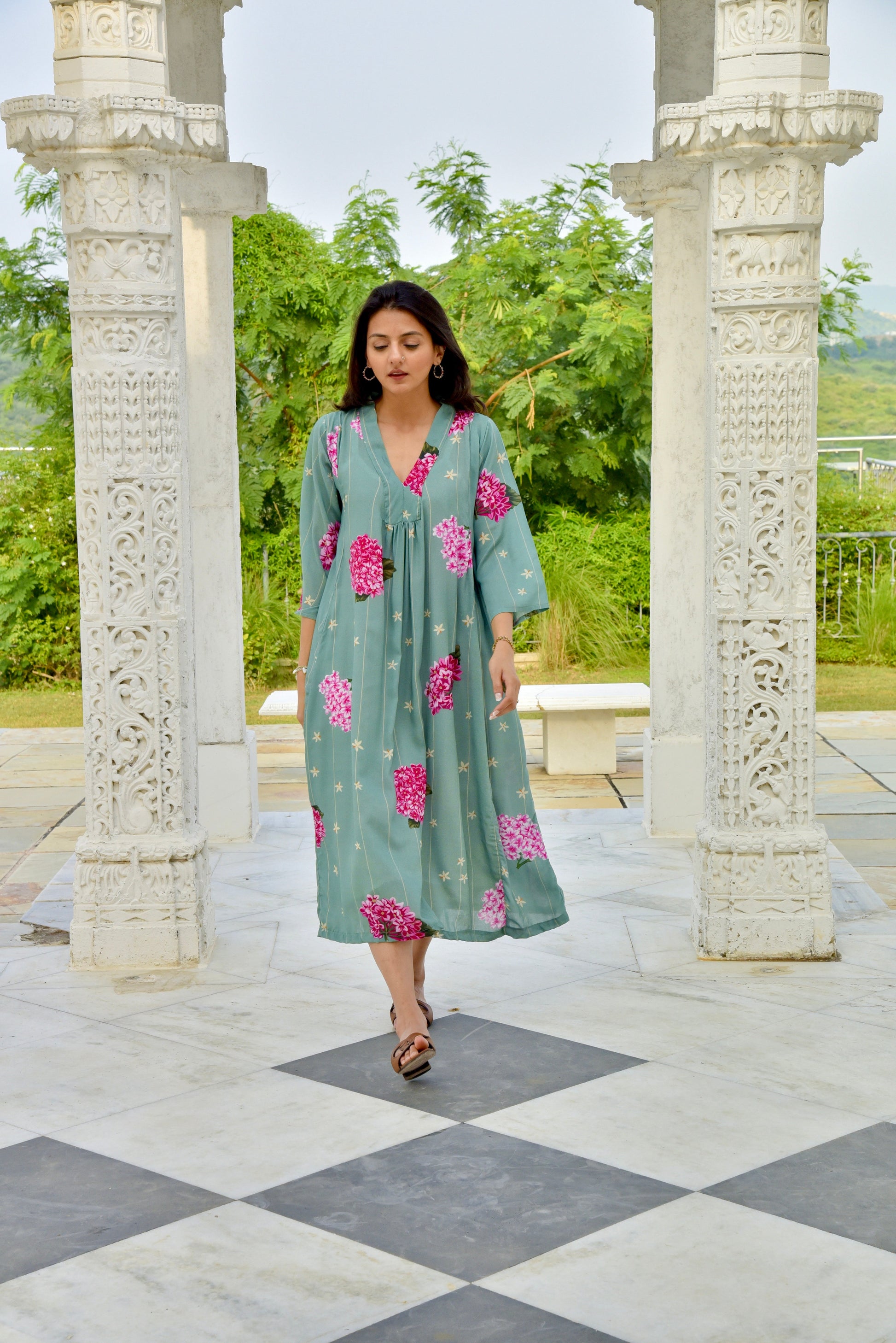 A breezy dress that carries elegance in every detail. Designed with kalis along the sides for graceful flare and soft ruffles framing the V-neckline, it flows with quiet charm. The silhouette is light and fluid, while the bold floral motifs add a touch of vibrance against the serene base. Effortless yet striking, this piece is perfect for days when comfort and beauty go hand in hand.