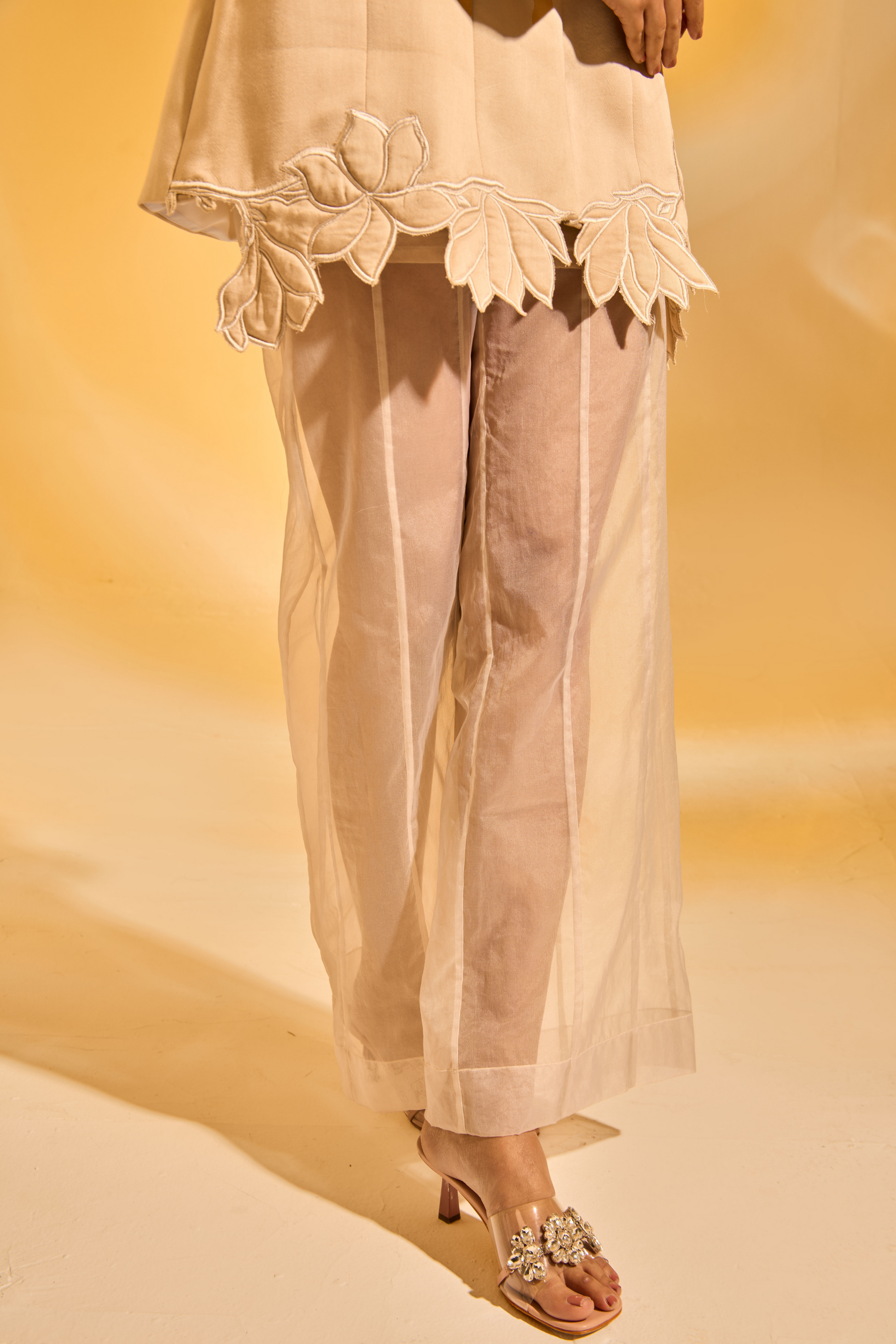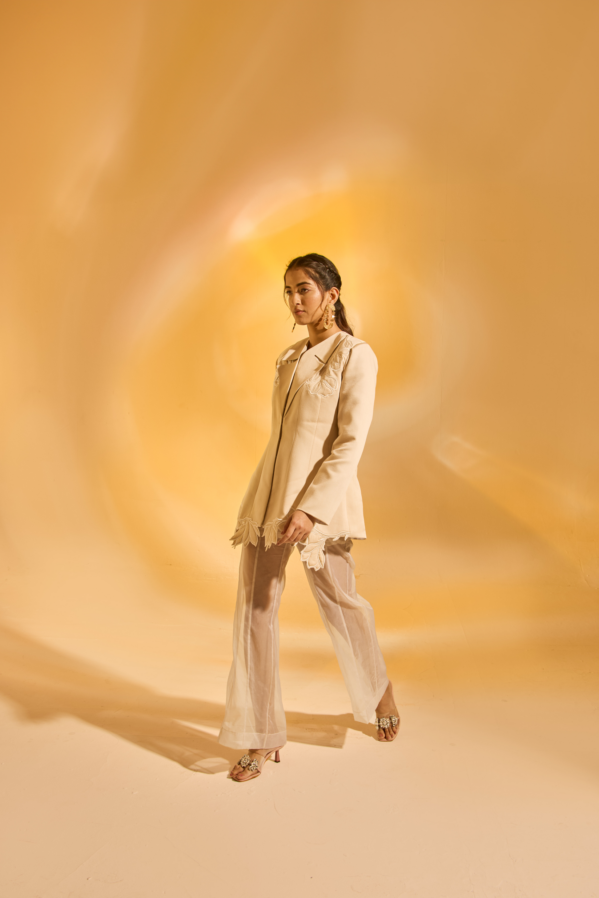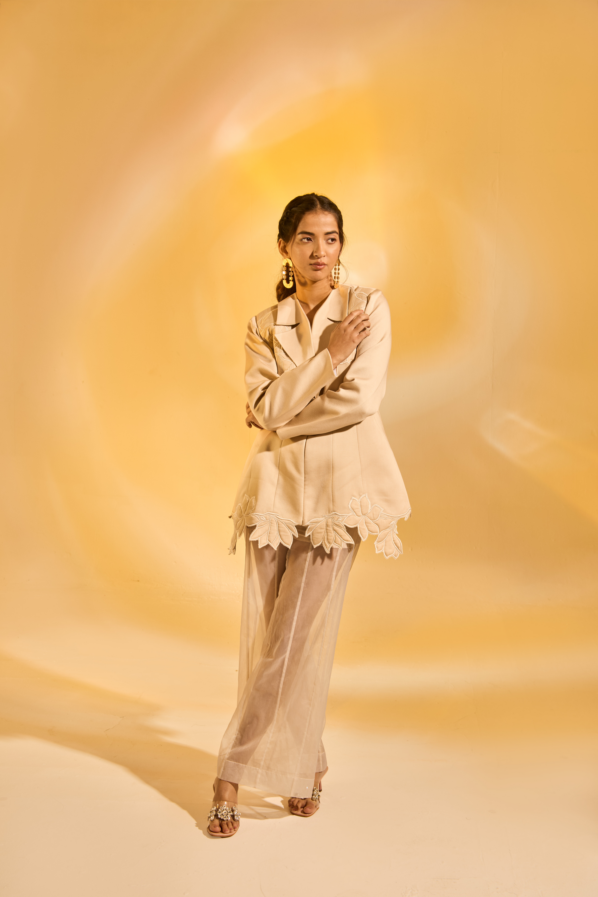 A blend of classic sophistication and contemporary allure, this timeless blazer set is elevated with embossed floral details, exuding refined elegance. The bold collars and scalloped floral hem add a touch of romantic drama, while the blazer is perfectly paired with transparent organza pants featuring a chic short lining inside.