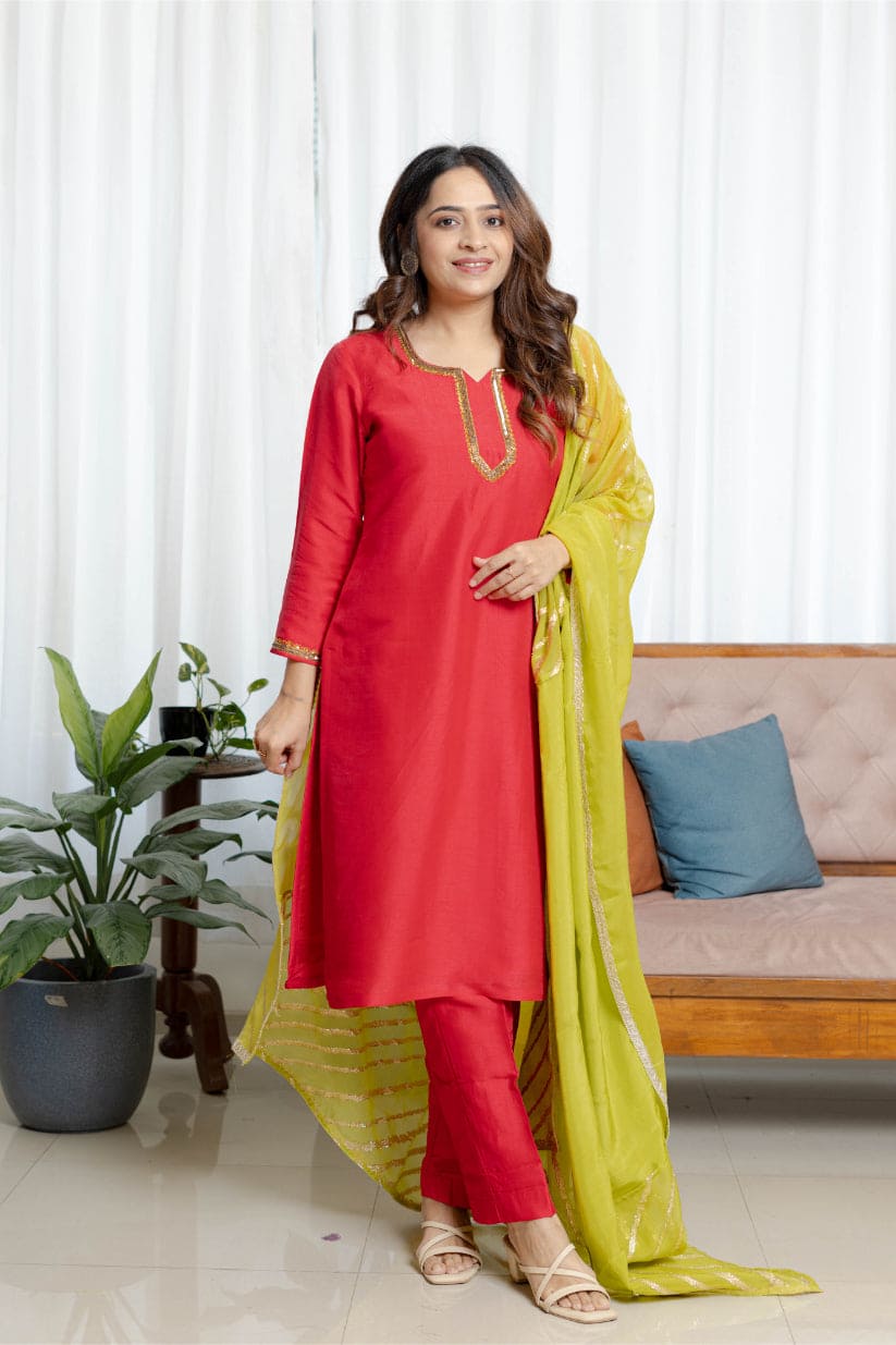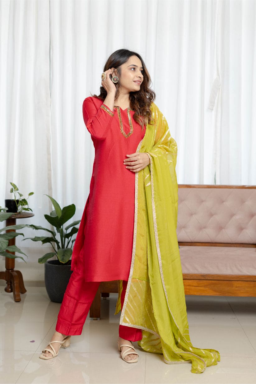 A straight-cut suit set crafted in luxurious raw silk. The vibrant fuchsia pink kurta features delicate handwork on the neckline and sleeve cuffs, offering just the right amount of shimmer for your day-to-night occasions. It’s paired with a fresh twist — a lime green organza dupatta, light as air and finished with scalloped lace borders, giving the outfit a festive yet contemporary edge. Wear it to Mehendi, brunches, or haldi preps — it’s the kind of statement that needs no noise.