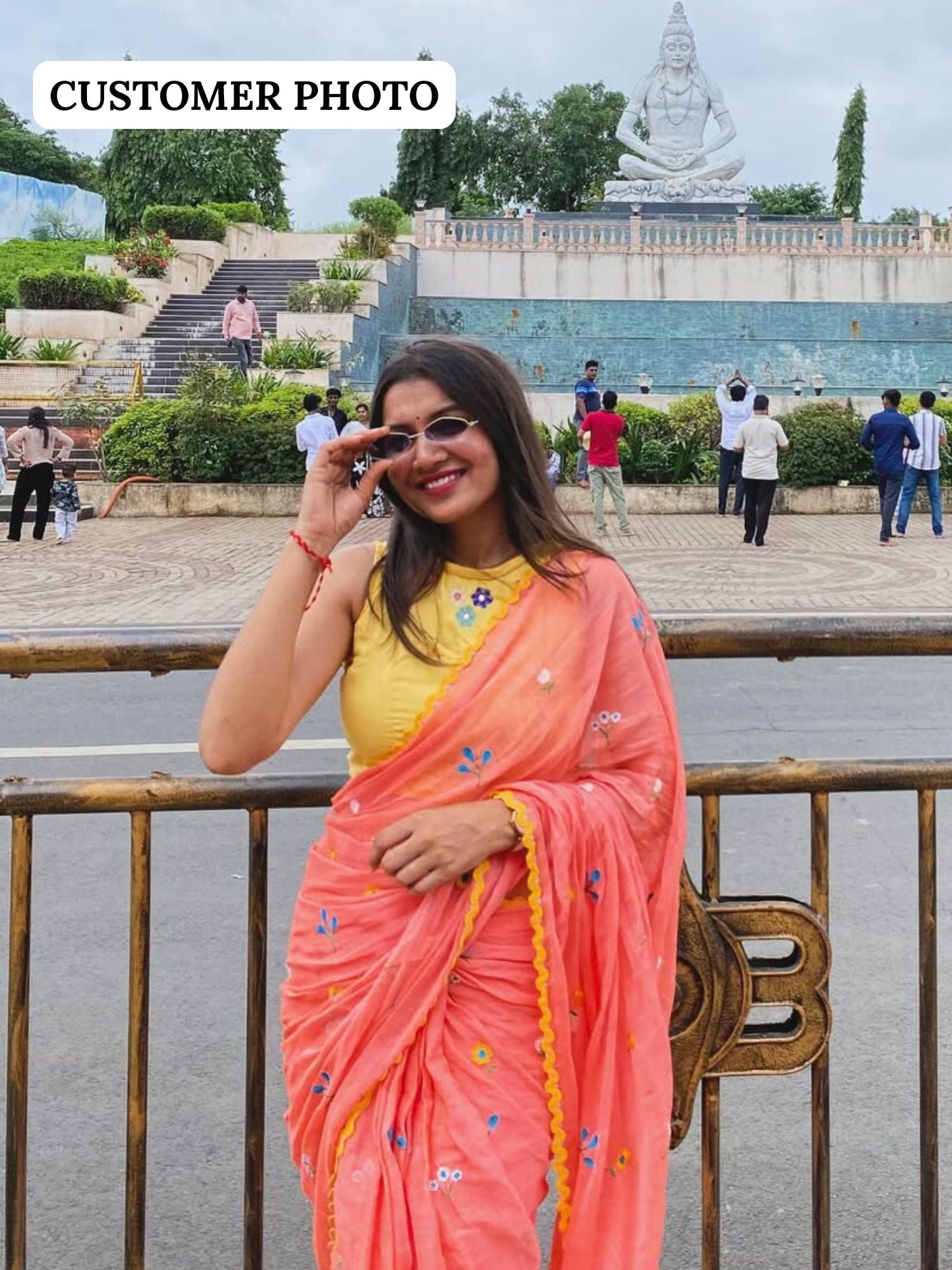 The prettiest saree of the season is here! A beautiful peach color embroidered with multi color whimsical flowers, woven in the softest of mul cotton and adorned with a bright lace, this is the saree of joy.