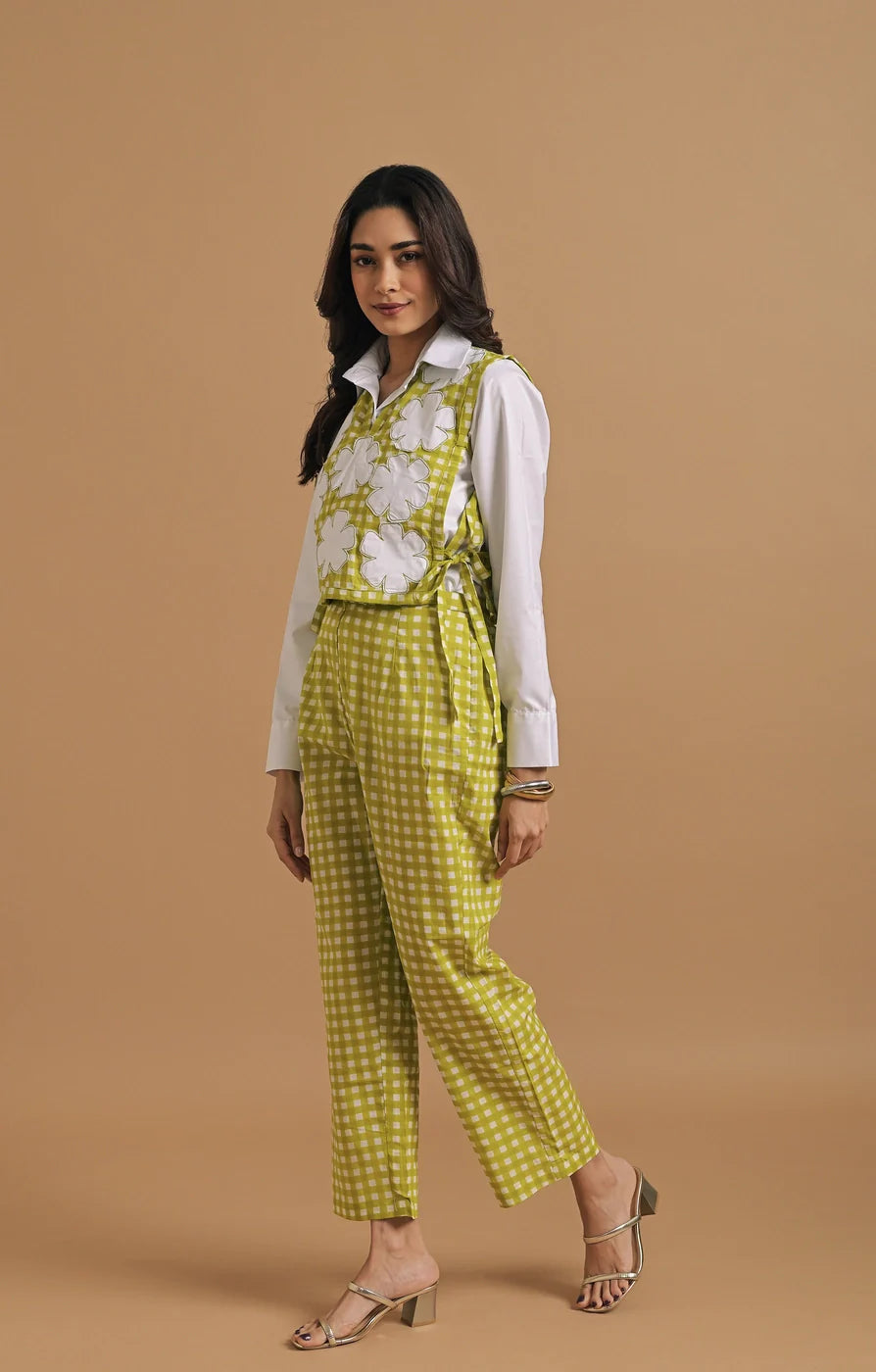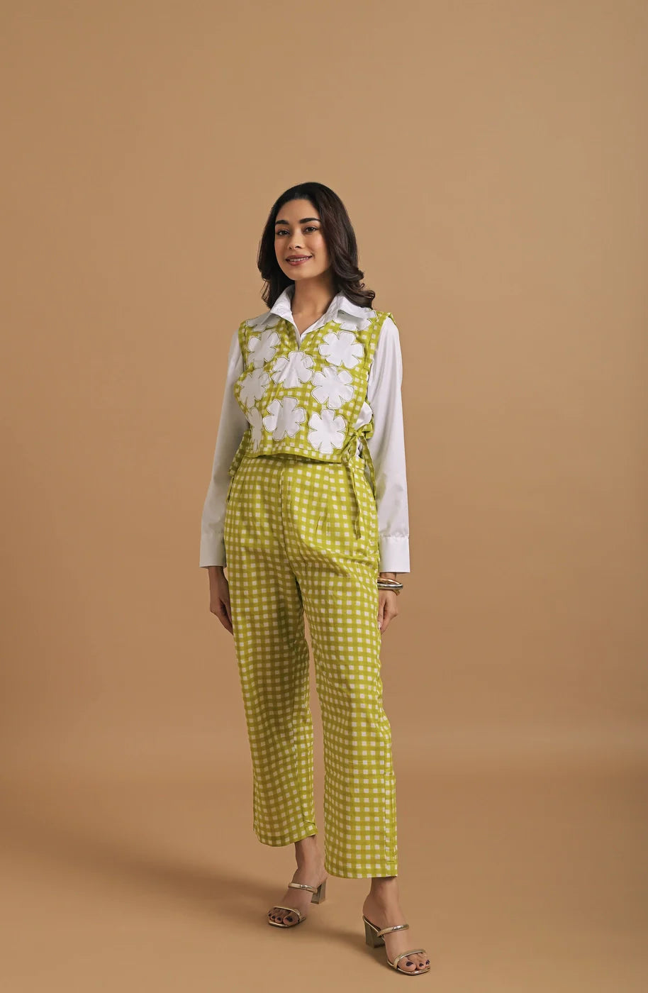 The top layer is a sleeveless gingham overlay with side tie-ups, featuring oversized white floral appliqué embellishments that lend a fresh, three-dimensional texture. These statement flowers create a striking contrast against the green base, injecting a handcrafted, artisanal charm to the ensemble. Underneath, the classic white collared shirt balances the look with full-length sleeves, structured cuffs, and a sharp collar, grounding the playful top with a touch of sophistication.