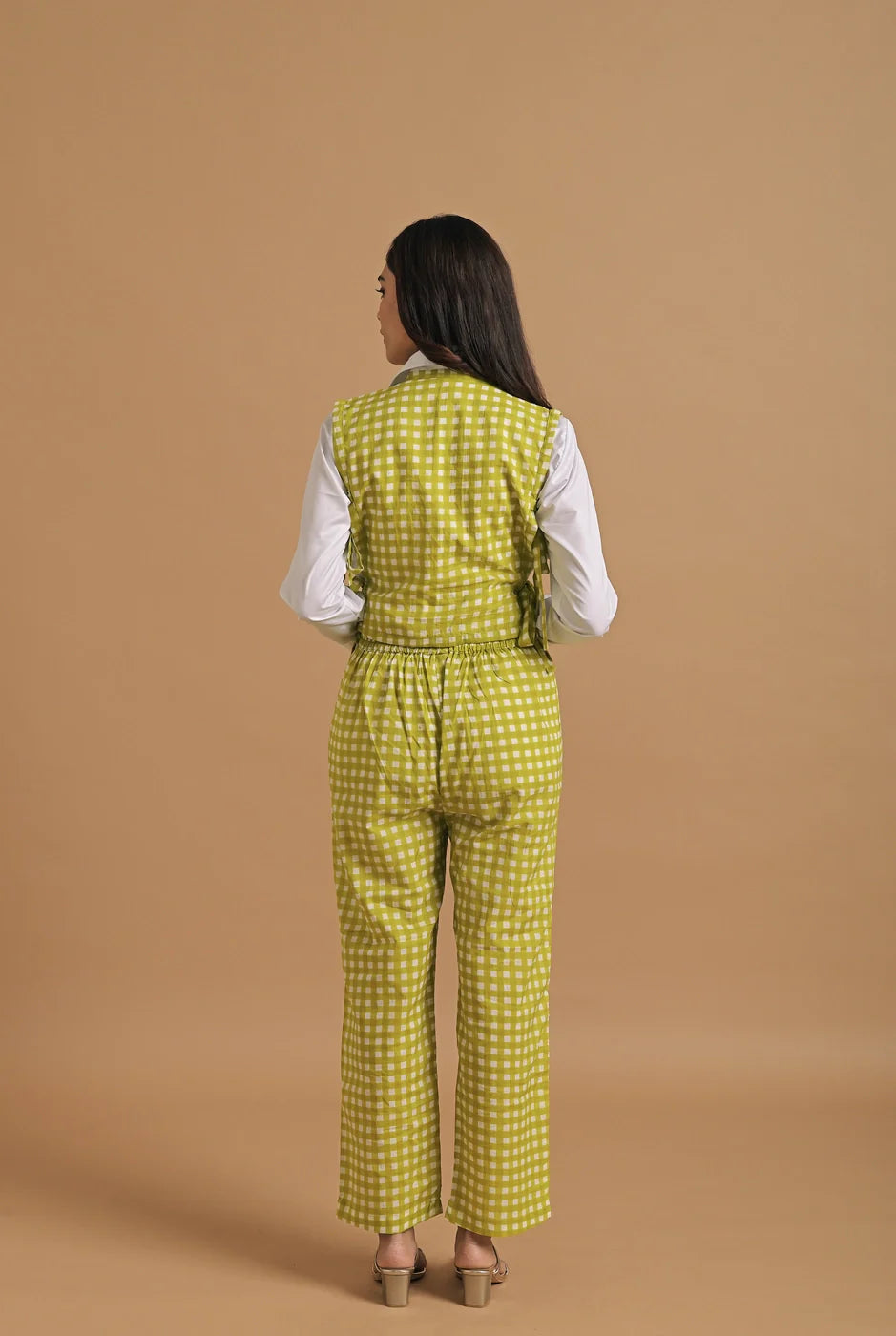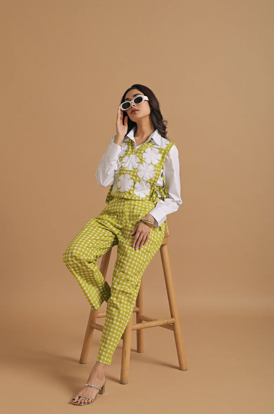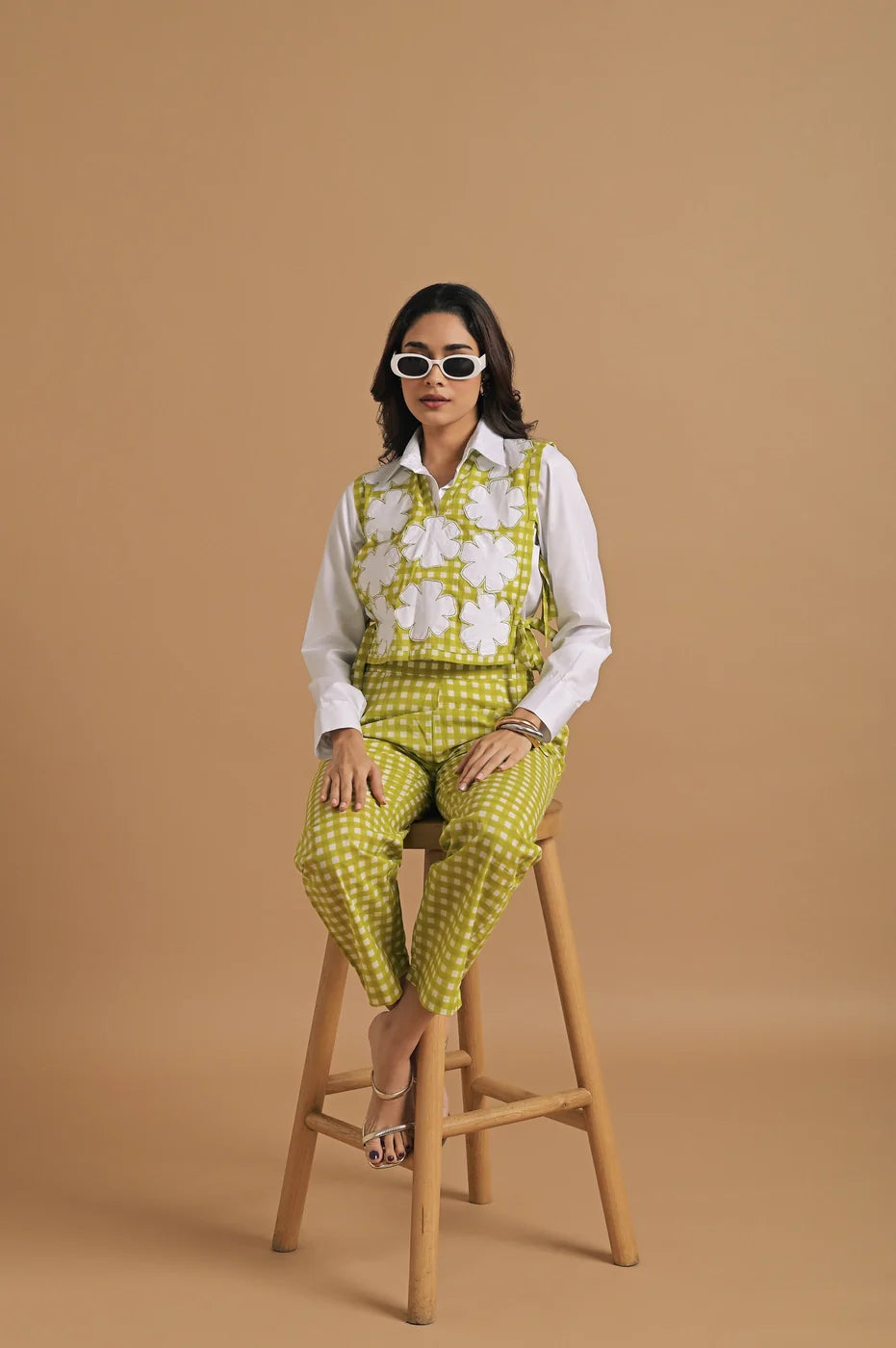 The model is wearing a smart, coordinated outfit that beautifully marries contemporary tailoring with playful, handcrafted detail. The look is composed of a two-piece set in a lively lime green and white gingham check pattern, paired with a crisp white shirt that adds structure and polish.