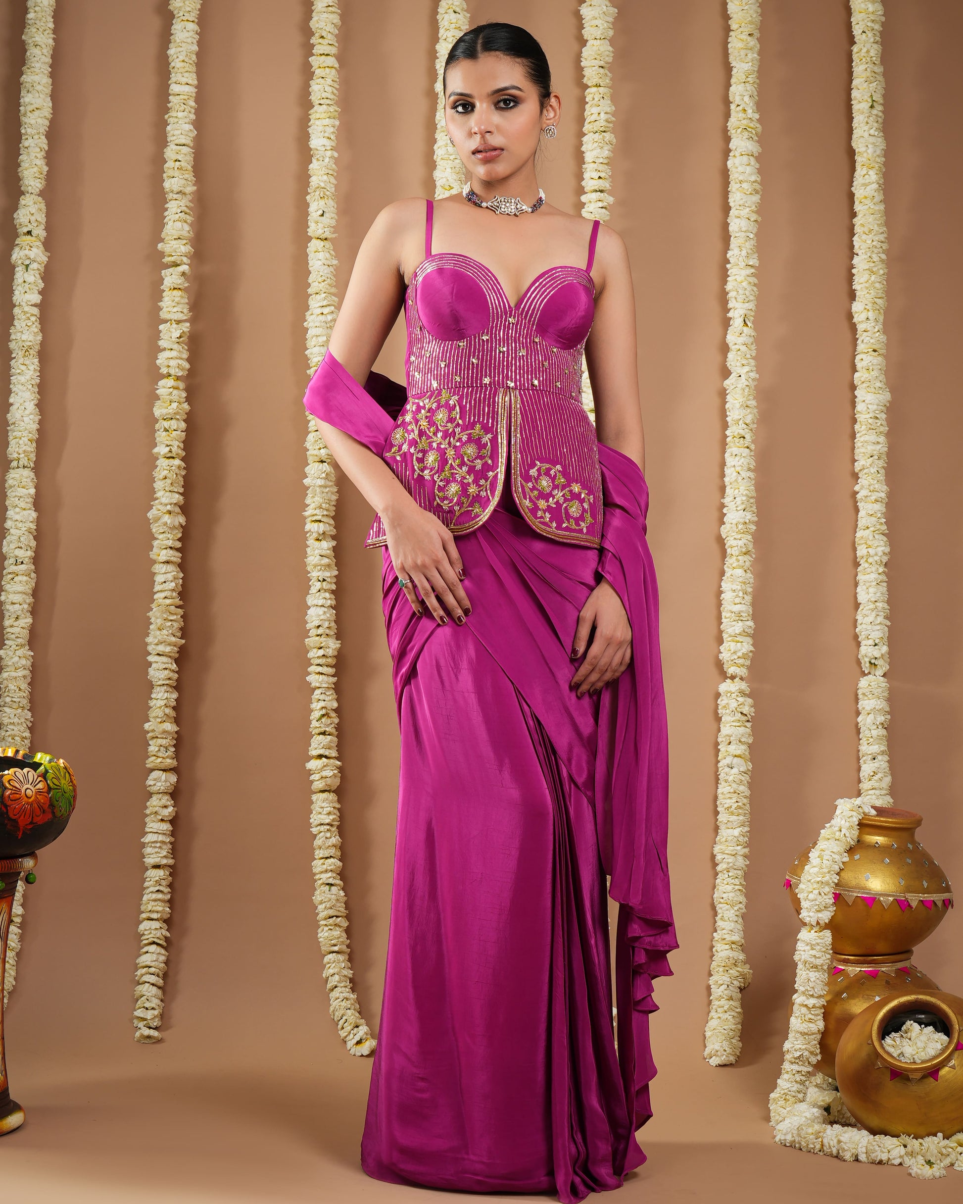 This set comes with a deep sweetheart neck padded long bustier and a pre drape saree in grape wine colour.