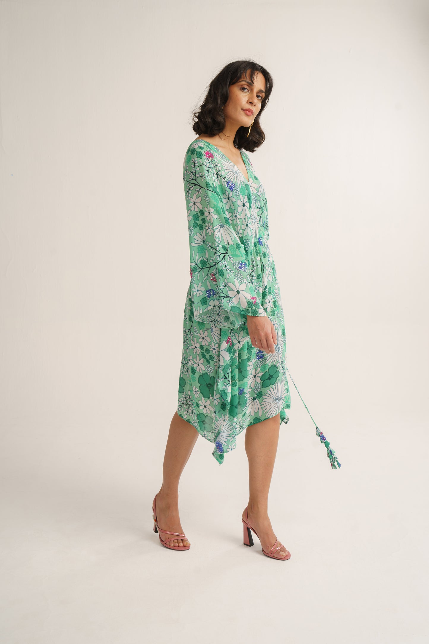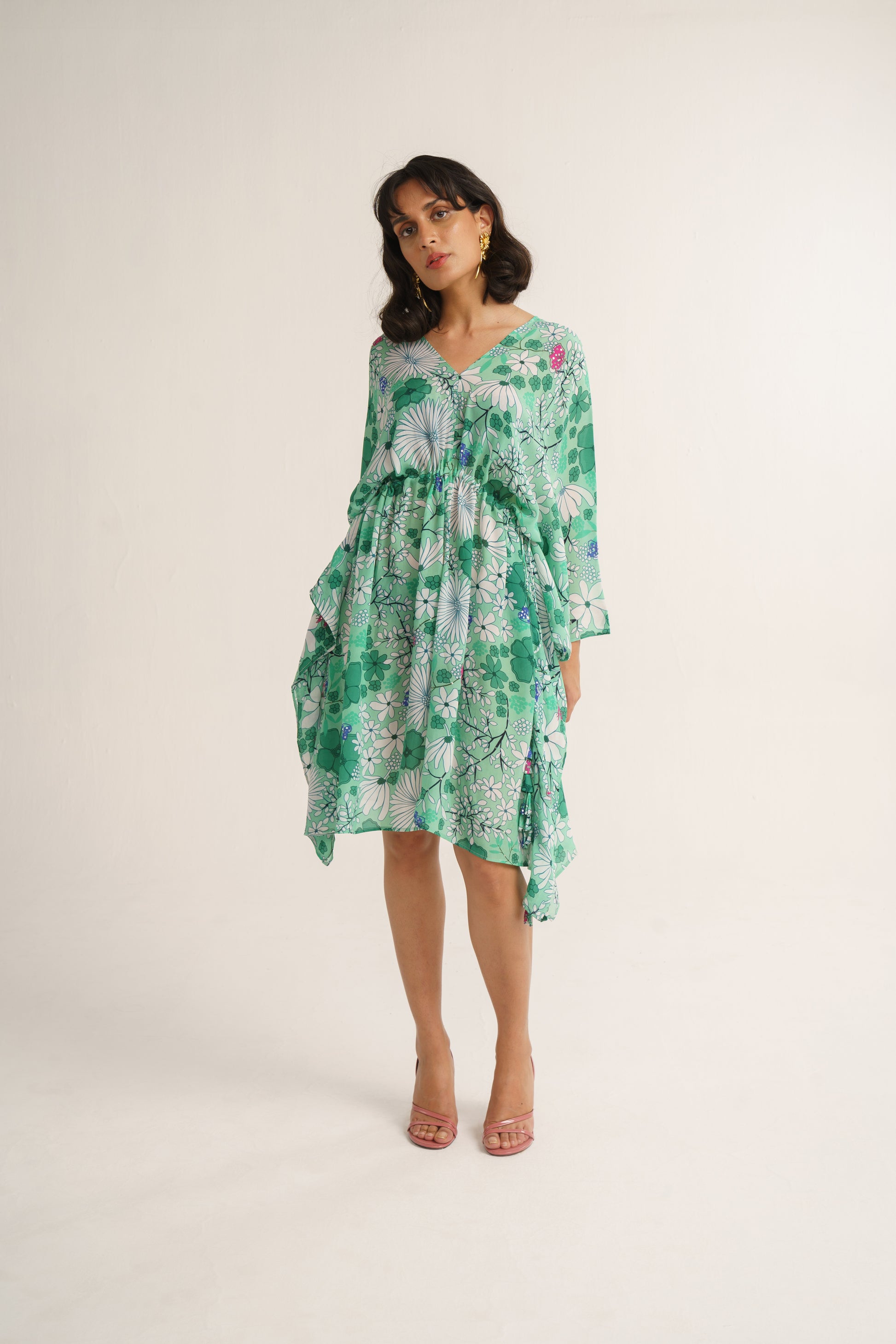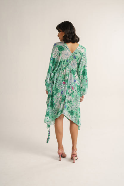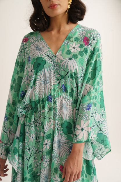 Green Crepe Silk Print Floral V Neck Gladiolus Kaftan