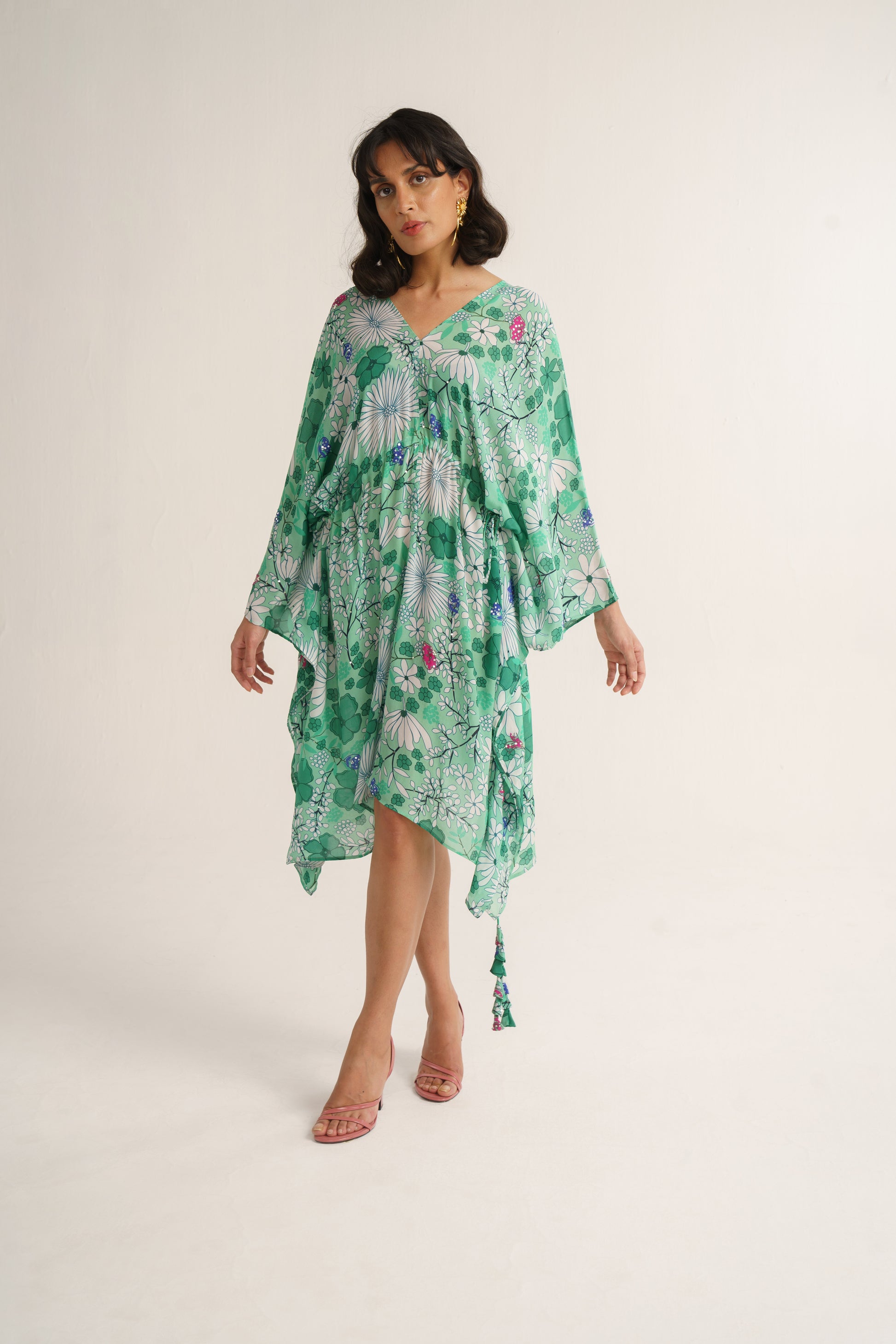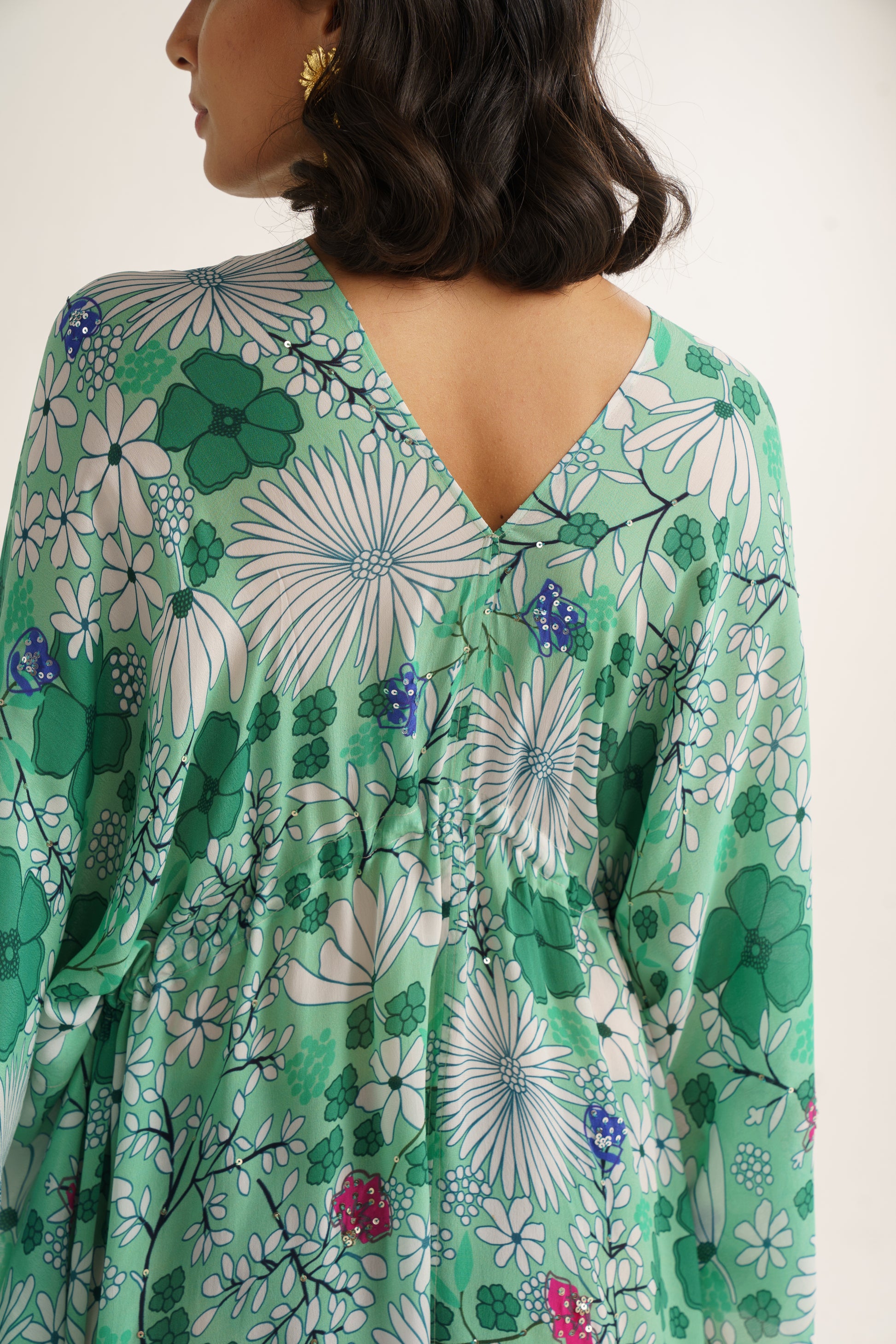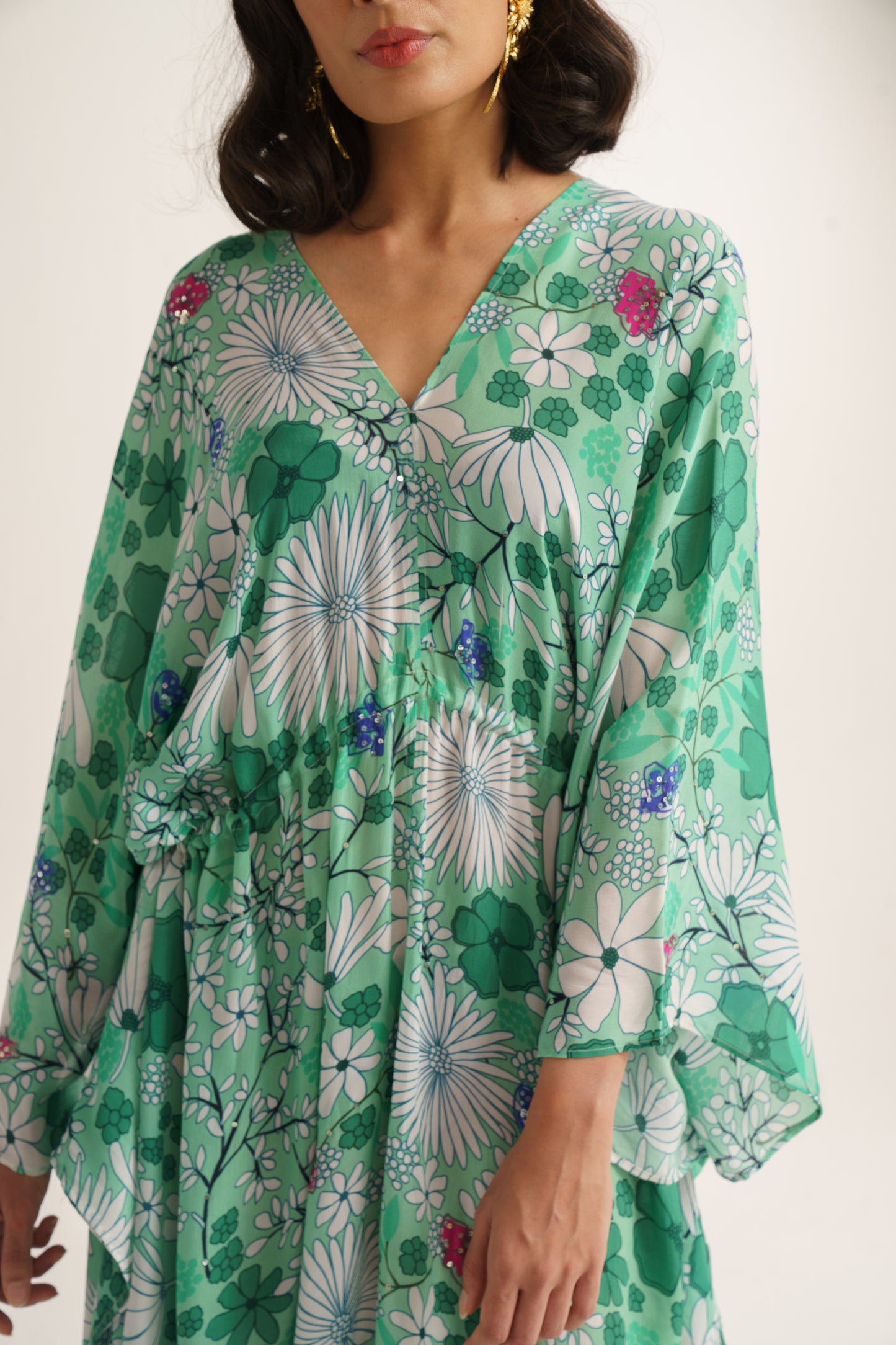 Green kaftan featuring all-over floral garden prints with sequin highlights