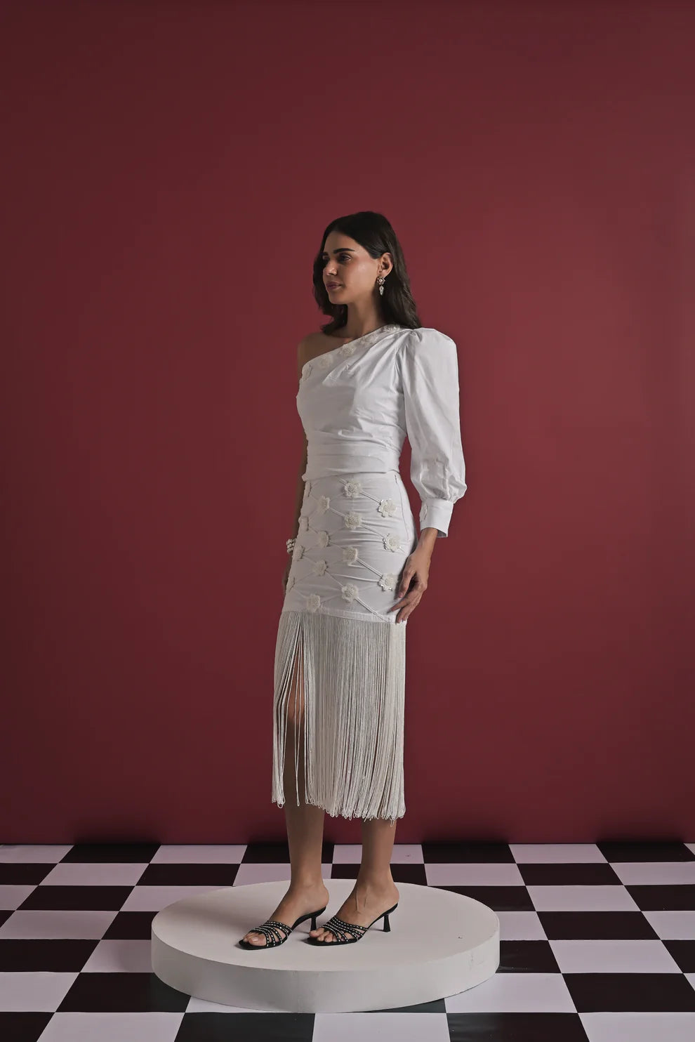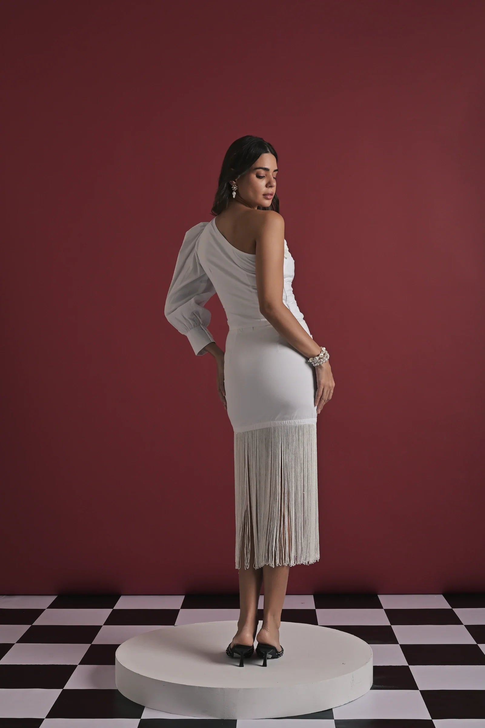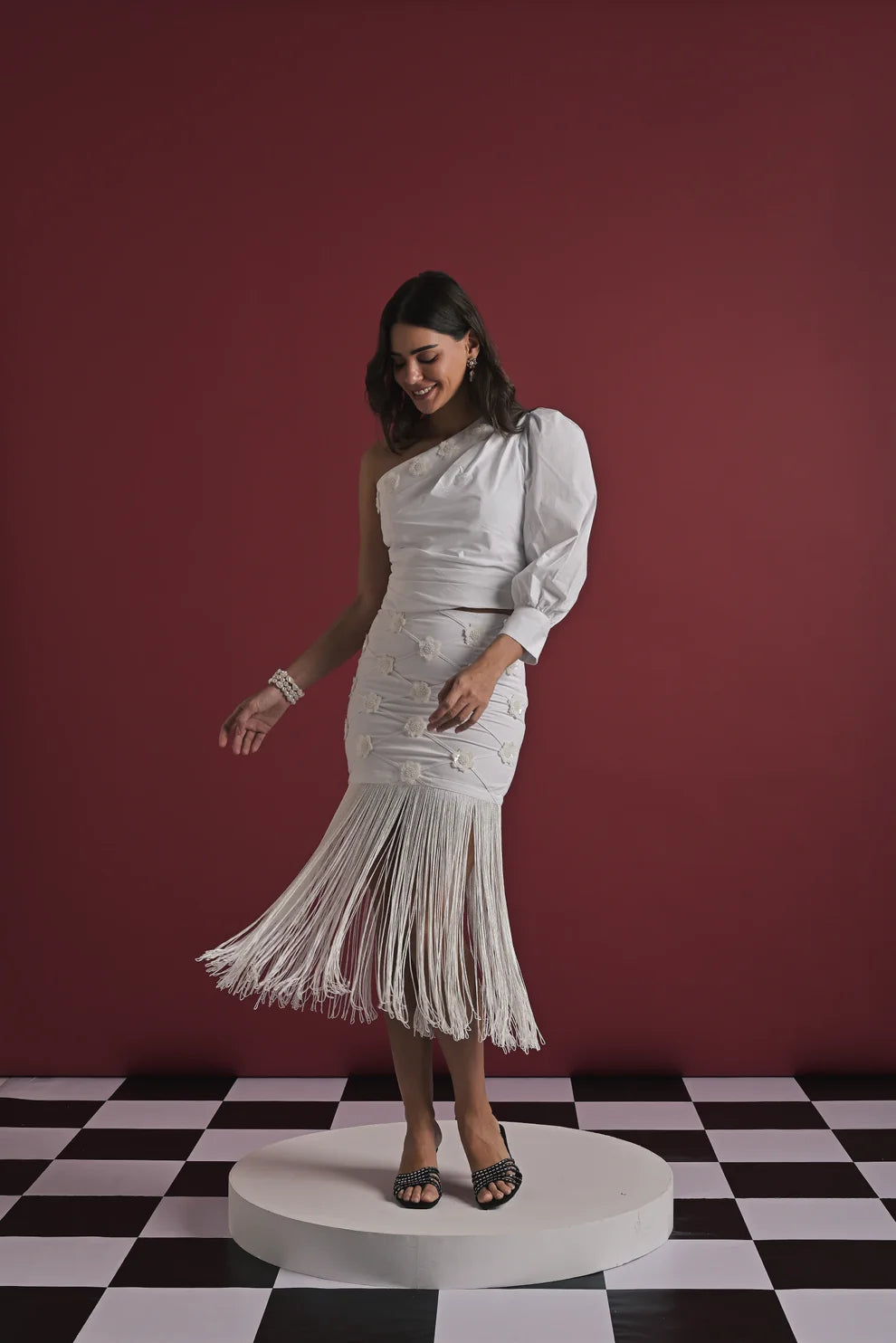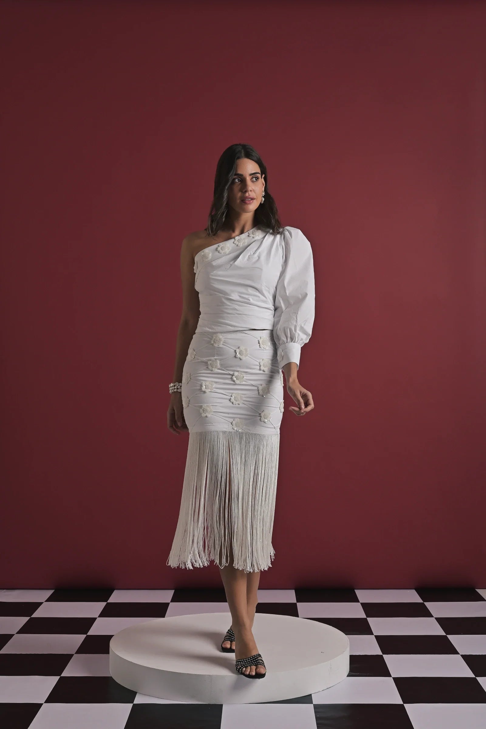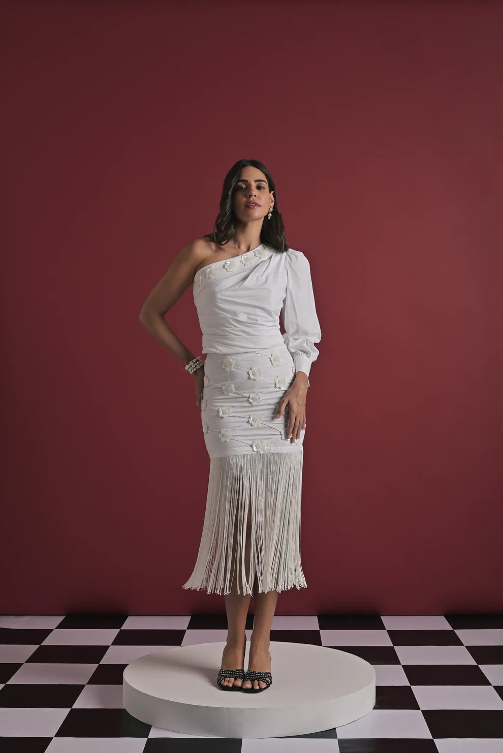 A striking two-piece set crafted in elegant white, designed to blend structure with movement. The one-shoulder top features soft ruching and a dramatic puff sleeve, giving it a bold yet refined silhouette. Paired with a matching high-waisted skirt adorned with delicate knot details and a full fringe hem, this set moves beautifully with every step. Perfect for celebrations, evening outings, and standout occasions.