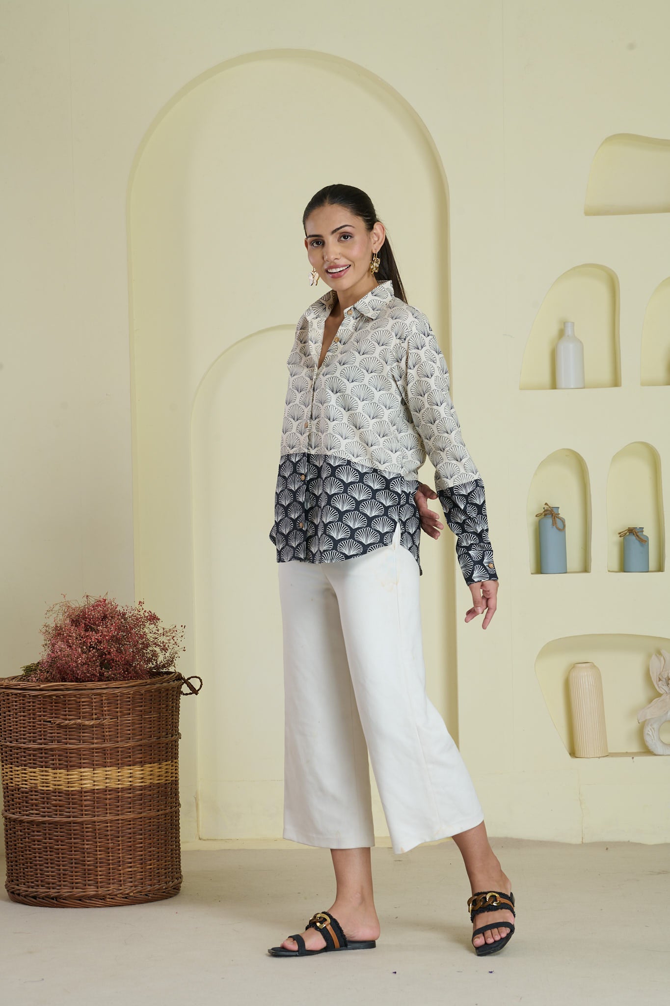 - Collared Shirt style with concealed button placket and rounded high low hem