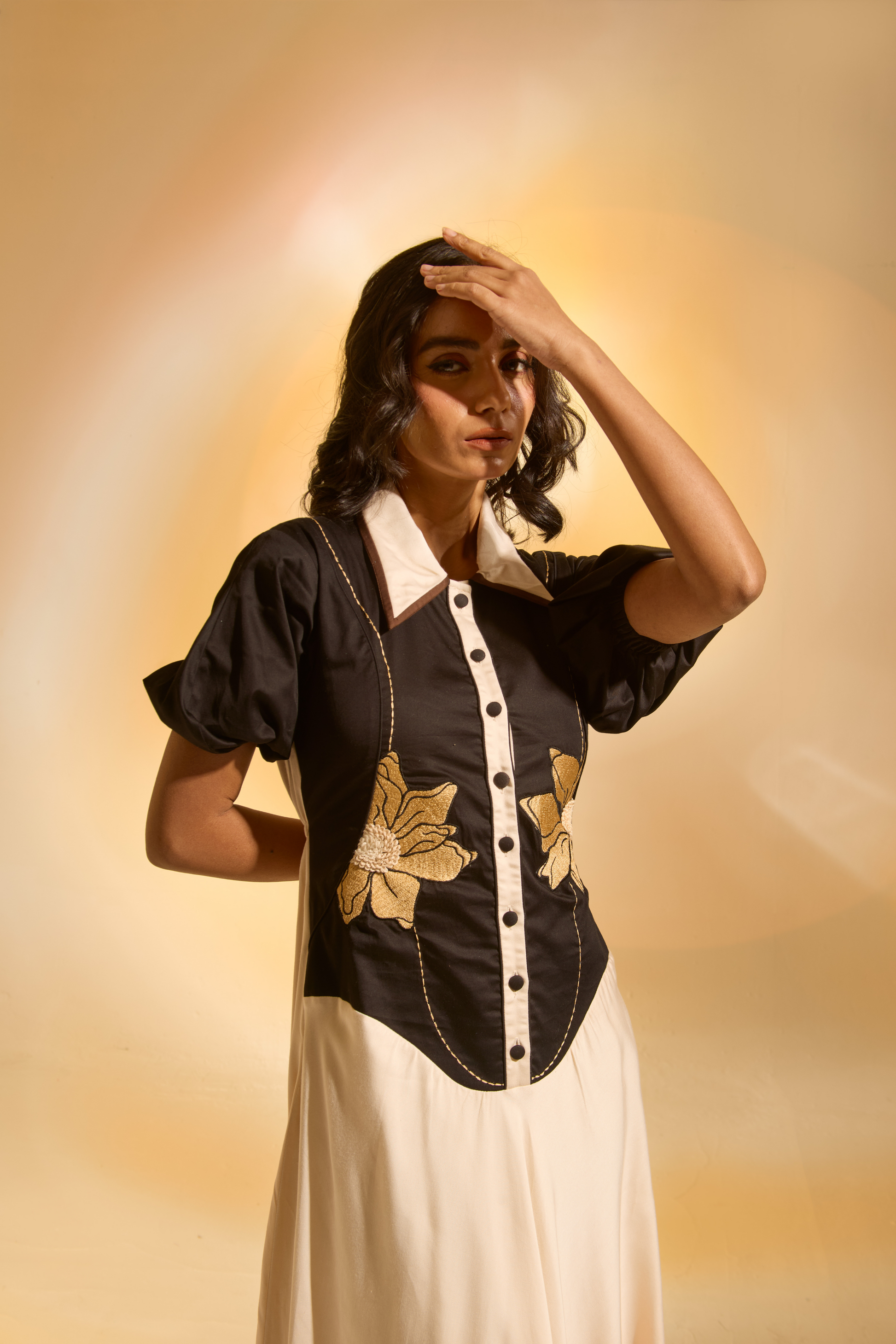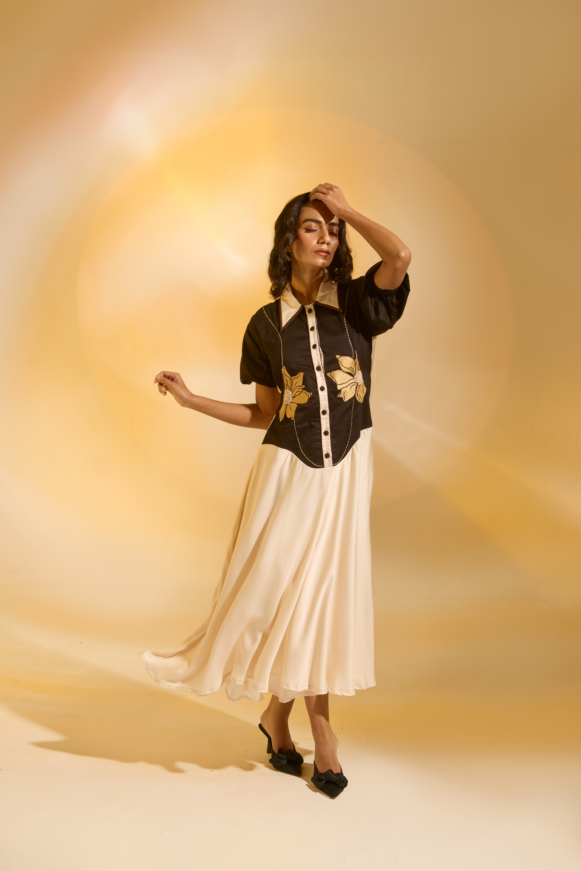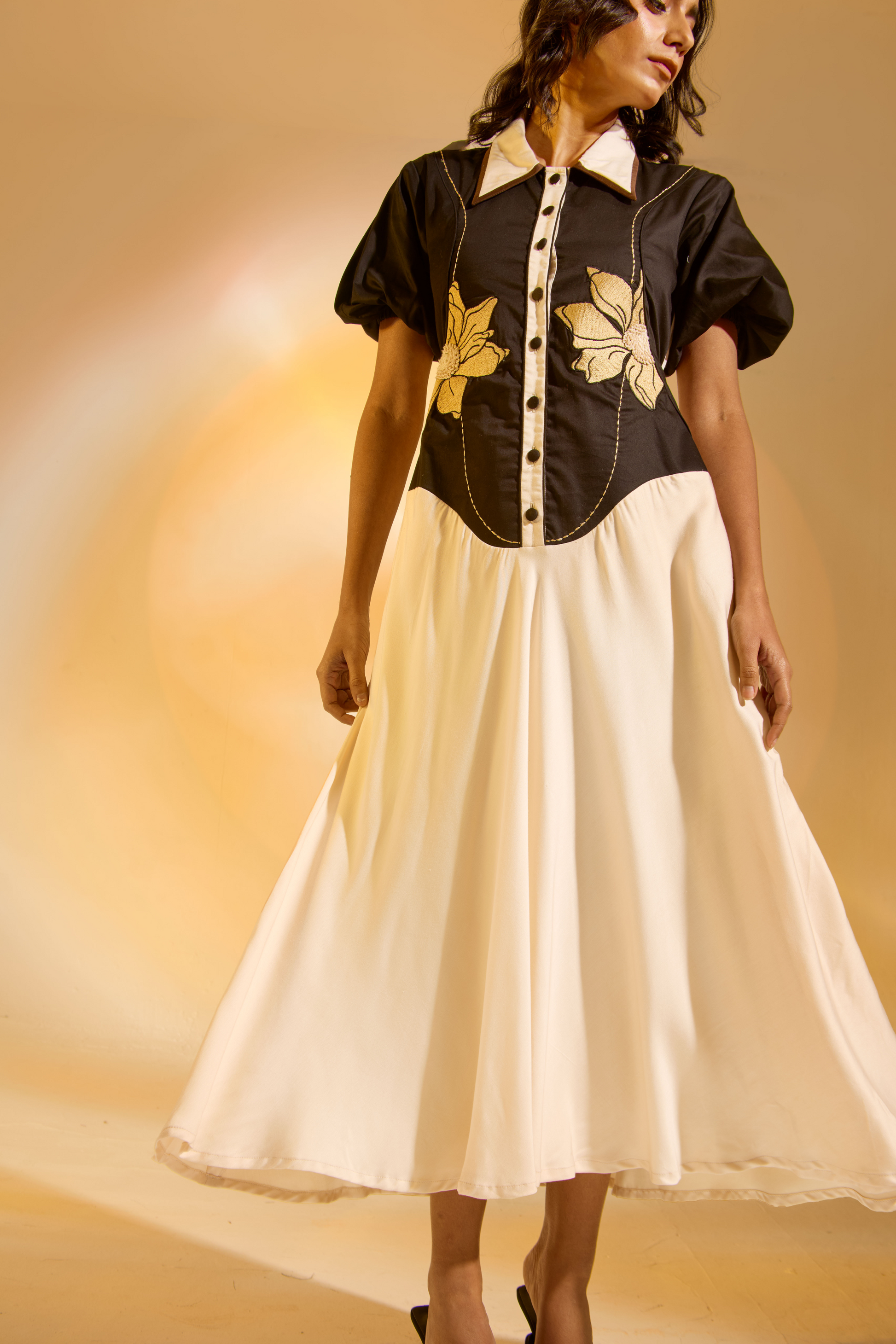 This floral dress captures the essence of femininity with its classic fit-and-flare silhouette, enhanced by thread-embroidered patches on the waist. The intricate embroidery adds an elegant, hand-crafted touch, making it a statement piece for any occasion.