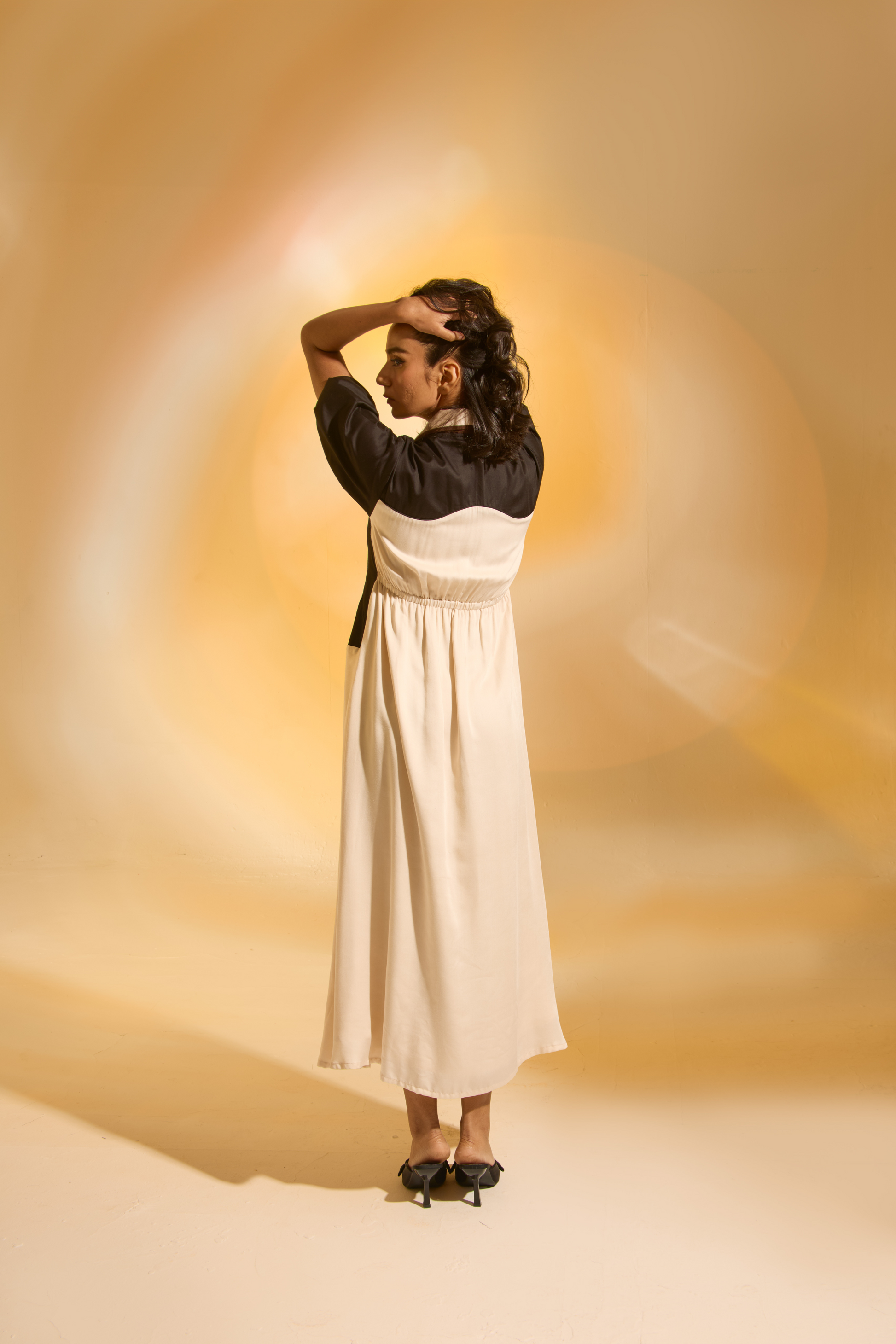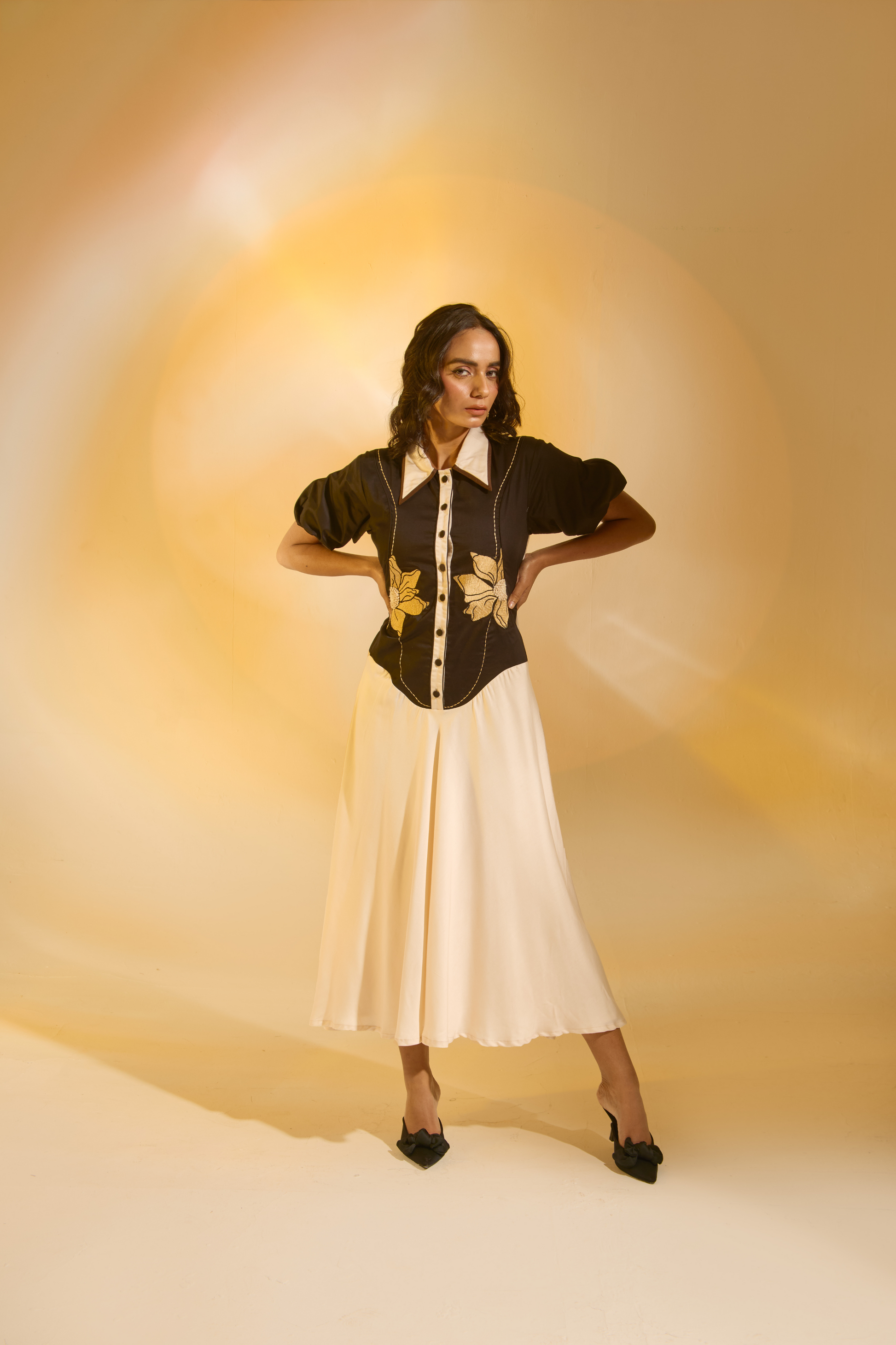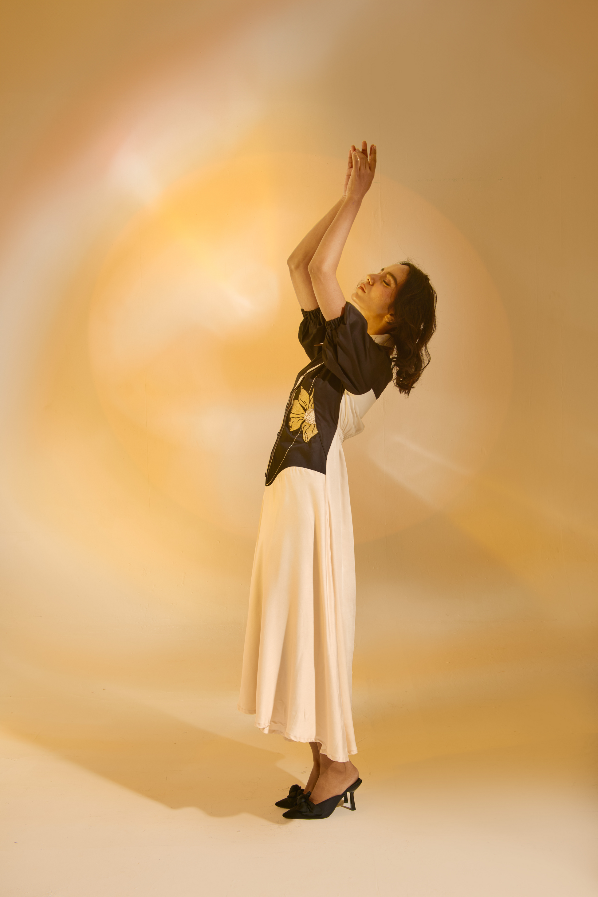This floral dress captures the essence of femininity with its classic fit-and-flare silhouette, enhanced by thread-embroidered patches on the waist. The intricate embroidery adds an elegant, hand-crafted touch, making it a statement piece for any occasion.