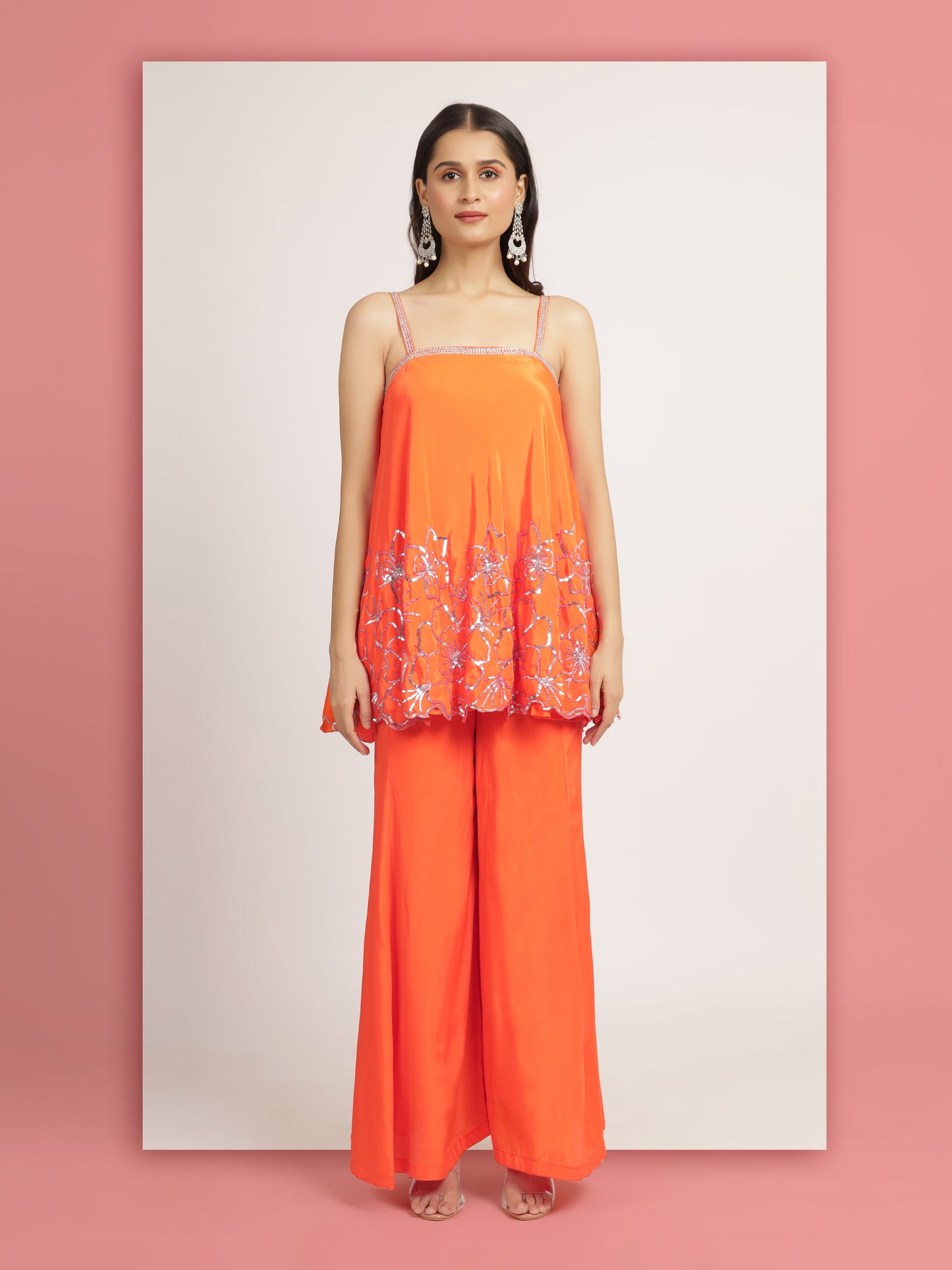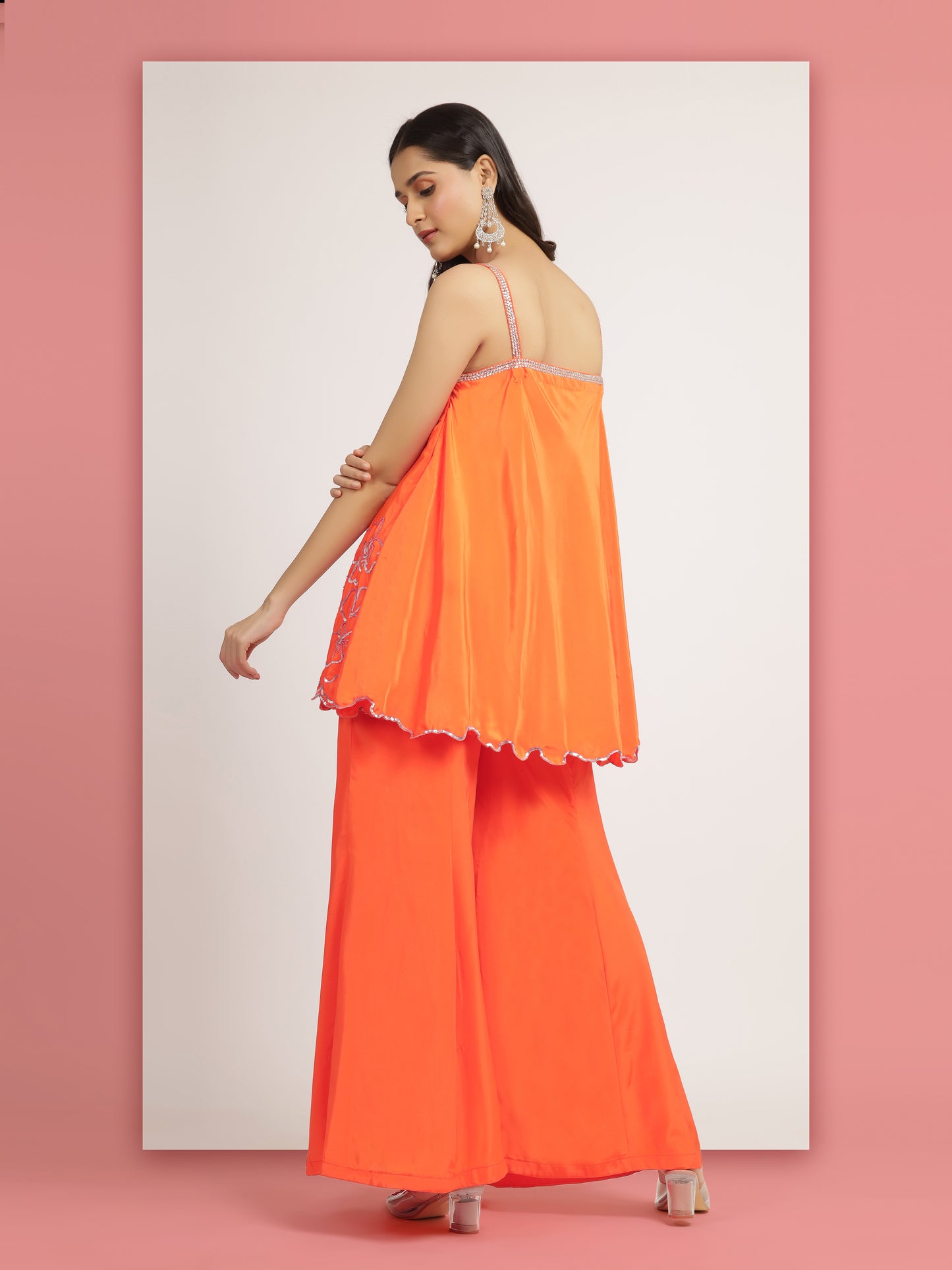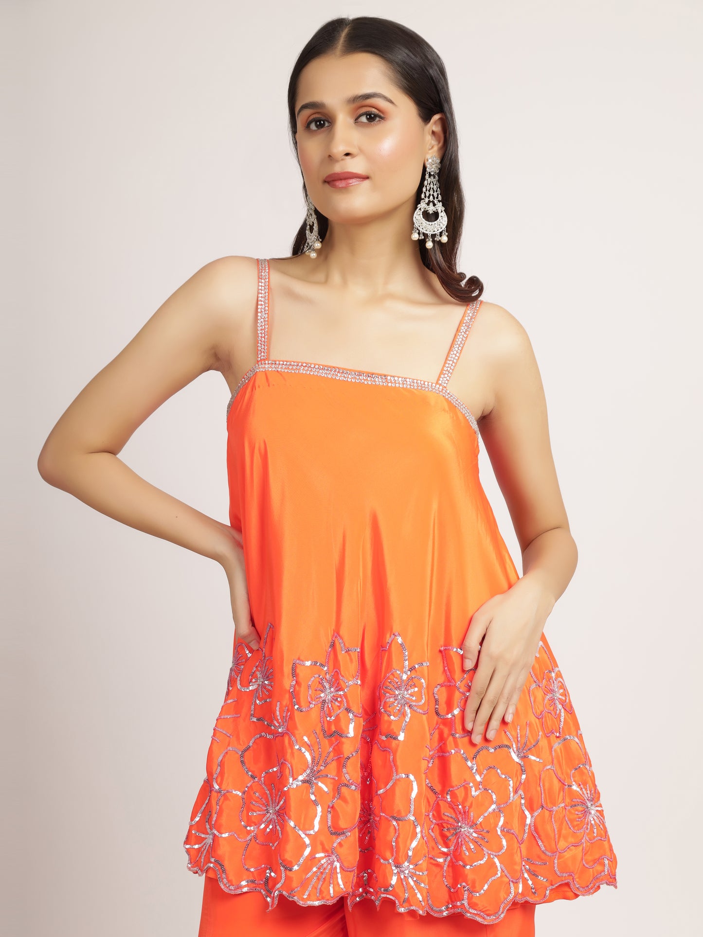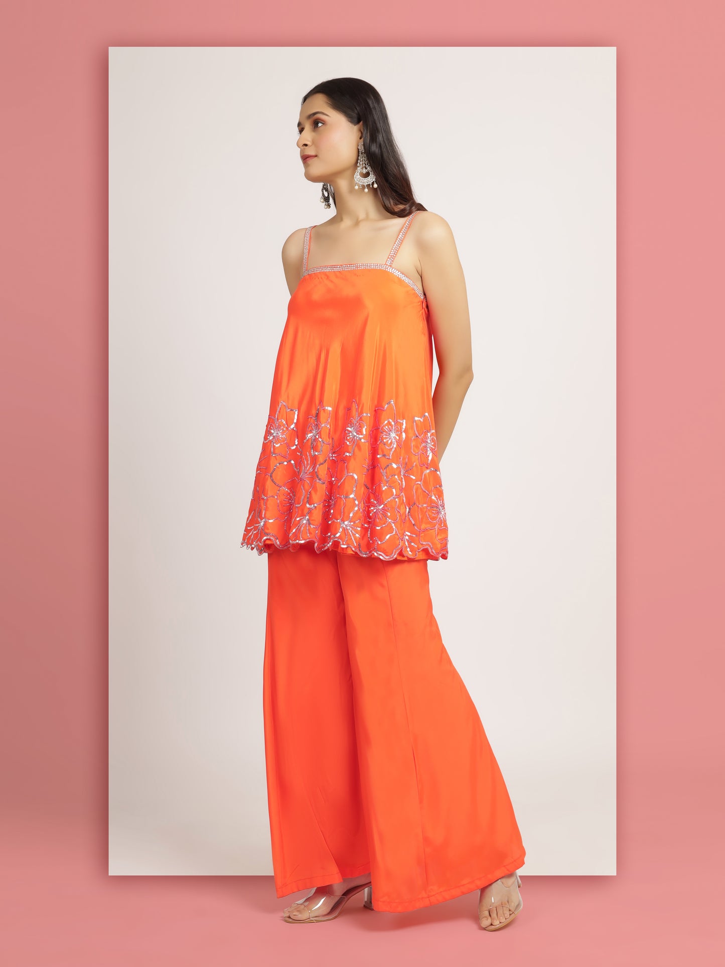 The tangerine flared tunic, adorned with vibrant floral embroidery in contrasting colors, exudes energy and style. Its strappy straps add a contemporary touch to the traditional silhouette. Paired with kali flare pants, the ensemble achieves a perfect balance of flowy elegance and modern flair.