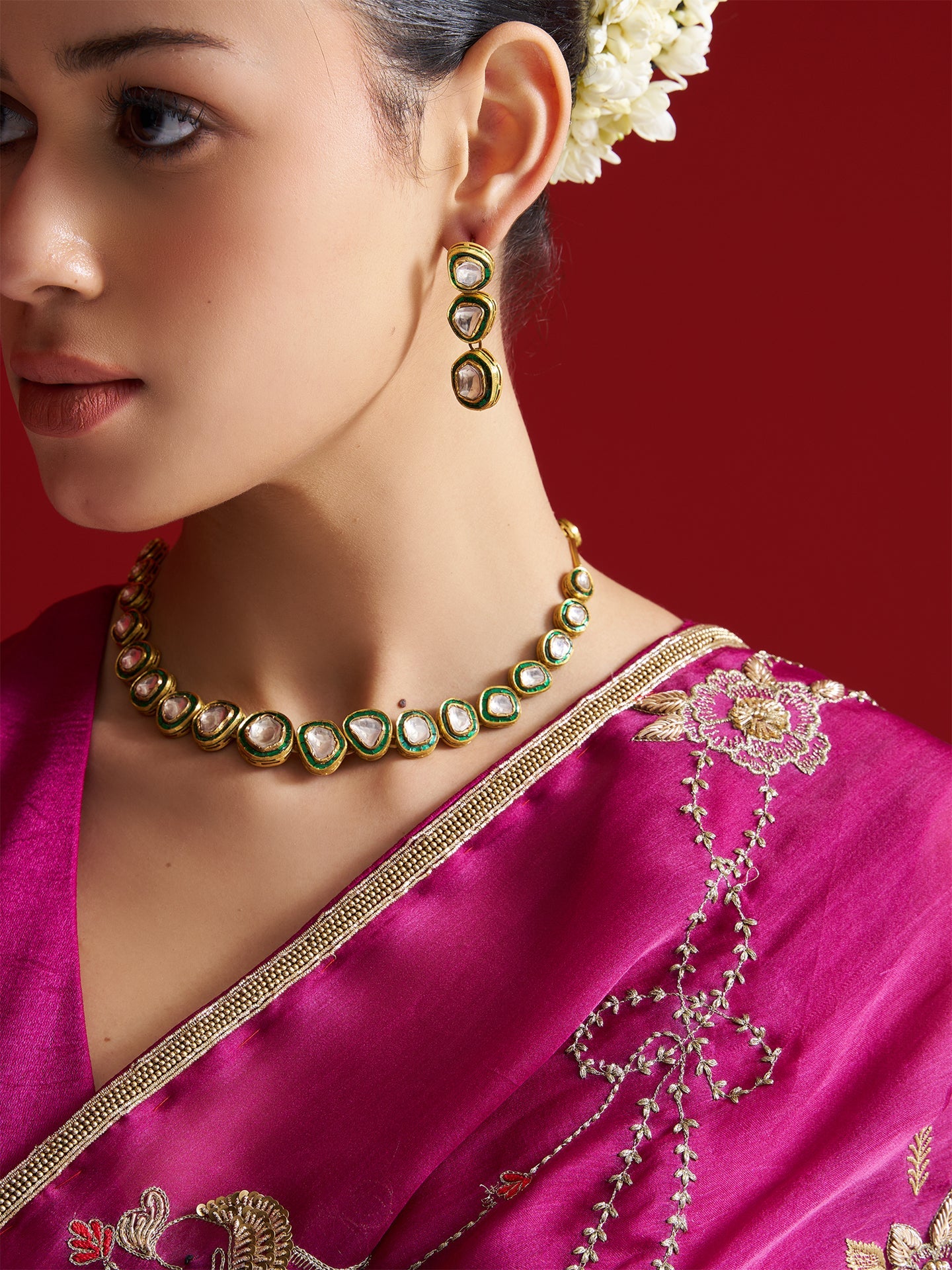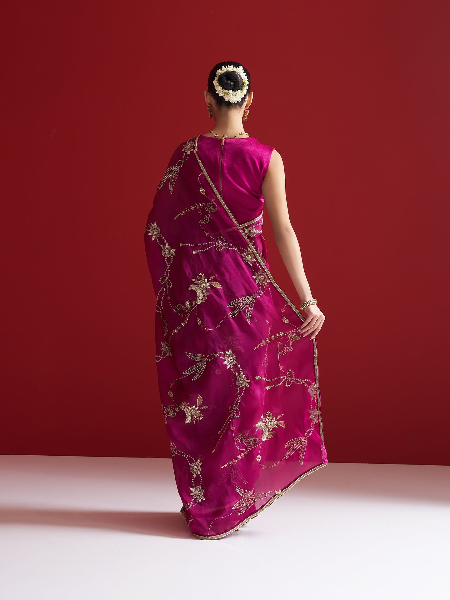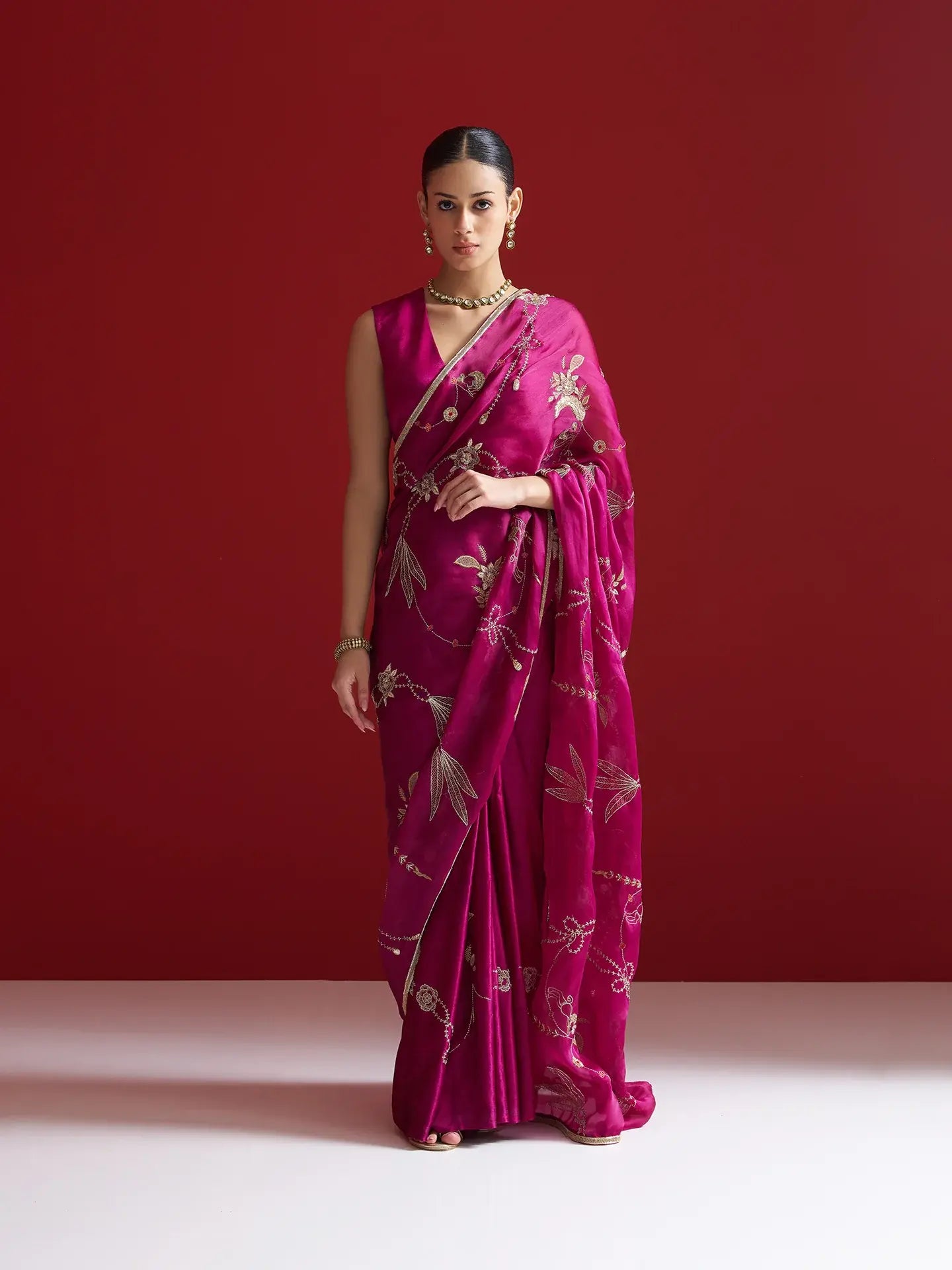 Crafted in luxurious handwoven Gajji silk and Silk Organza, this fully embroidered saree is a celebration of fine craftsmanship and heritage. Adorned with intricate floral patterns and majestic Yali motifs-powerful mythical guardians symbolizing strength and courage, the embroidery is brought to life using dabka, naqshi, and resham. A flowing silk organza pallu adds lightness and movement, creating a striking contrast. It is paired with a solid blouse featuring a deep V-neck and metal zipper closure at the back.