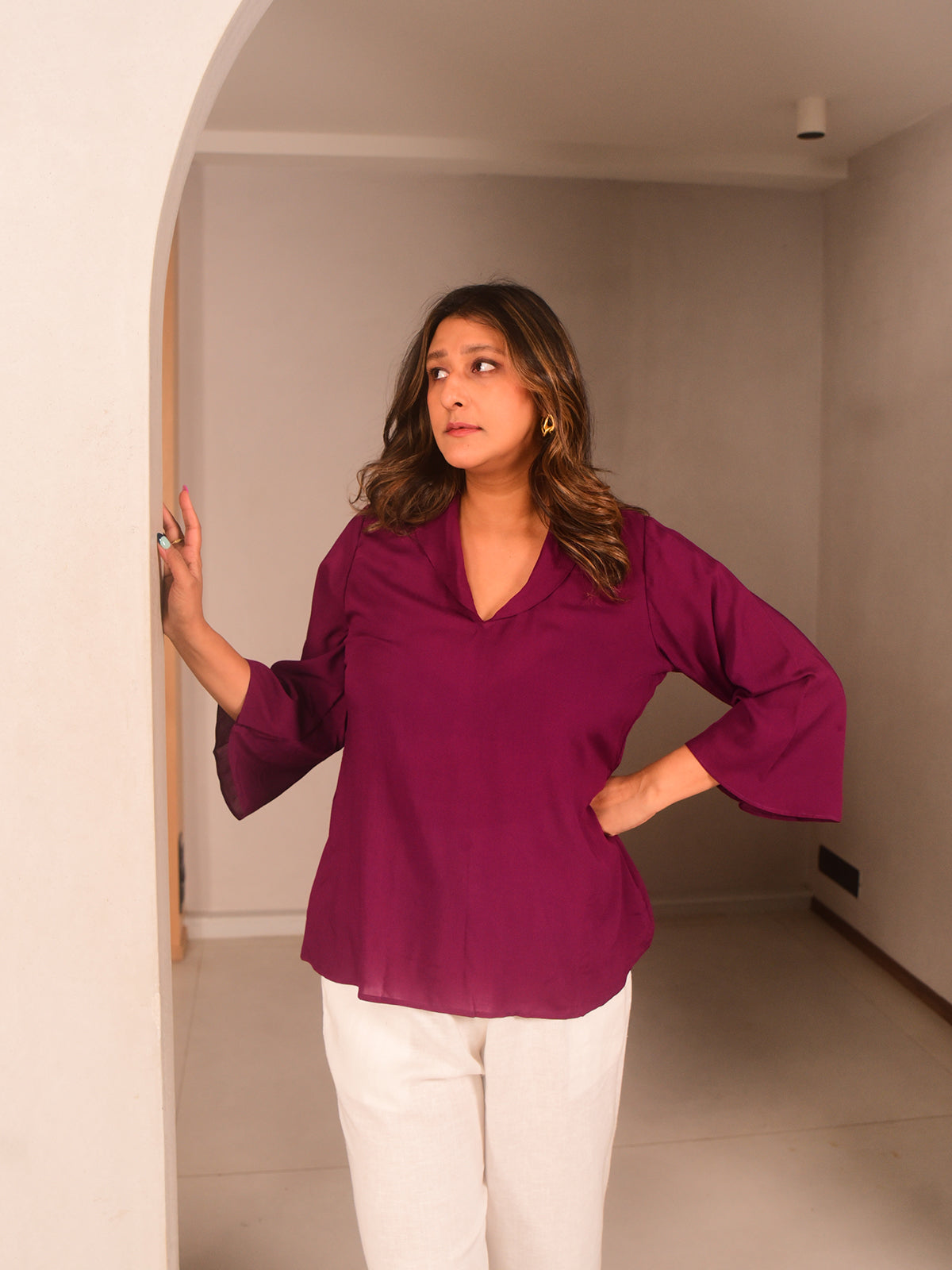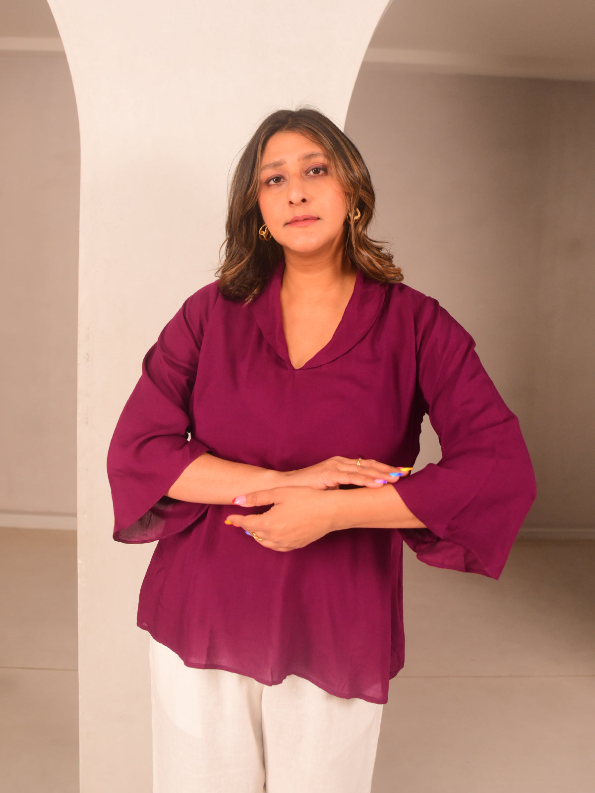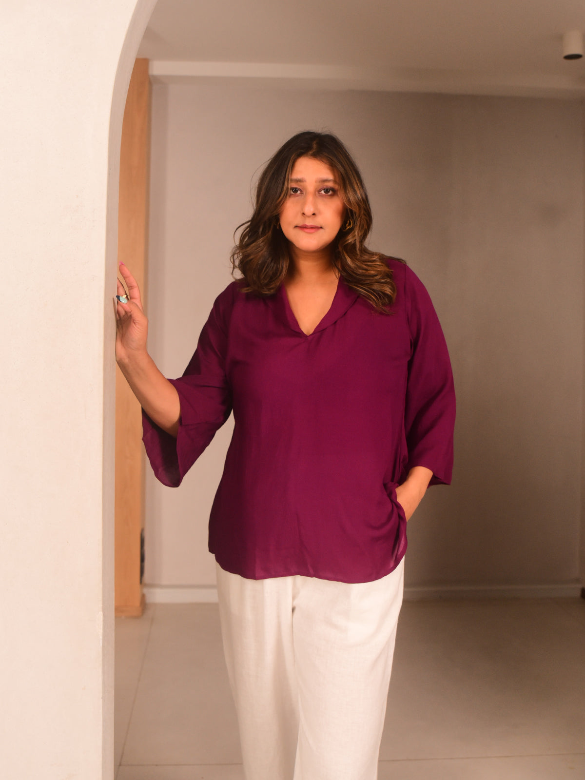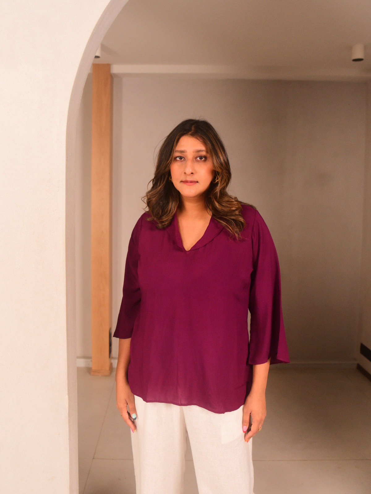 Crafted in our dark purple modal cotton, the Isa Top features a distinctive flap detail at the V-neckline, relaxed silhouette, and high-low bell sleeves for movement and elegance. Its mid-length sleeves offer seasonless wearability, making it a stylish layering piece. Tuck into high-waisted pants or pair with structured skirts for a polished office look. Ideal for team meetings, creative brainstorms, or casual work-from-home days.