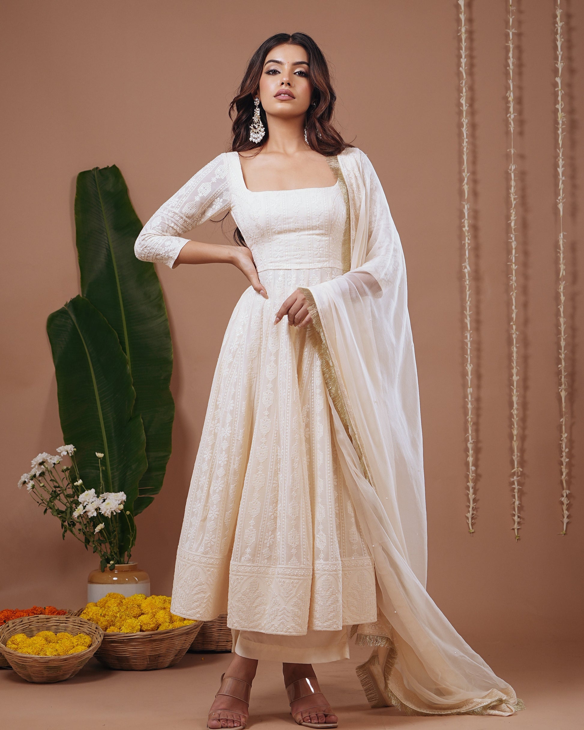 Ivory Chikankari Anarkali Suit Set (Set of 3)
