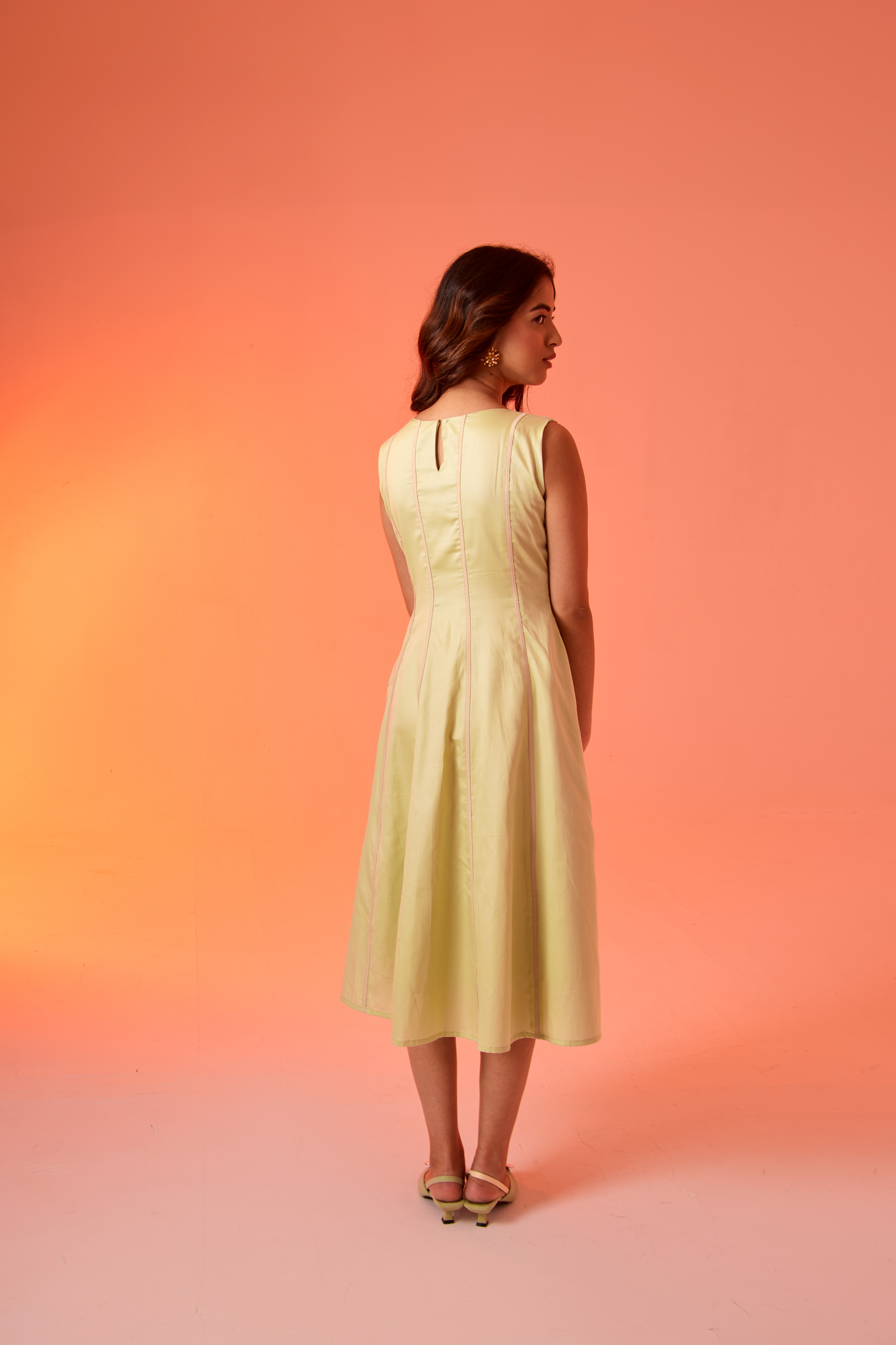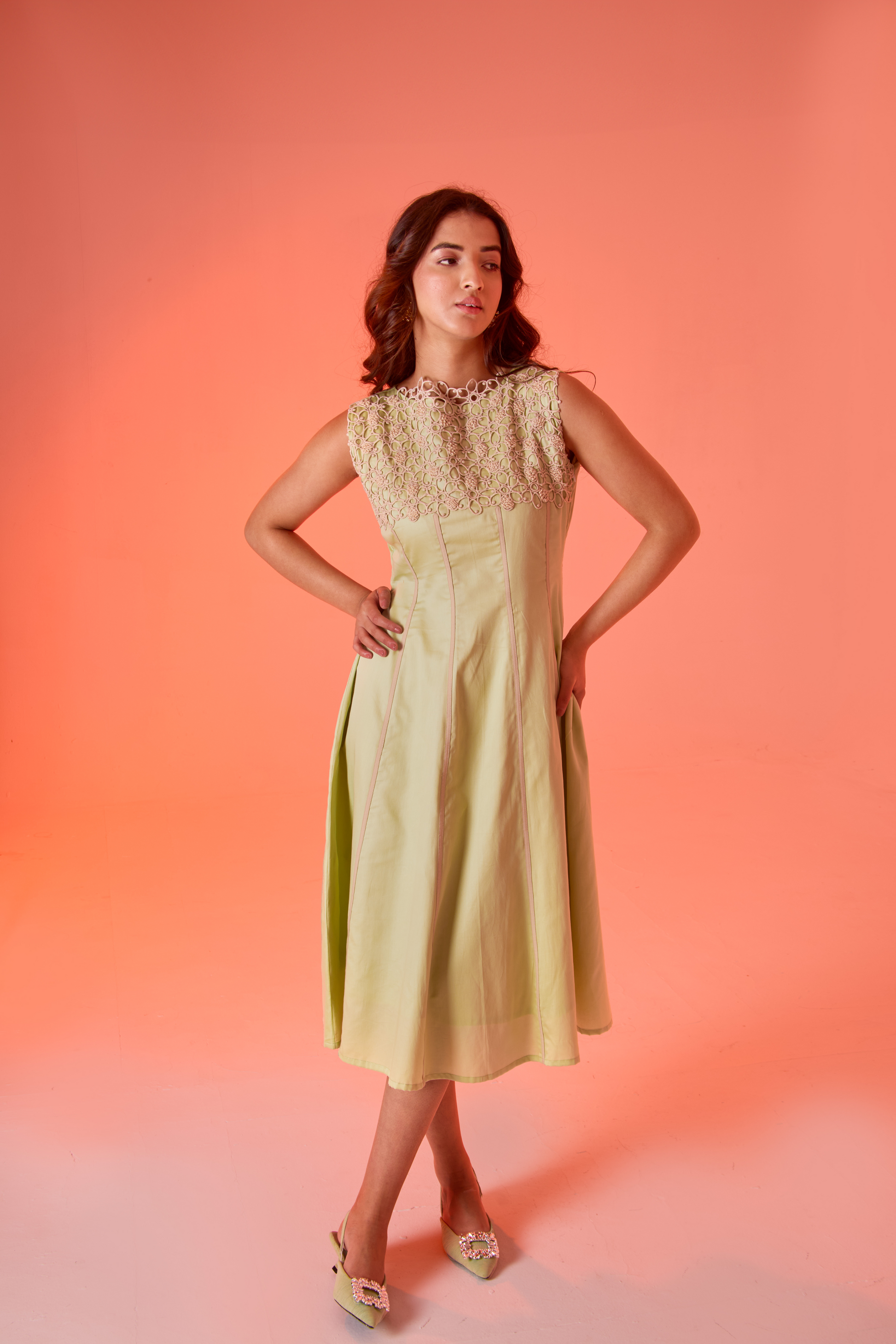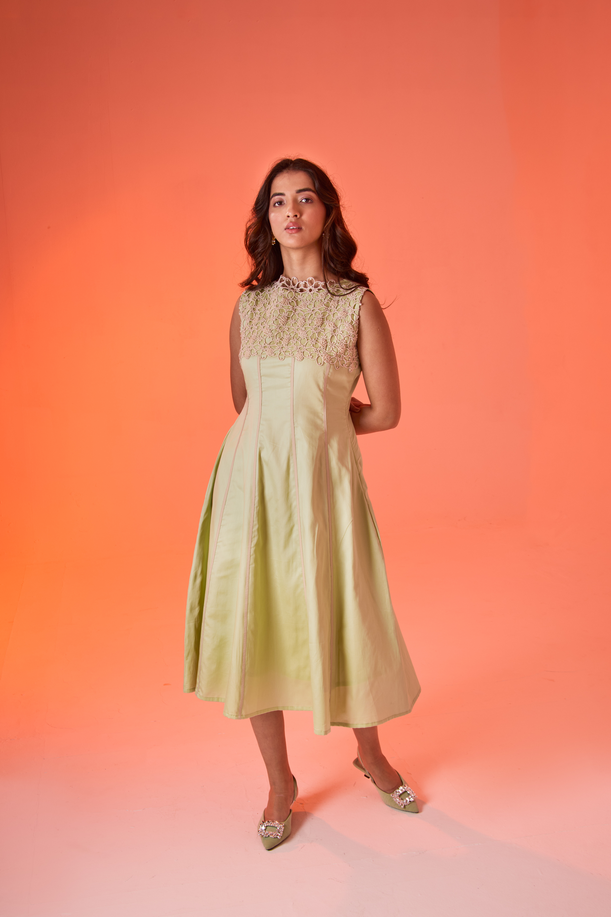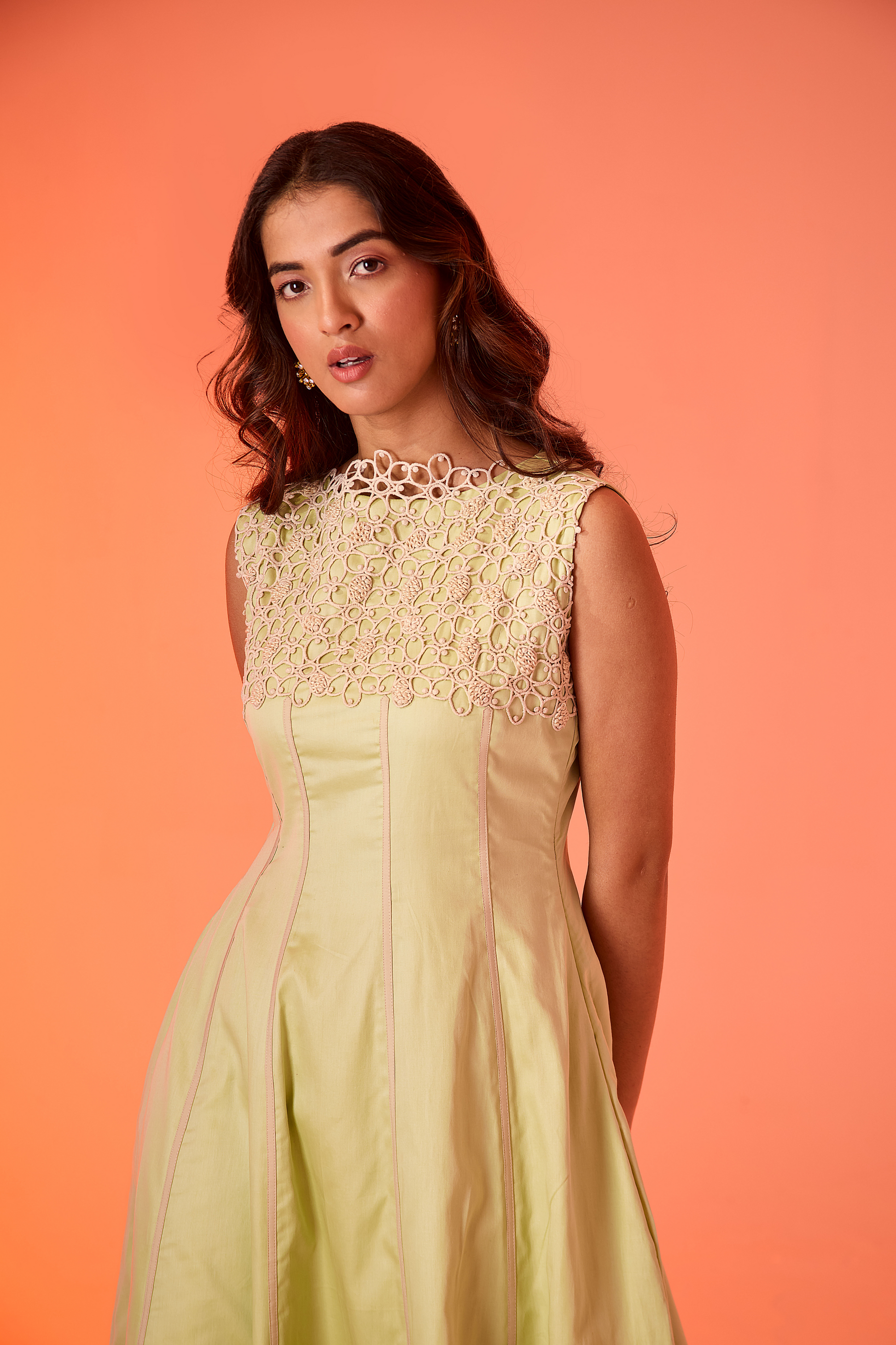 This fit-and-flare panel cut dress is enhanced with elegant lace accents and meticulously crafted handwork. The dress flows effortlessly, showcasing timeless femininity and artisanal craftsmanship.