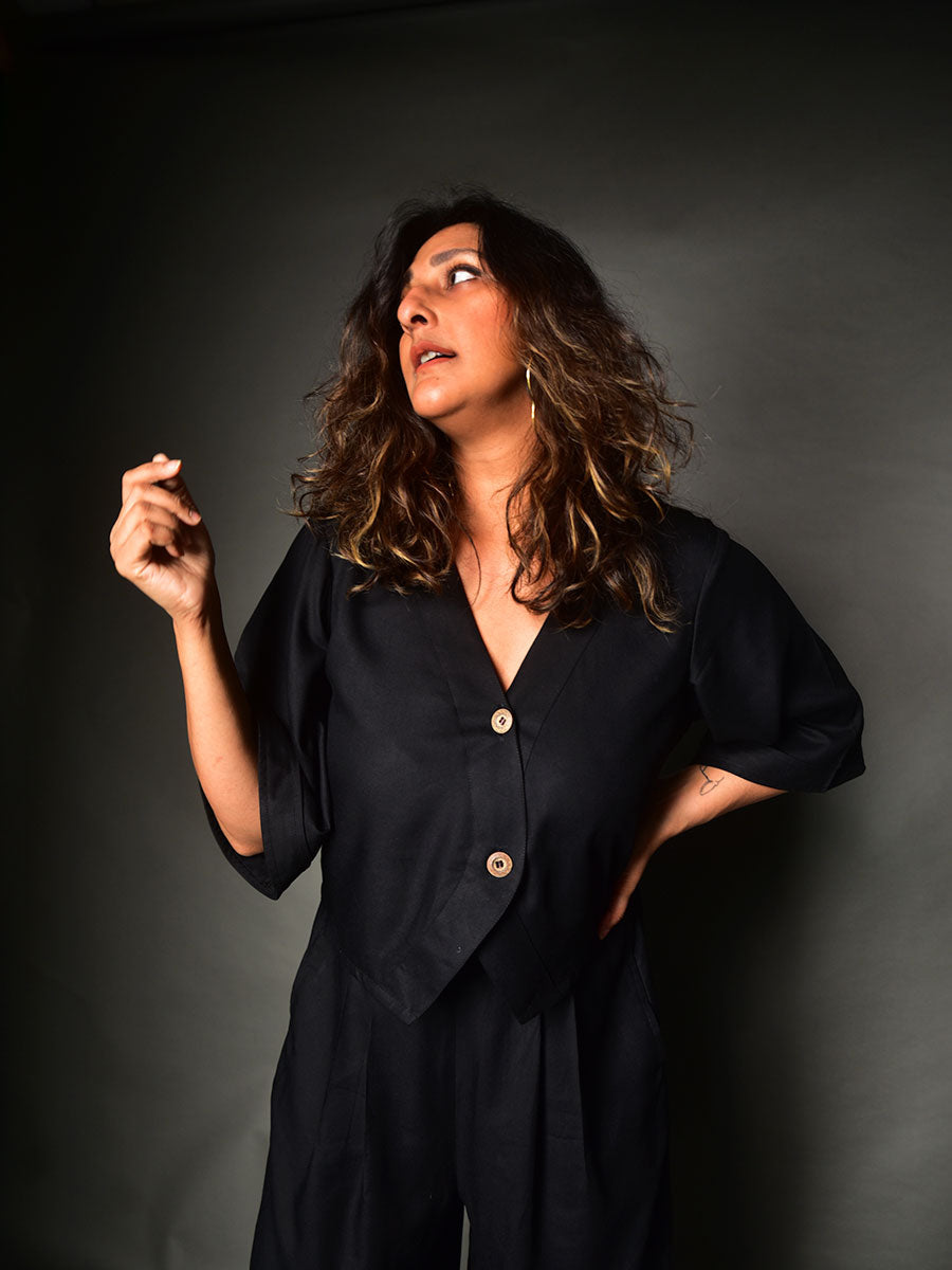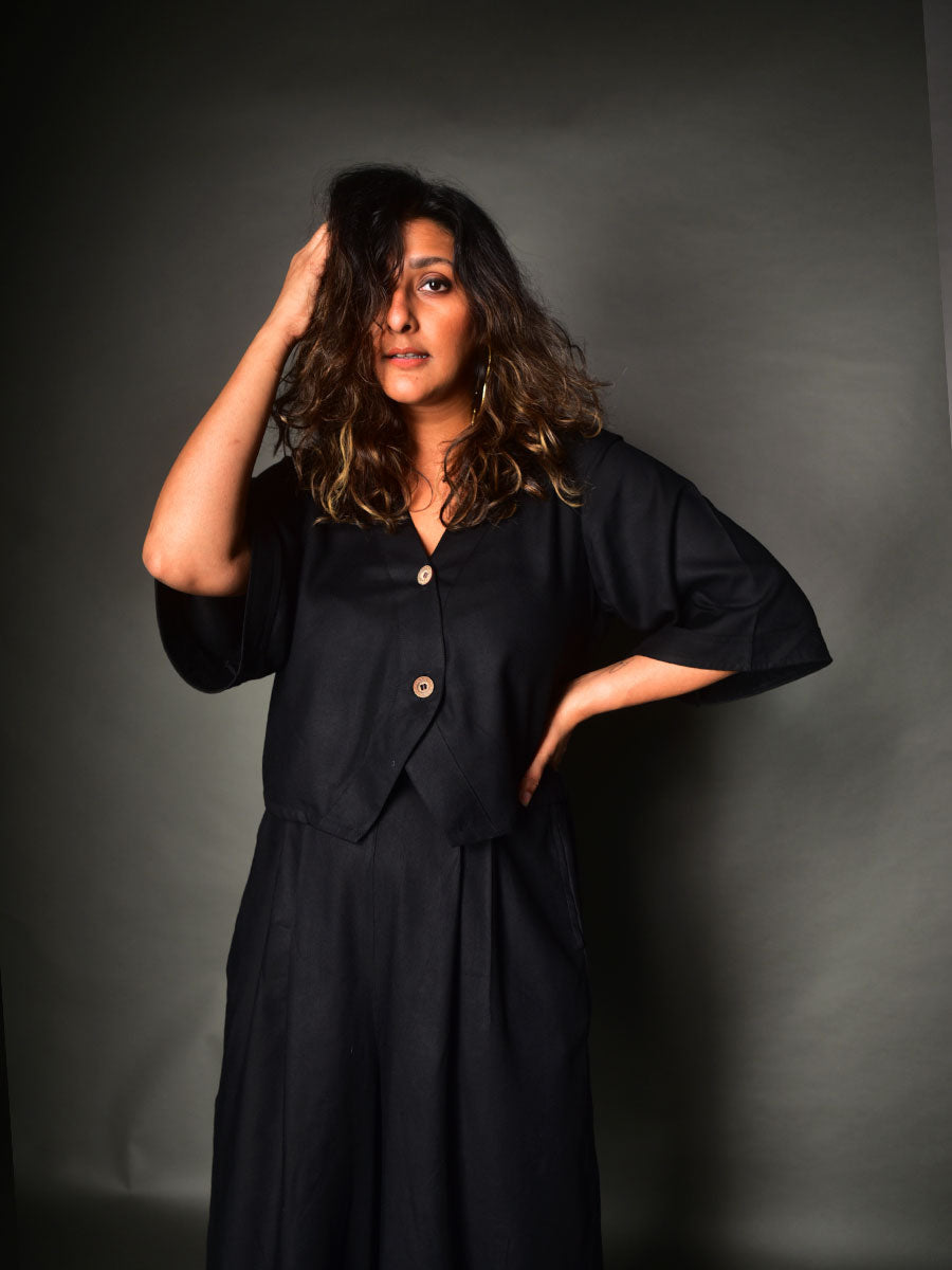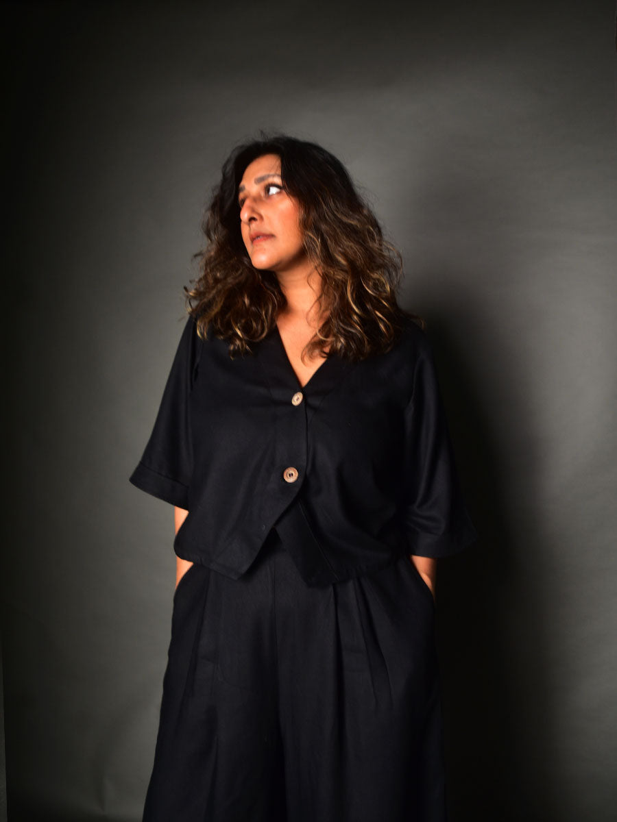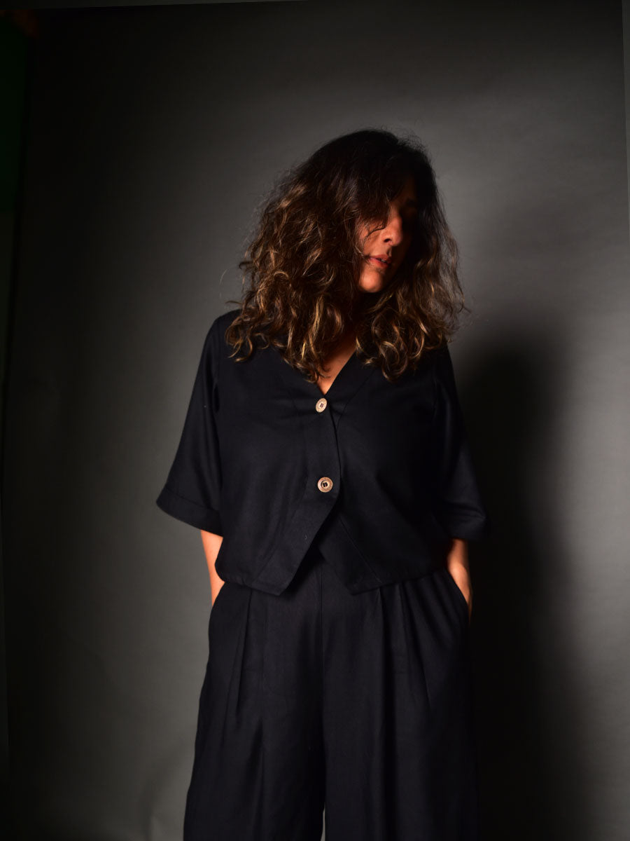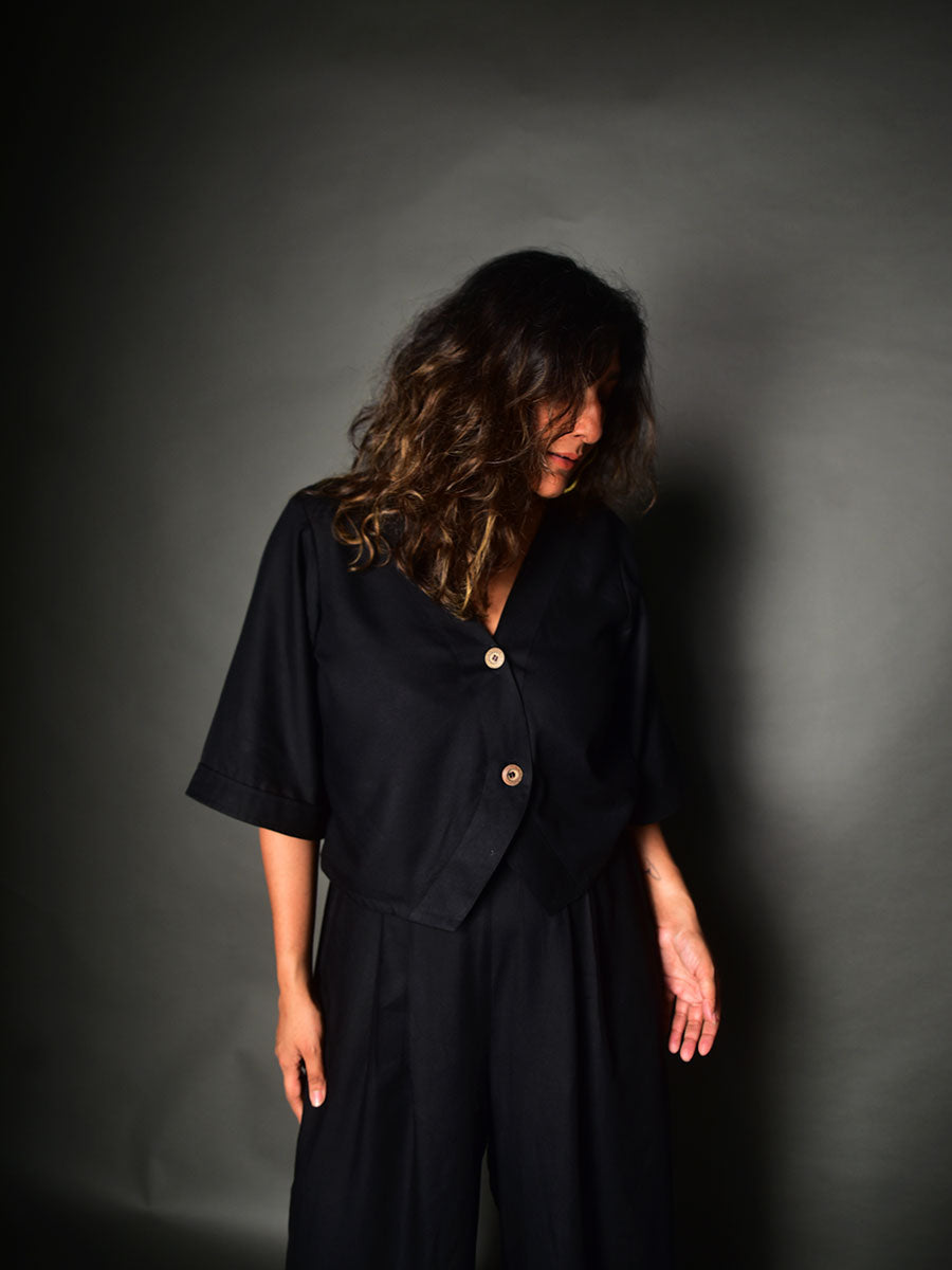 This shirt-meets-blouse is a touch of elegance for your staples. Cut in black cotton, it has flared sleeves and loose bodice. An overlapping placket in the front complete with wooden buttons. Pair with our Juno Pants for the full look.