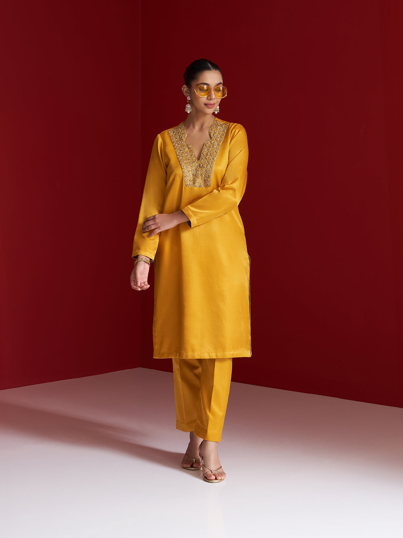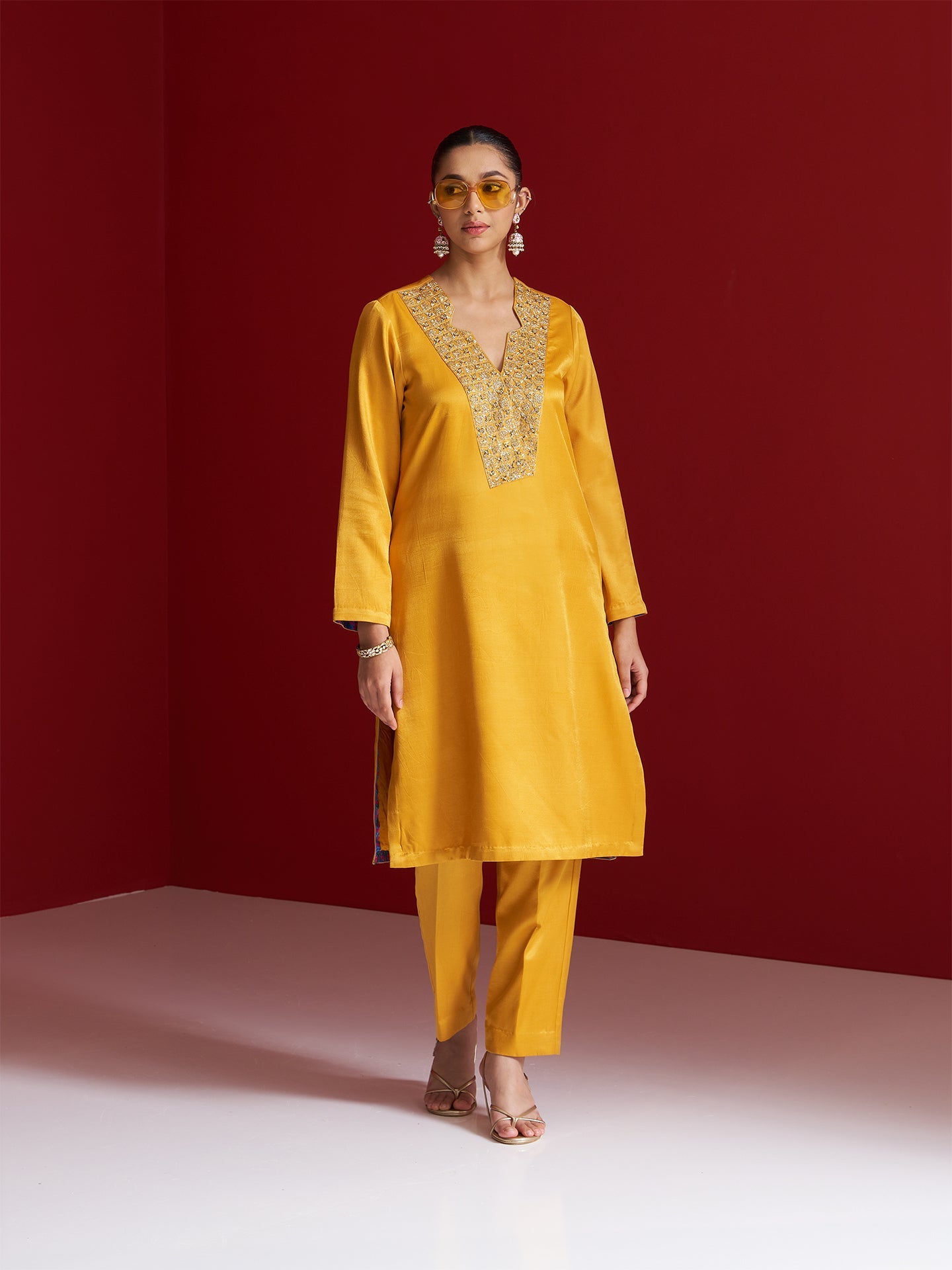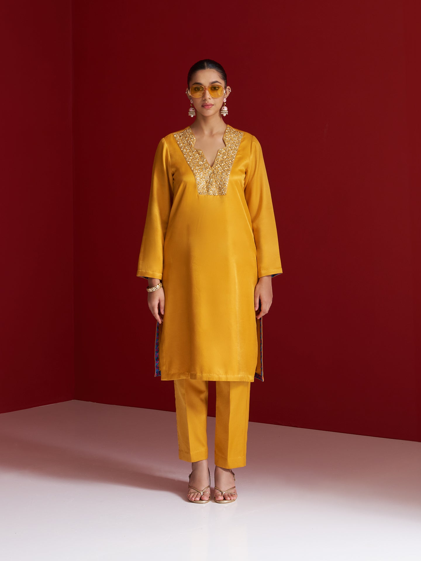 Bright and festive, this mustard kurta set adds warmth and richness to your wardrobe. The kurta features a beautifully hand-embroidered neckline adorned with dabka, naqshi, and sequins, lending a traditional yet striking appeal. Crafted in luxurious silk, the set is completed with classic straight pants-perfect for daytime festivities or elegant evening gatherings.