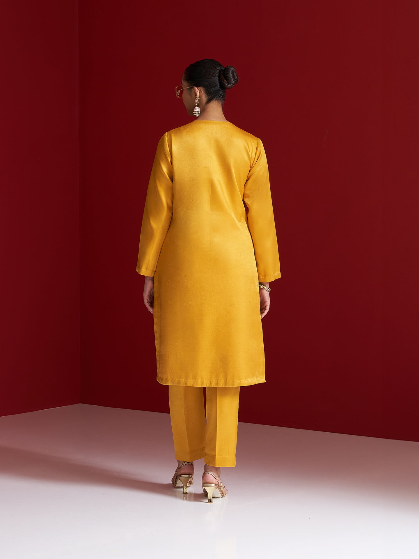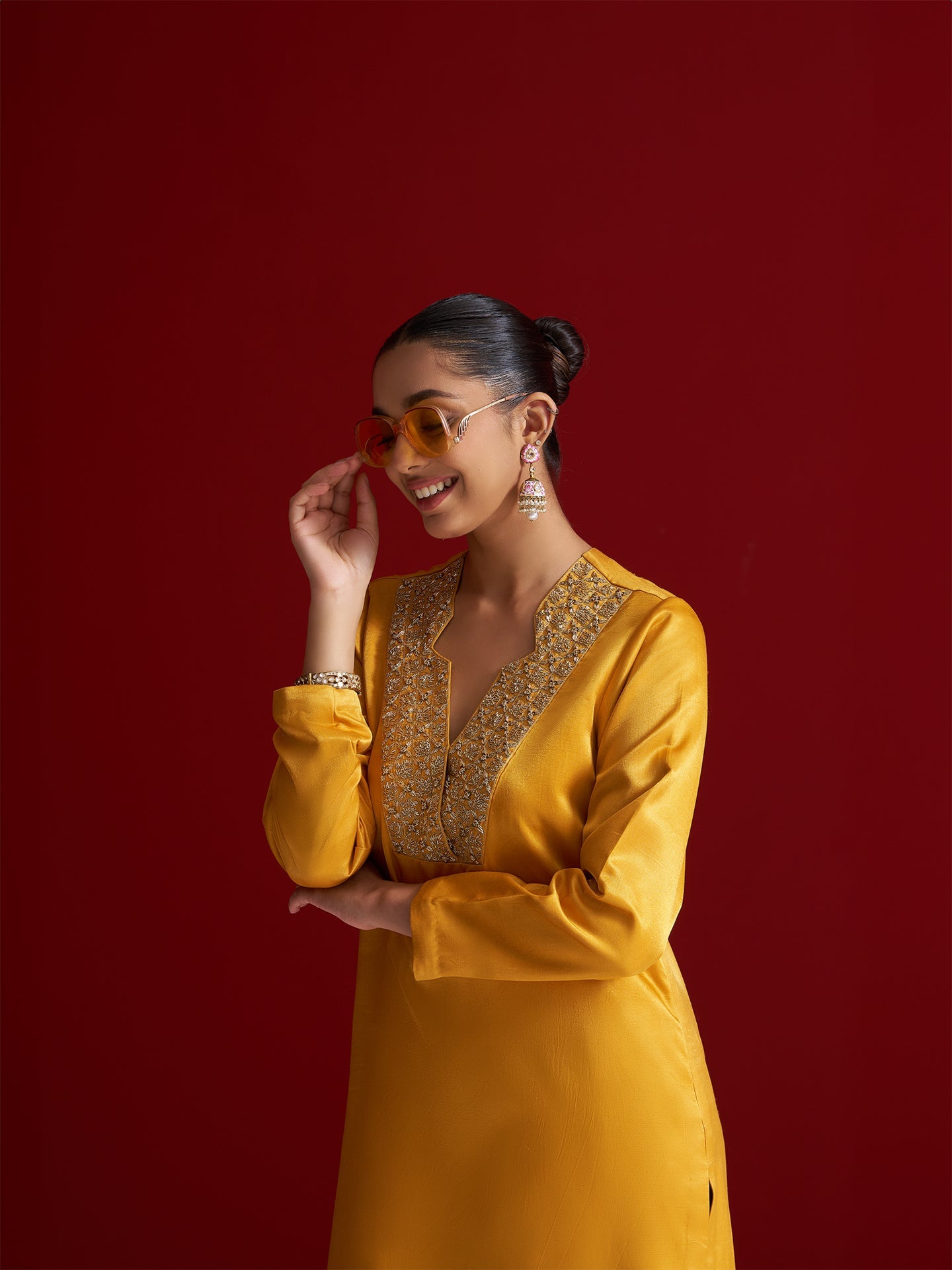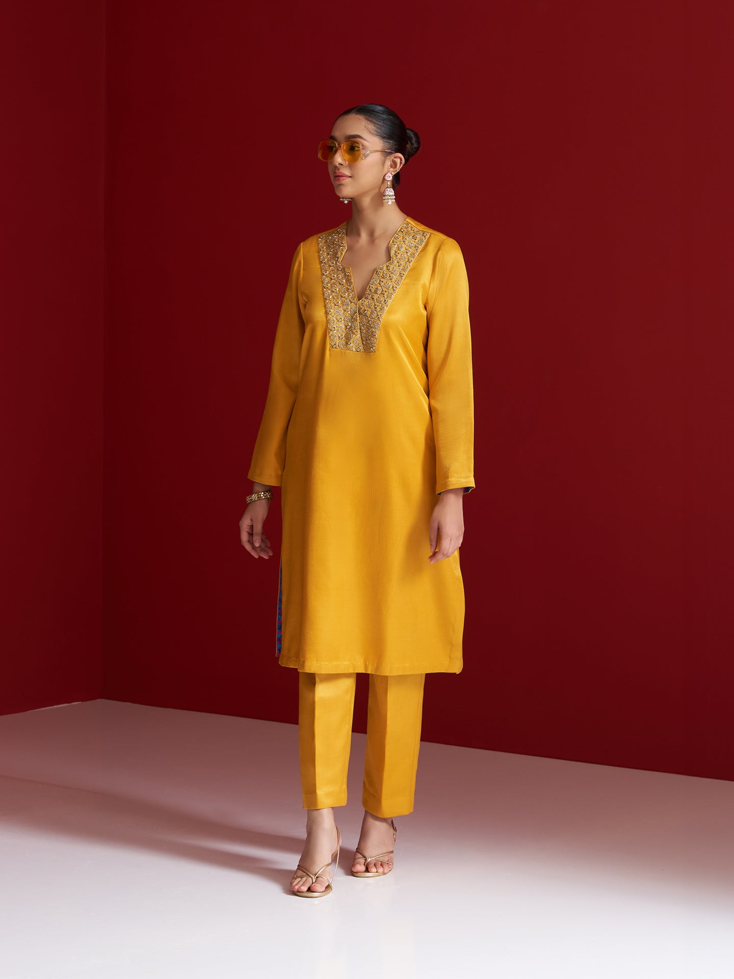 Bright and festive, this mustard kurta set adds warmth and richness to your wardrobe. The kurta features a beautifully hand-embroidered neckline adorned with dabka, naqshi, and sequins, lending a traditional yet striking appeal. Crafted in luxurious silk, the set is completed with classic straight pants-perfect for daytime festivities or elegant evening gatherings.