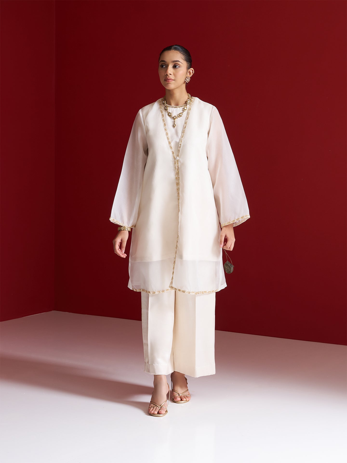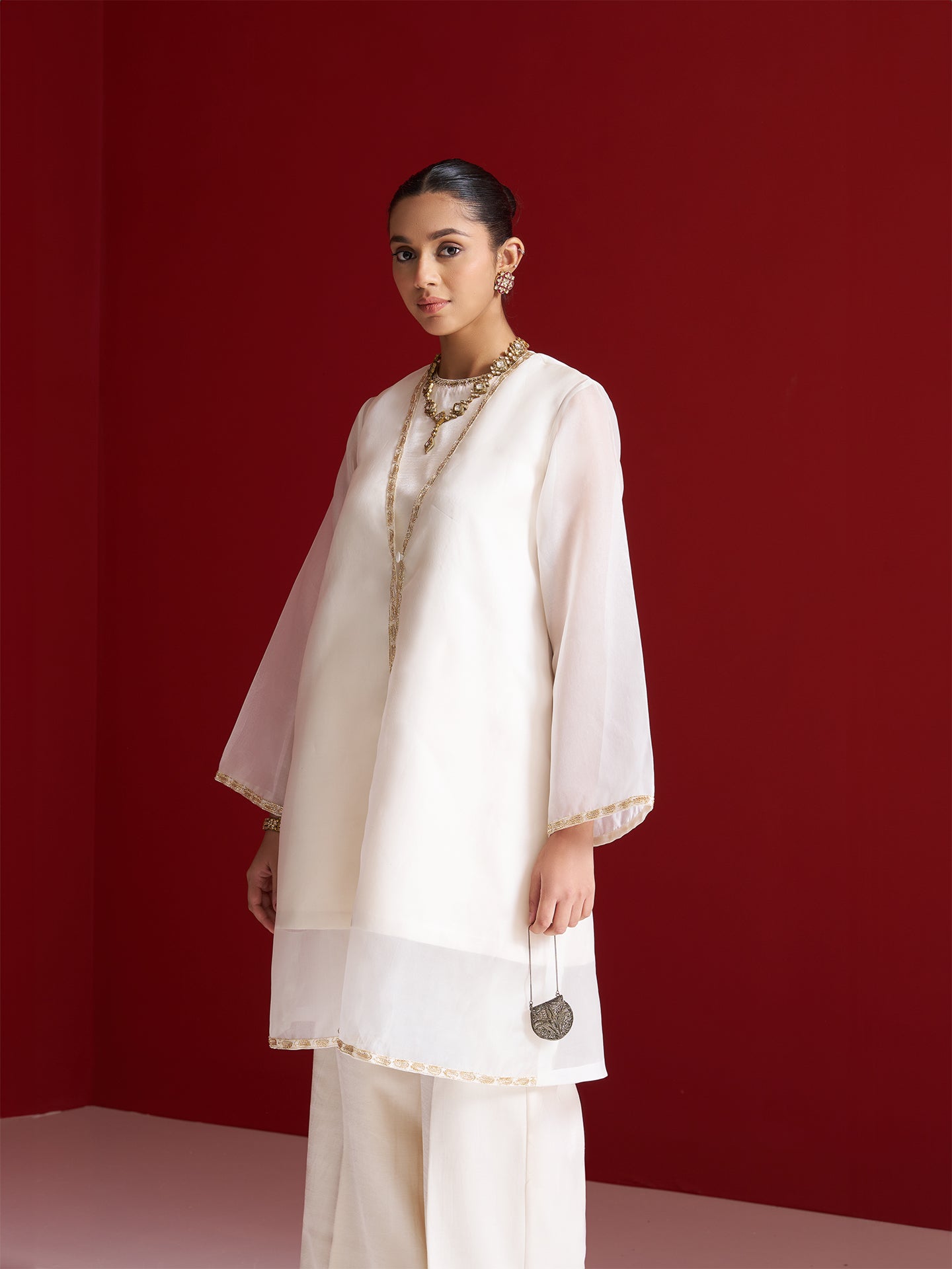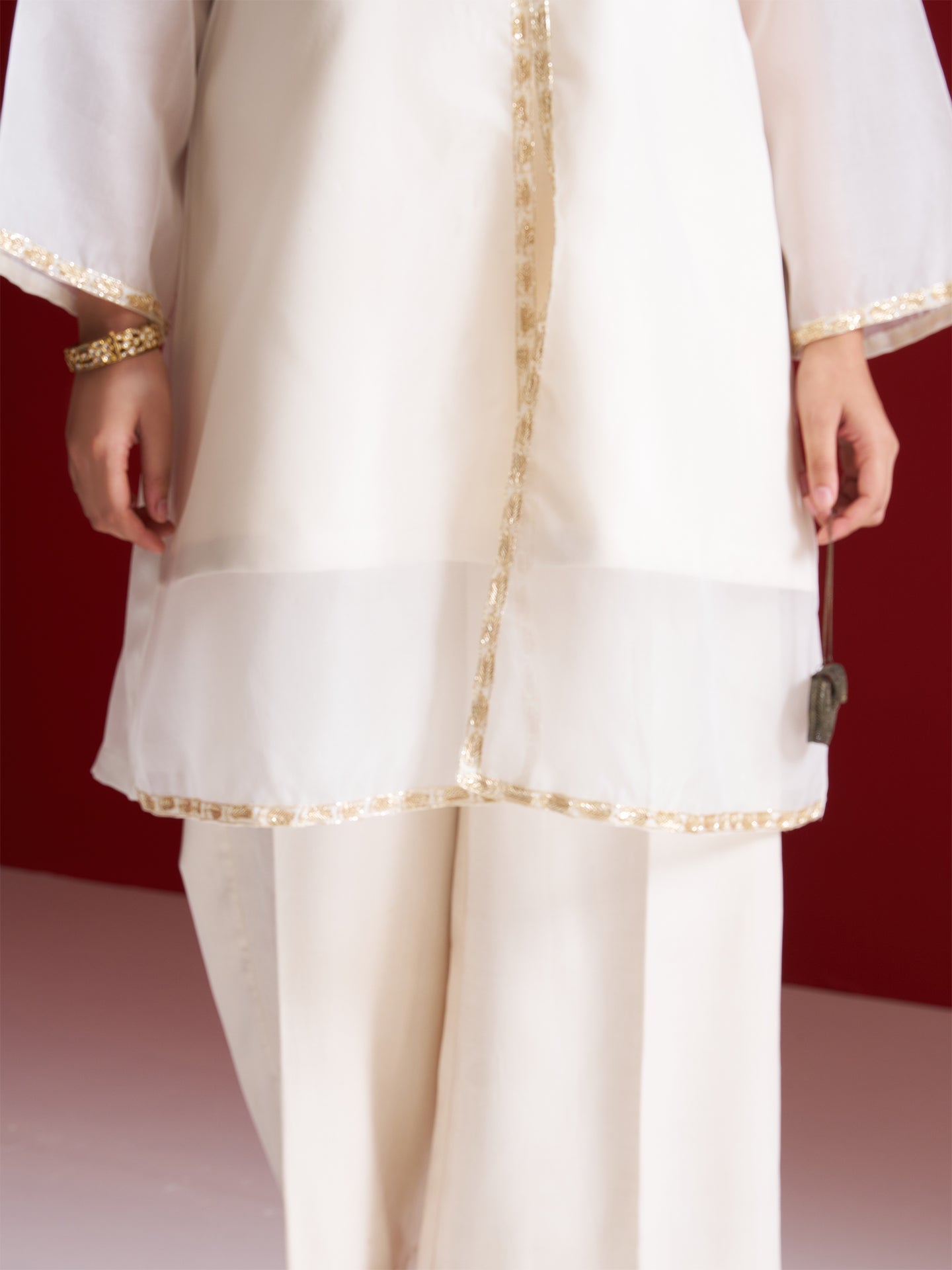 A delicate blend of sheer elegance and traditional craft, this ivory ensemble features an embroidered organza overlay adorned with intricate dabka and naqshi work. It is layered over a luxurious Gajji silk inner kurta, highlighted with fine dabka and sequin embroidery along the neckline. The look is completed with matching flared pants, perfect for festive occasions or intimate celebrations.