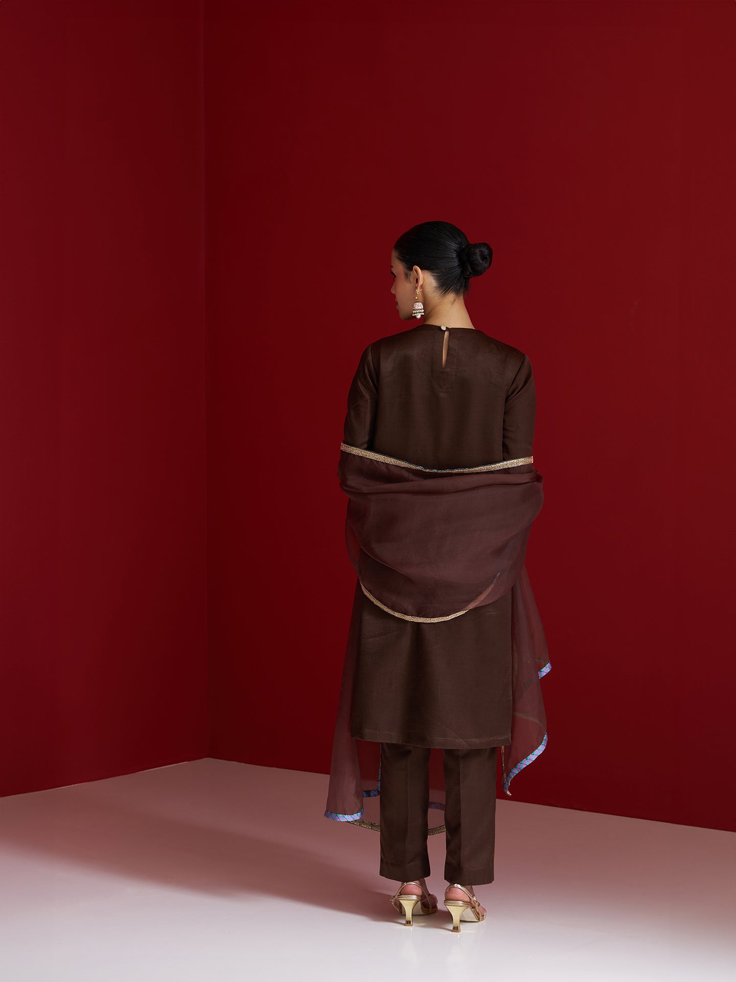 A sheer silk organza dupatta featuring a delicate border, intricately embellished with moti and naqshi work for an elegant finish.