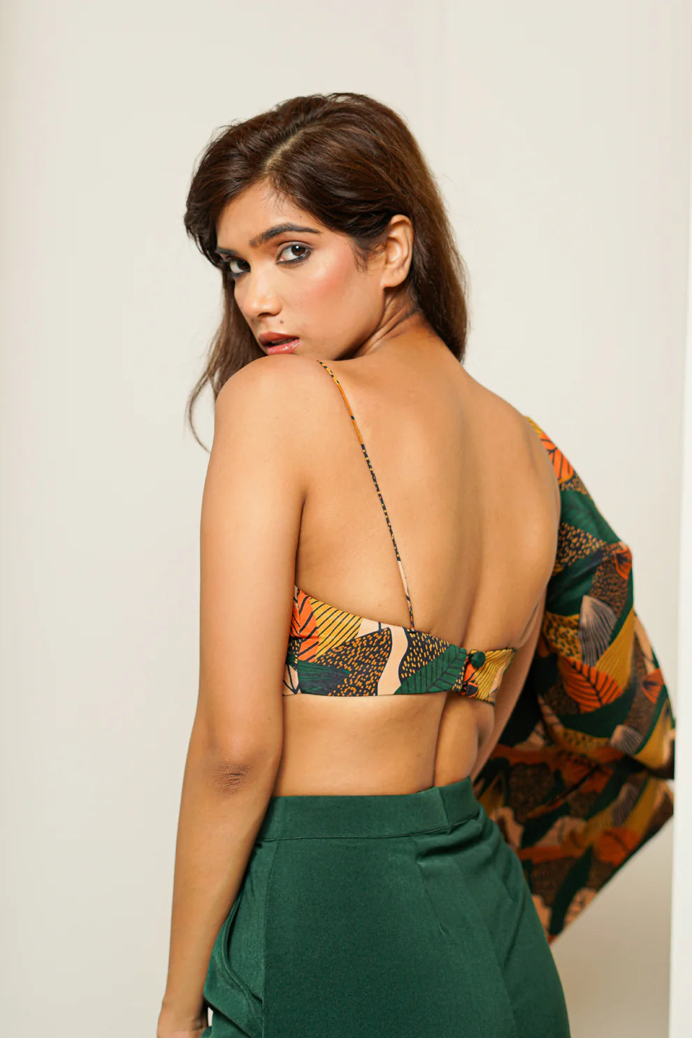 - Bold strappy padded bralette with same digital leaf print design .