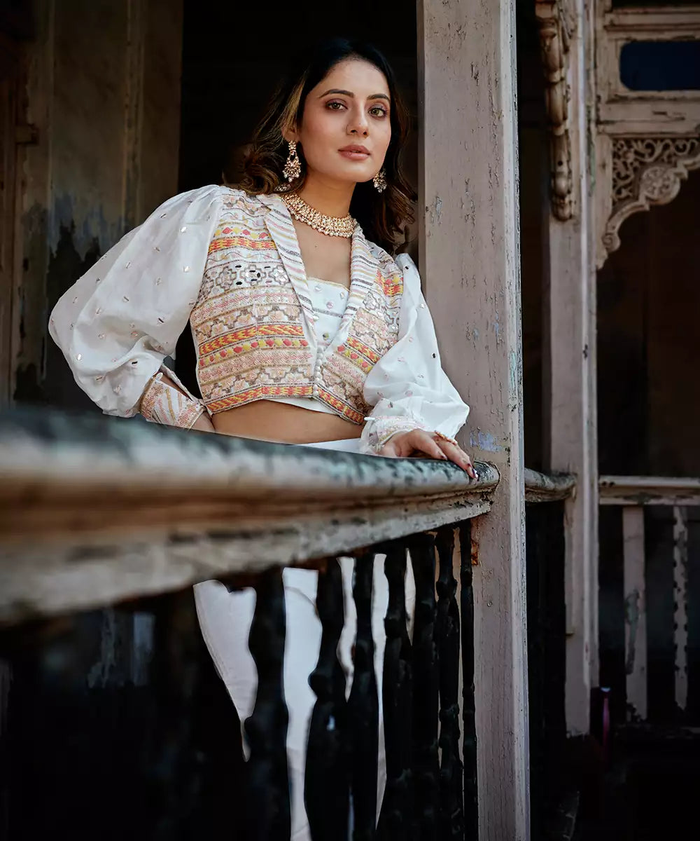 Versatile Multi Purpose 4 Piece Set Consisting Of White Silk Pants With Bustier And Crop Jacket Having Multi Color Intricate Embroidery With Ombre Pleated Lehariya Shrug .