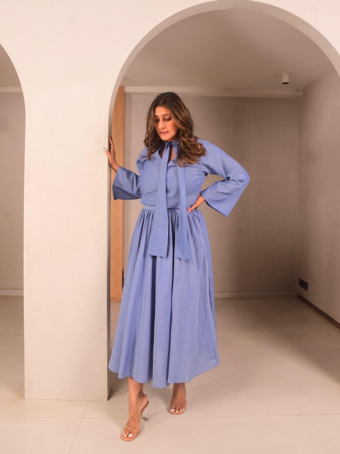 This statement top in dark blue cotton features wide 4" tie-up straps, a V-neckline, and full-length bell sleeves, adding drama to everyday workwear. The versatile tie-ups can be left loose or tied into a bow, giving you styling flexibility. Pair with straight-leg trousers or high-waisted skirts depending on the vibe you want to achieve. Best for fashion-forward office days or creative workspaces.