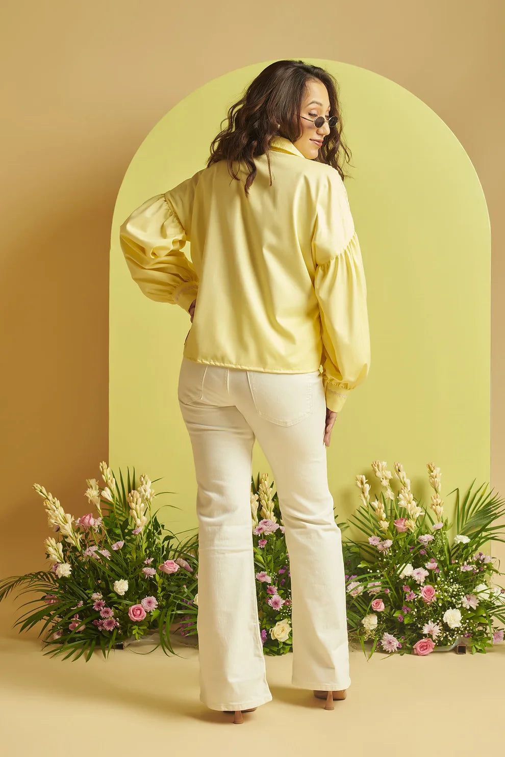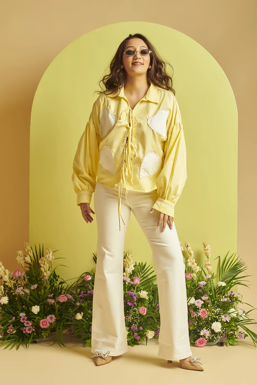A relax fit shirt with bow tie ups aqnd heart patches for detailing