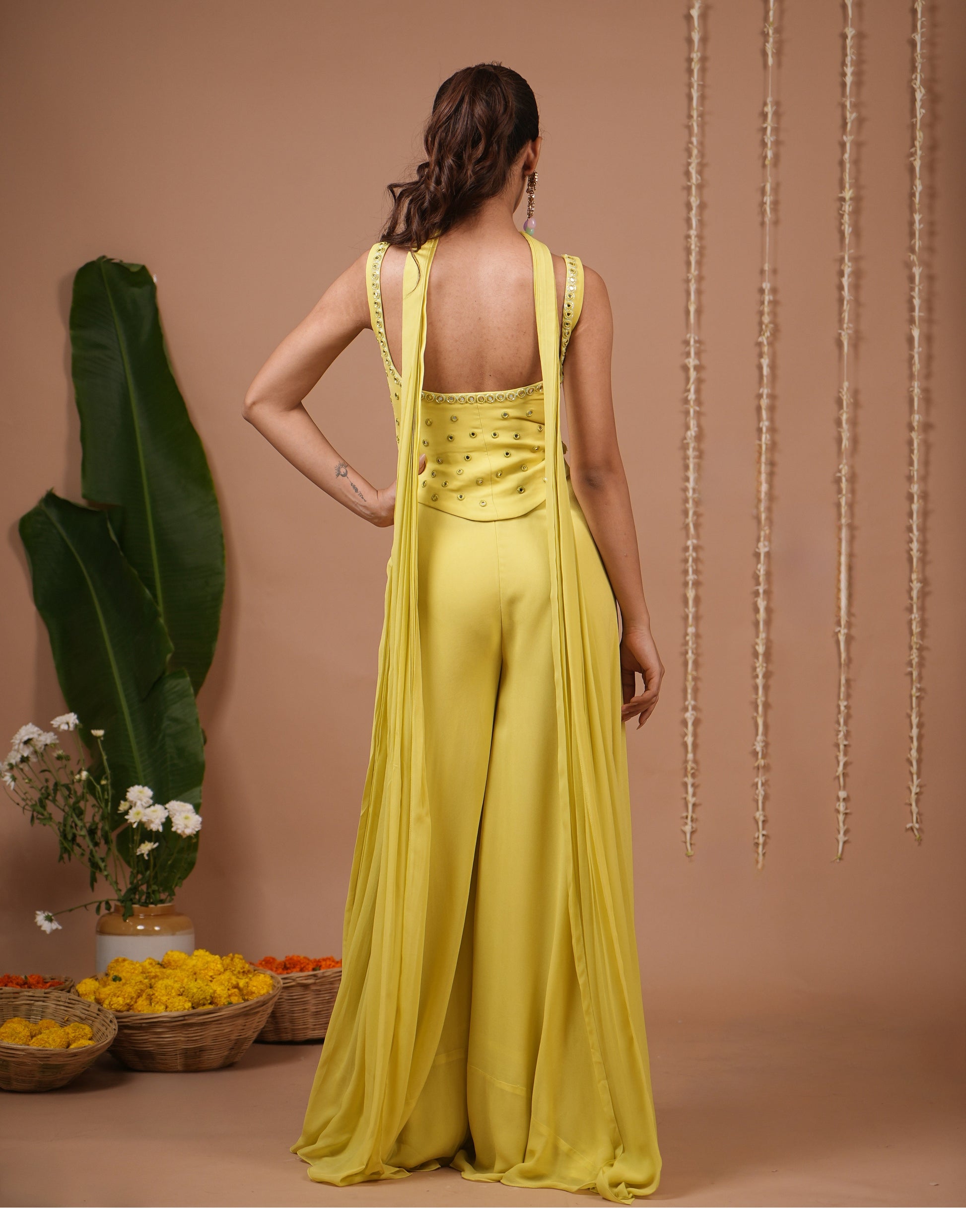 Lightweight matching lime choker dupatta with mirror work, draped around the neck like a scarf.