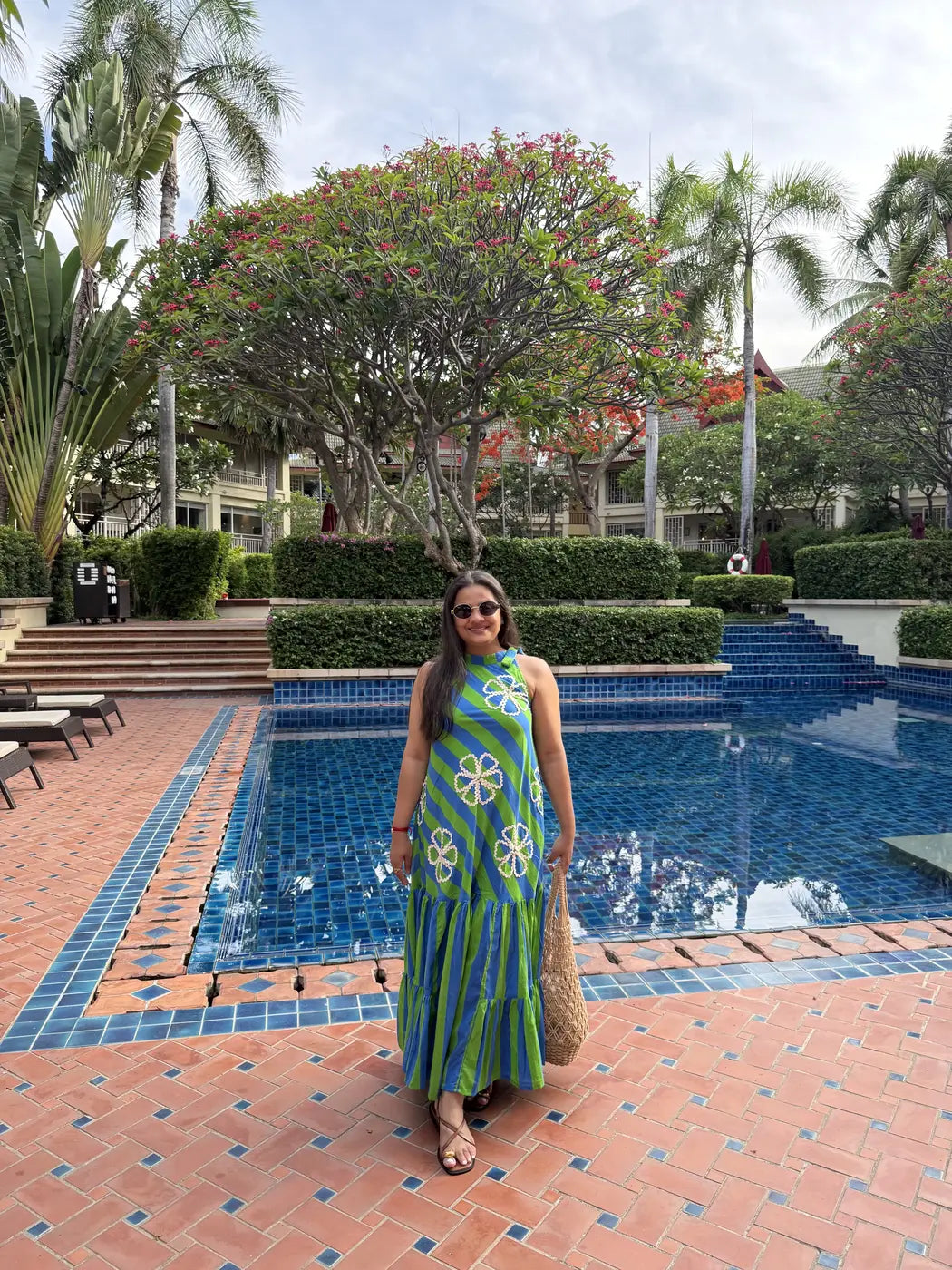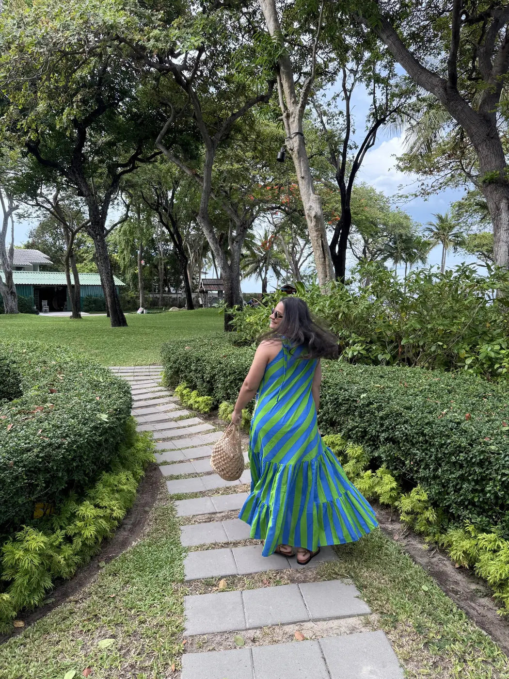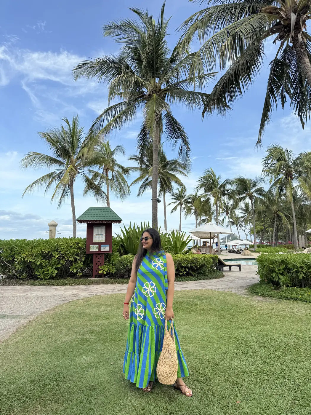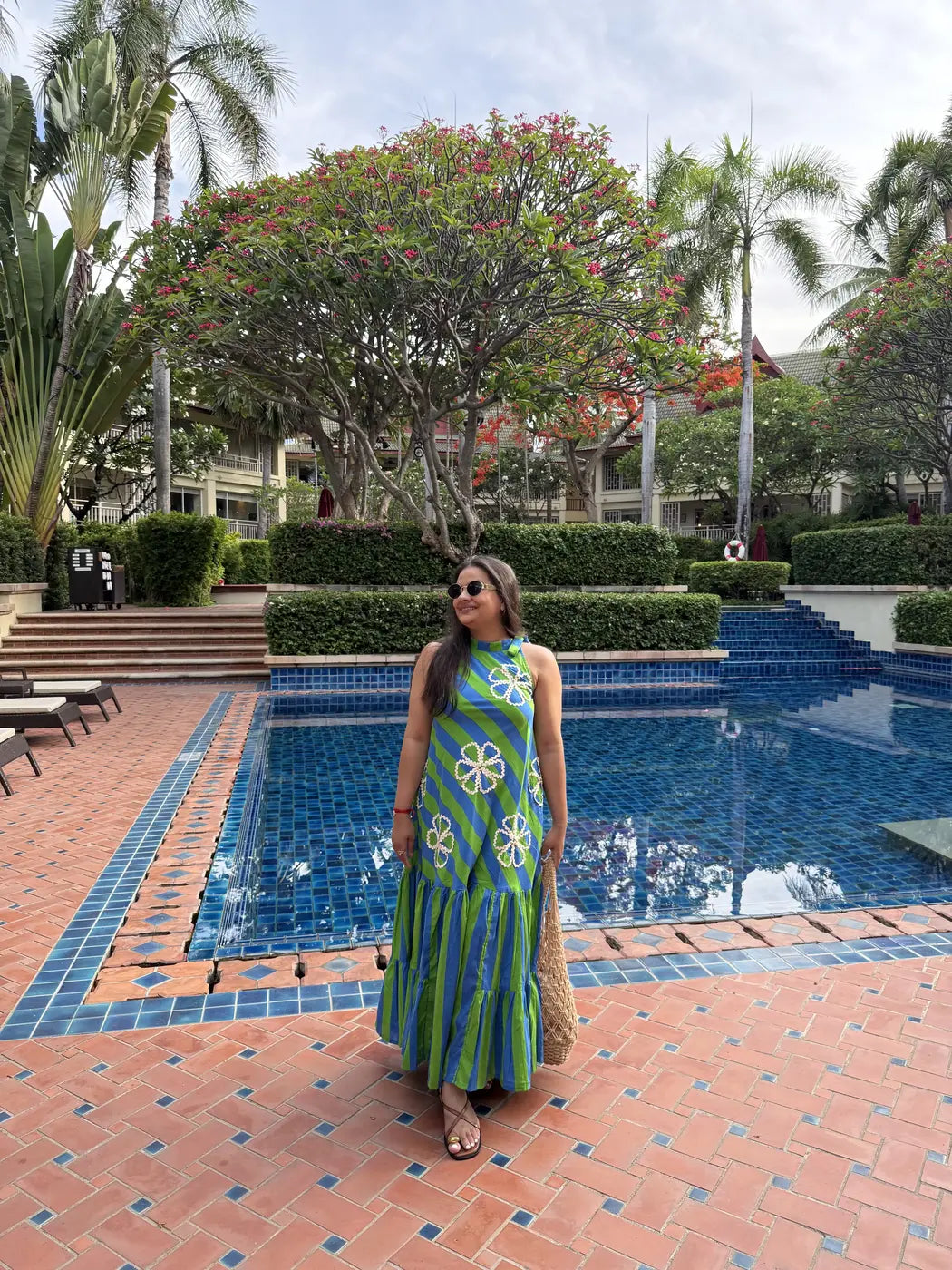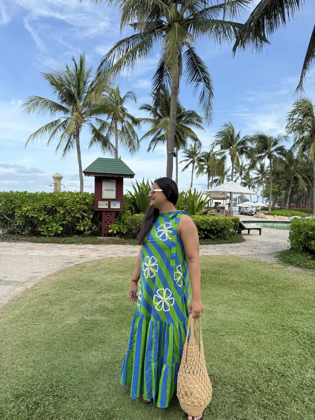 This vibrant blue and green maxi dress from KM Label exudes a lively, summery charm, perfect for beachwear or casual resort outings. The sleeveless design features a classic round neckline and a relaxed A-line silhouette that flares out into voluminous, gathered tiers at the hem, offering graceful movement and a breezy feel. The fabric is adorned with bold diagonal stripes in alternating shades of electric blue and lime green, creating a striking visual contrast. Scattered across the dress are large white floral motifs, likely crafted using a tie-dye or resist-dyeing technique, adding a handcrafted, artistic flair. Made from a lightweight and breathable fabric, this dress balances playful style with everyday comfort, making it a standout piece for the summer wardrobe.