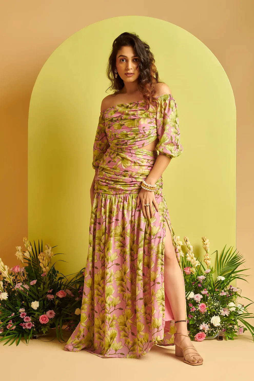 Skirt with a slit on one side and fine pleating and gathering to enhance the waist