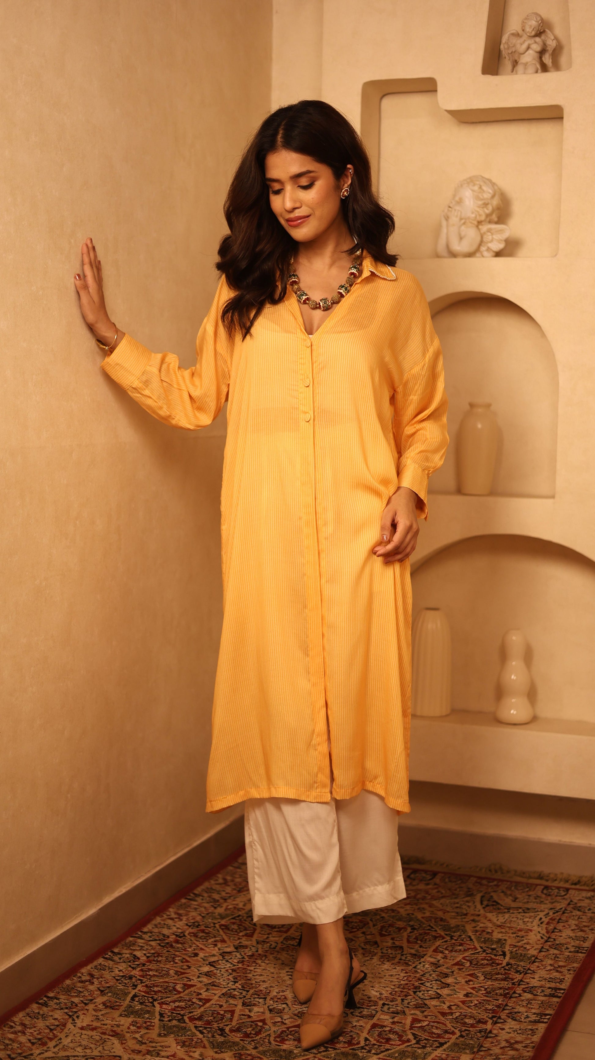 - Long sheer modal top in yellow stripes with pearl detailing on the collar and hemline and cuffed sleeves. Length - 43inches