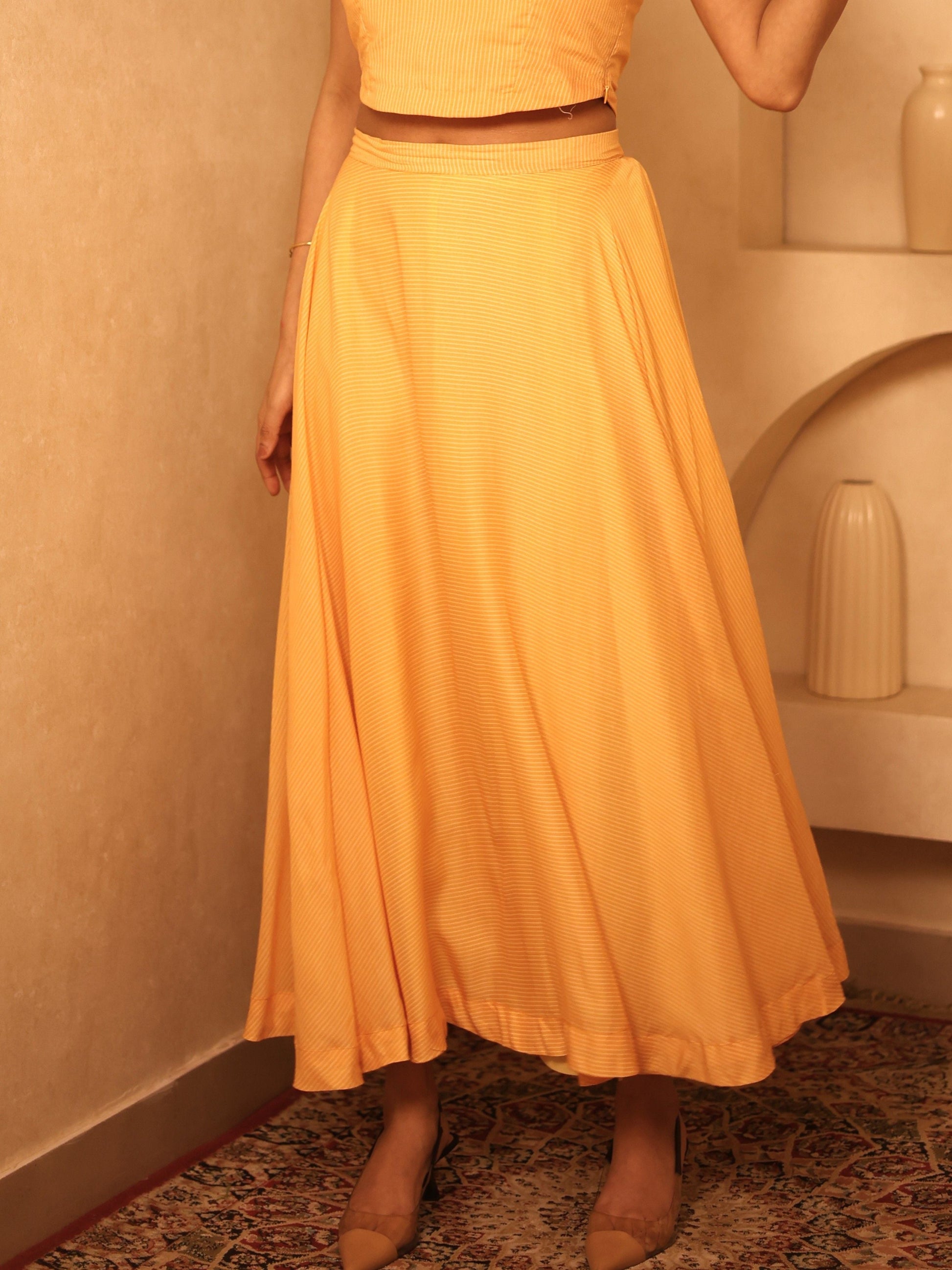 This elegant flared skirt features classic yellow stripes with a bias cut, accentuated by yellow stripe. Fully lined for added comfort, it offers practical pockets on each side. Pair it seamlessly with our coordinating crop top or your preferred blouse for a chic look.