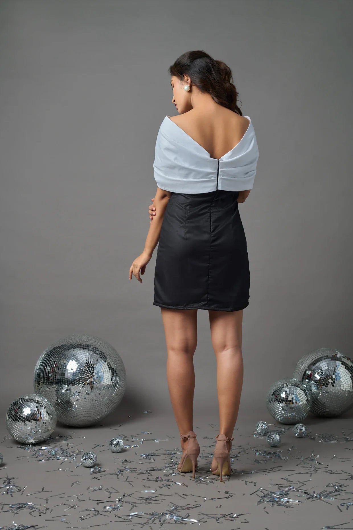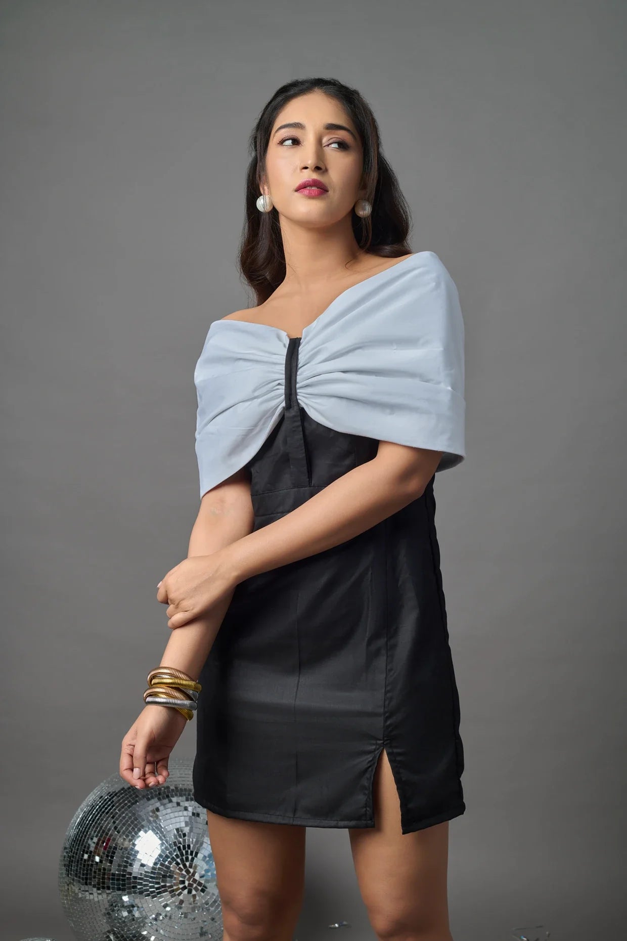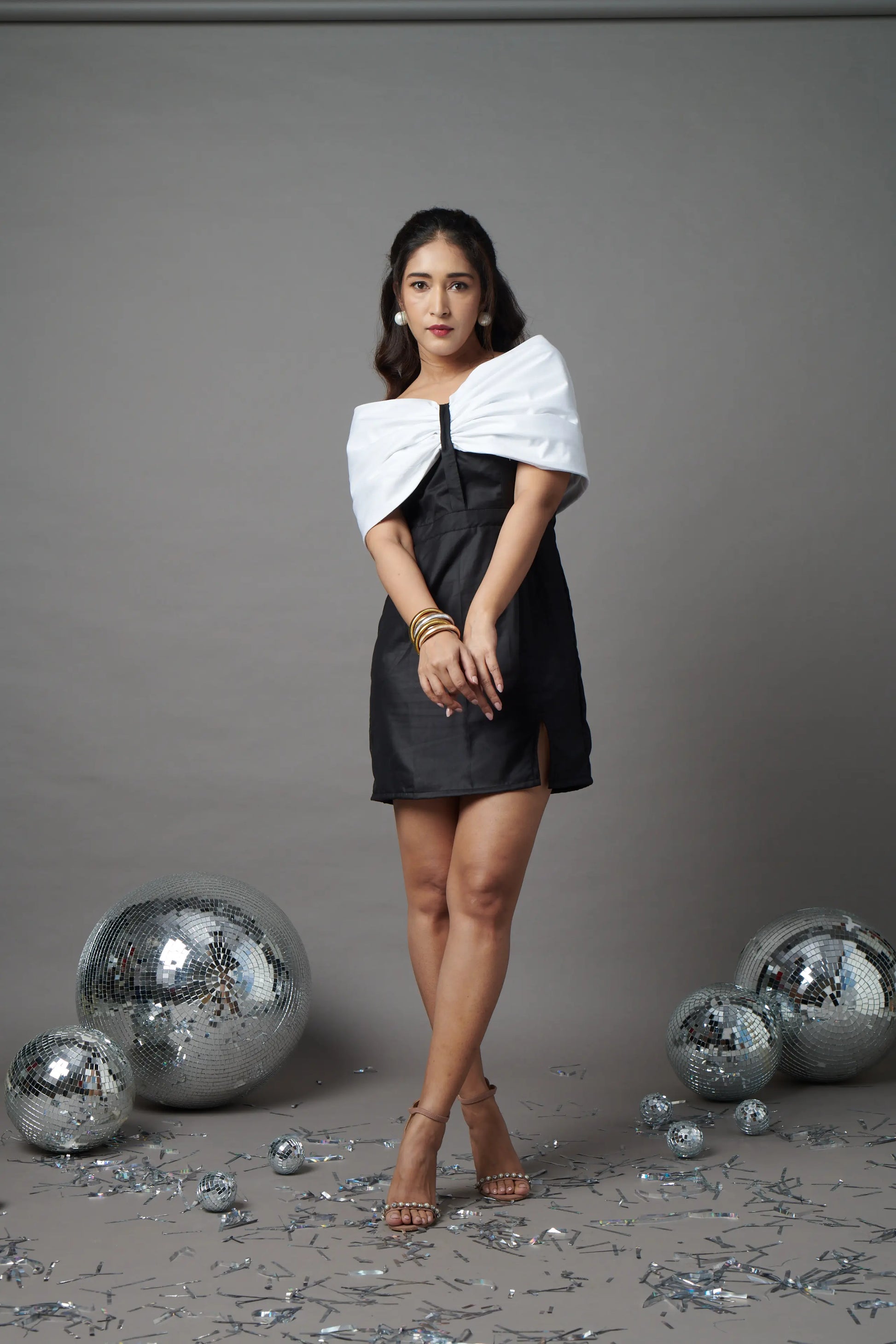 A fitted dress black in color with dramatic white bow like structure covering as sleeves as well.